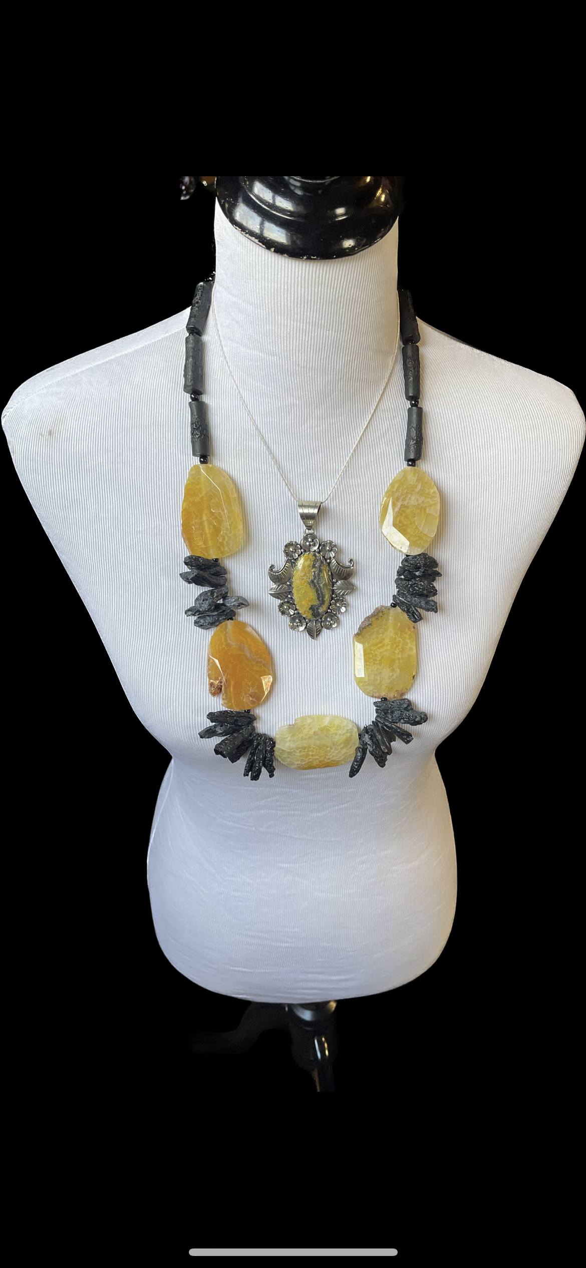Two different necklaces layered to create drama or worn individually to make their own statements of class. Check out these lovely one of a kind pieces!