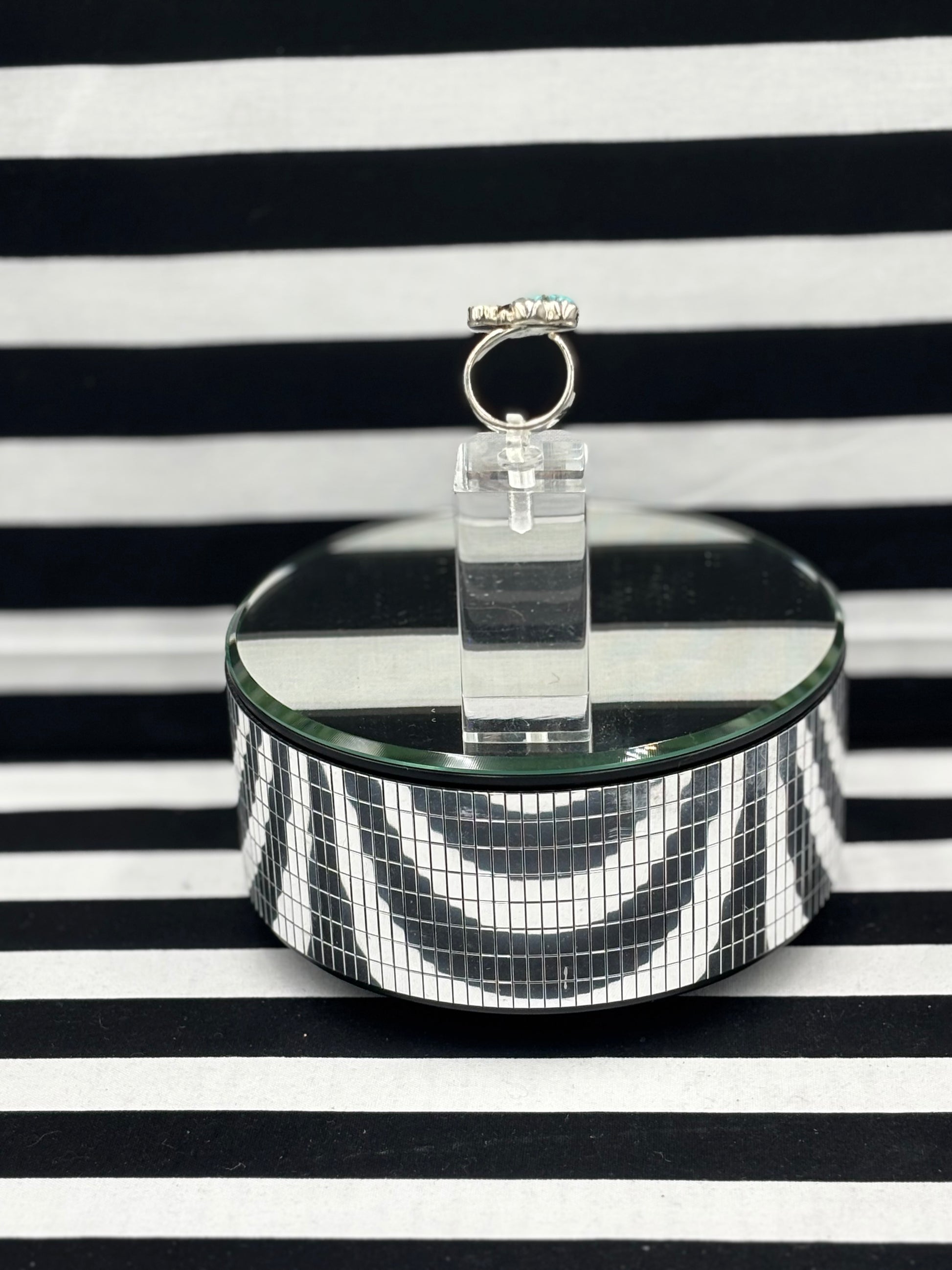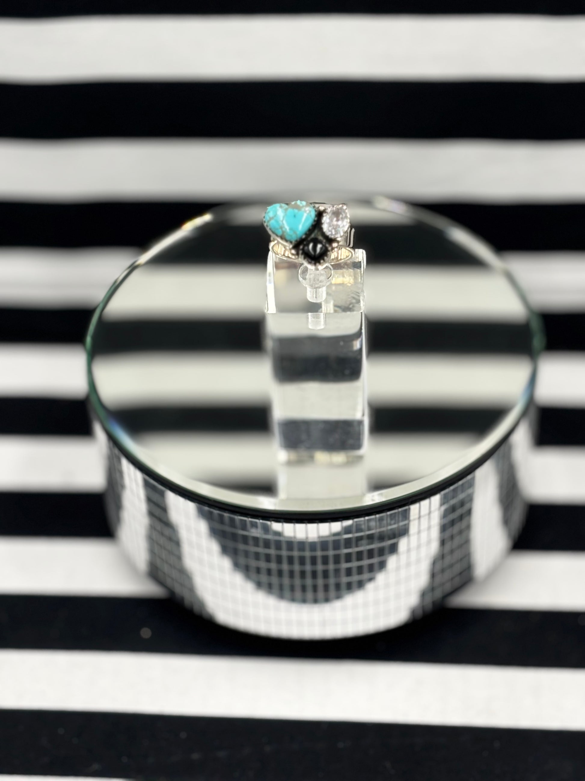 The Trio Time Ring is Adjustable and features a trio of turquoise black onyx and crystal stones in the perfect petite trio set is sterling silver with a thick adjustable band that you adjust to wear on a different finger every day of the week! This is KrushKandy.