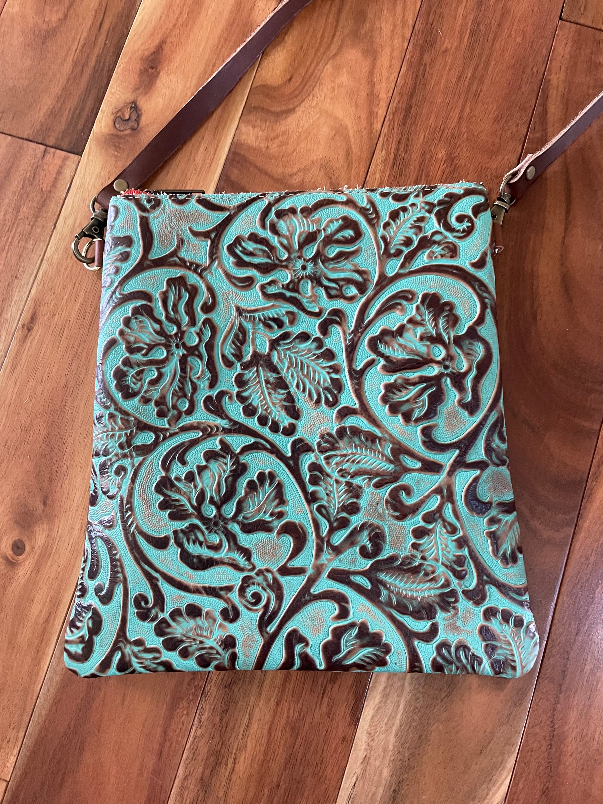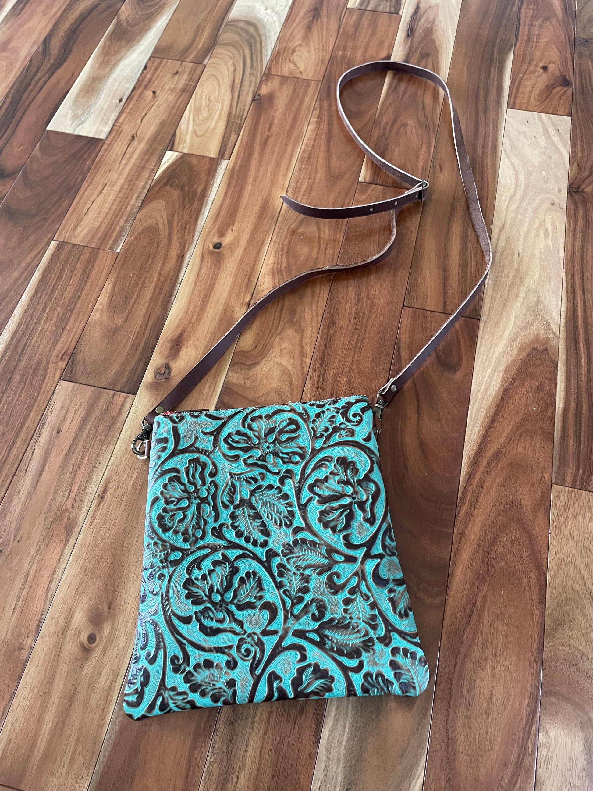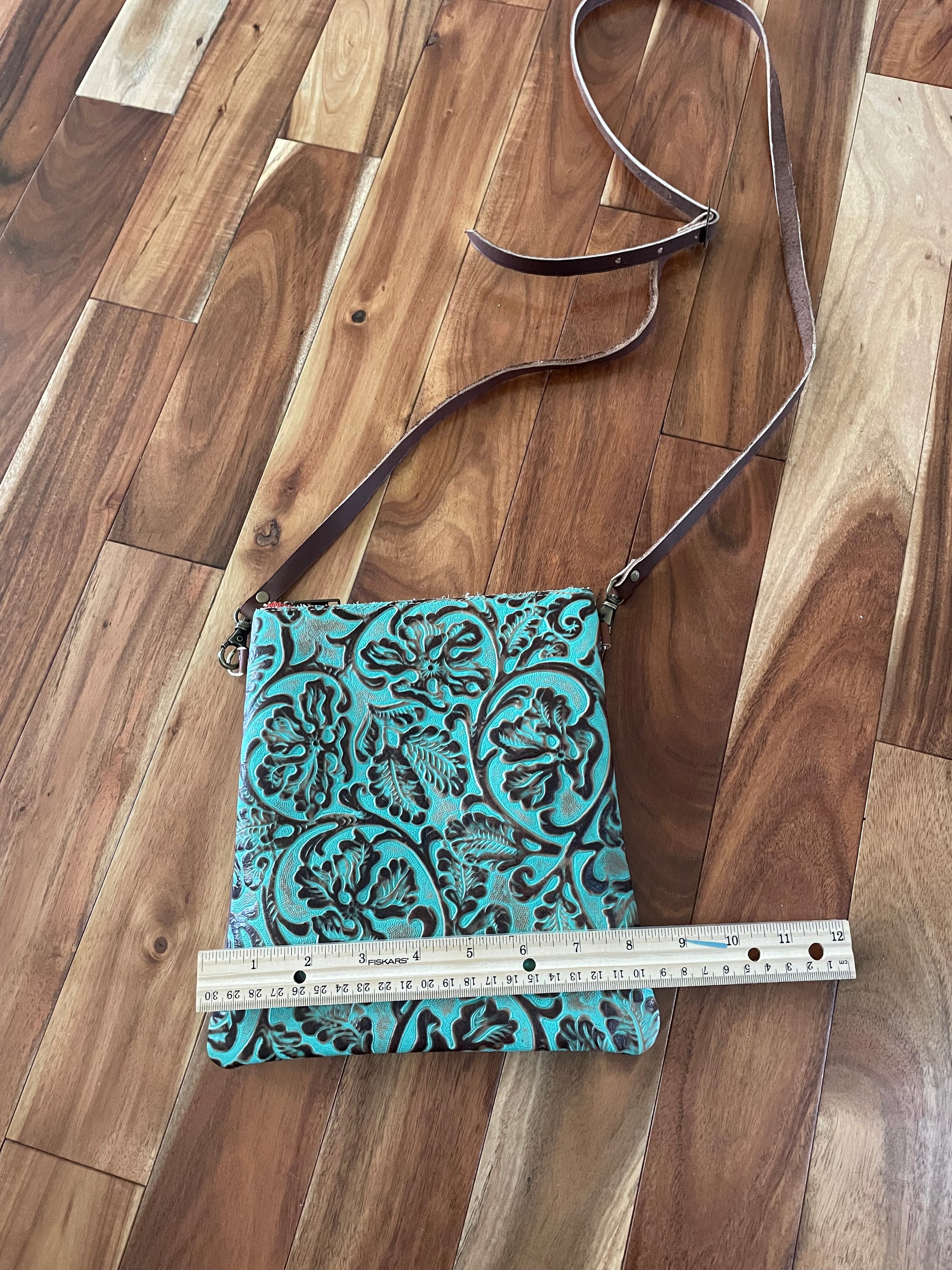 The Turquoise Tooled Crossbodh can be worn as a purse or a cross body with an adjustable strap. It is lightweight and this genuine leather bag is gorgeous and smells lovely!