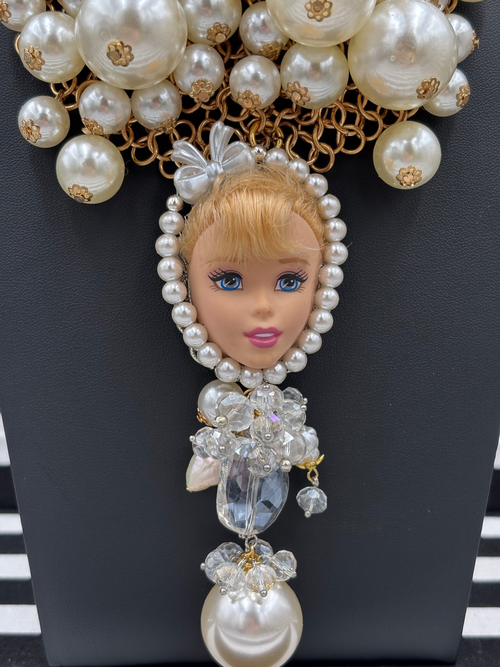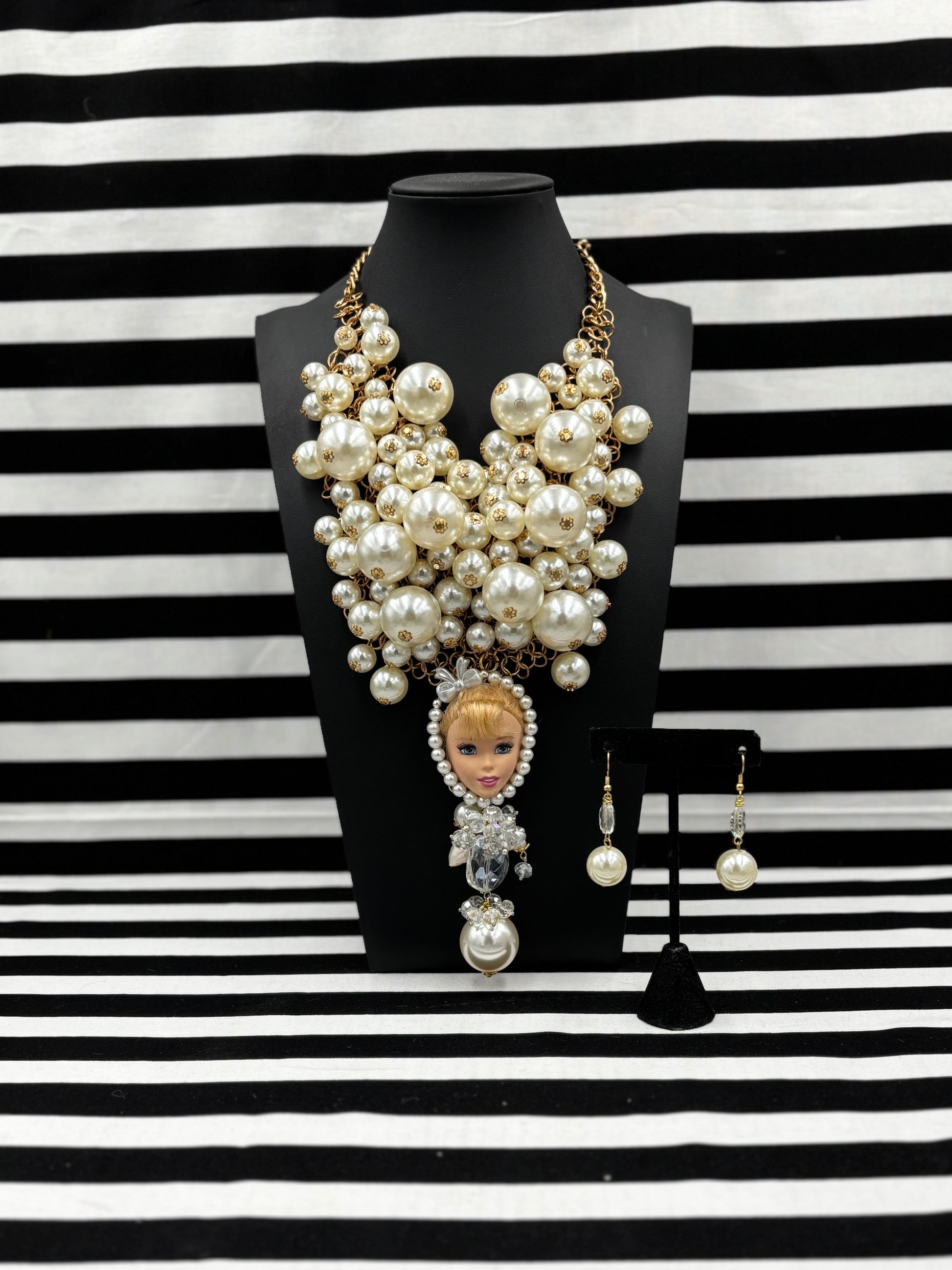 Pearly Girl Face Necklace is a show stopper conversation piece!  An ooolala one of a kind head turner! Well her head won’t turn!  This was made by hand and designed by Jennifer!
