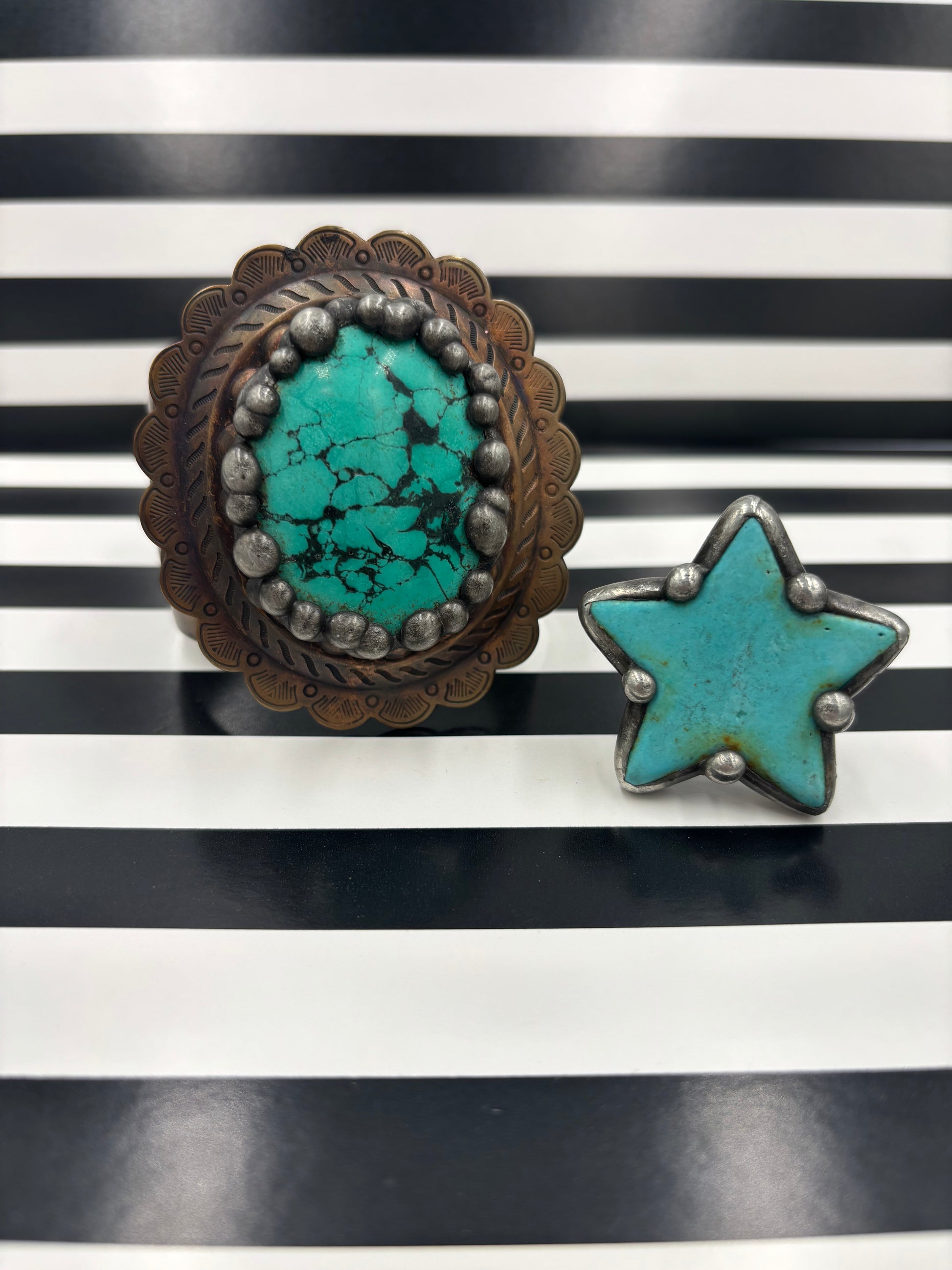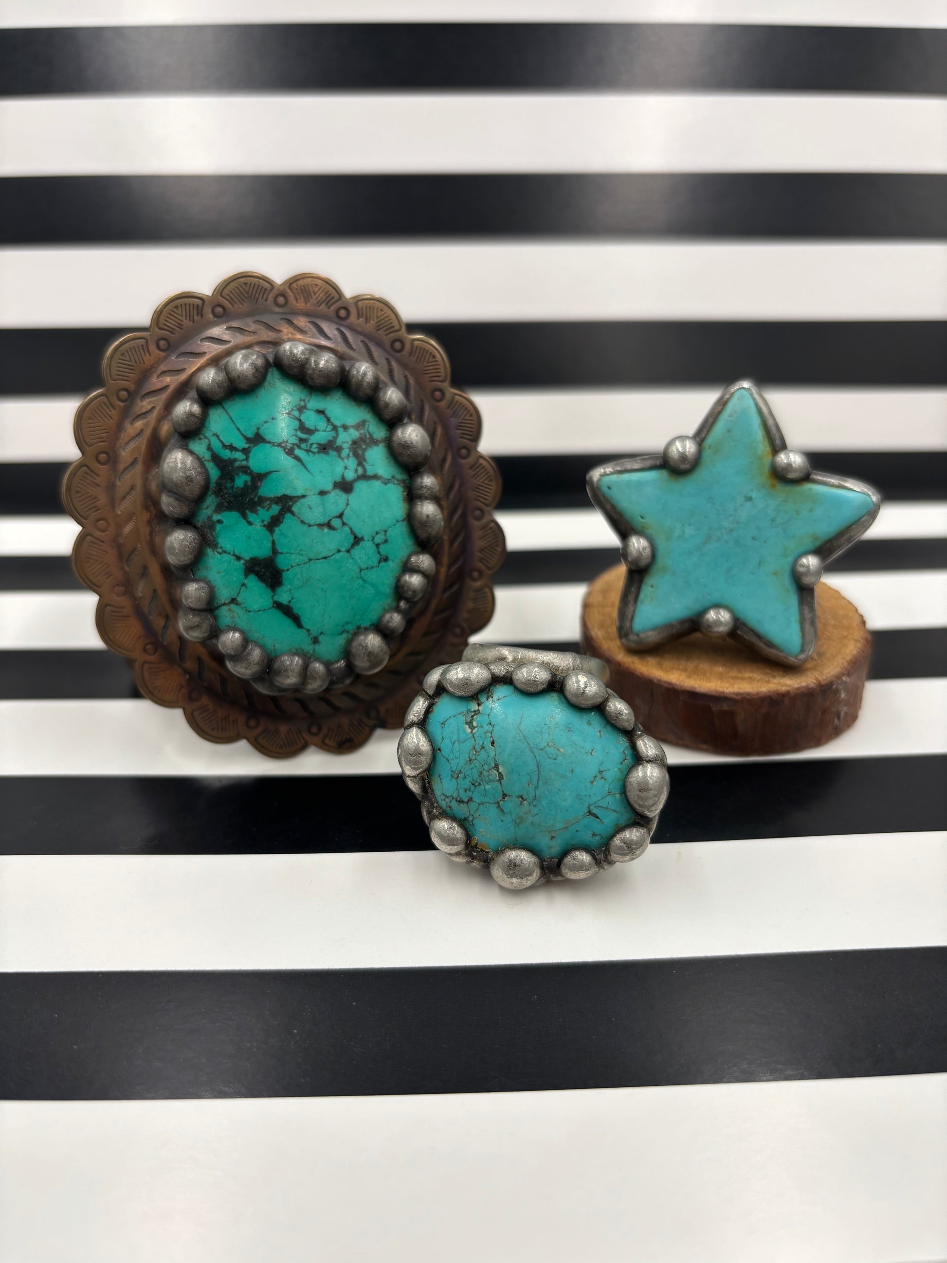 This piece was hand made by Art by Amy and is a beauty! It is shown with some of her other pieces the Hunk a Turquoise Cuff and the Turquoise Statement Spoon Ring