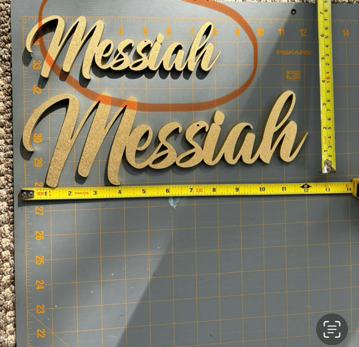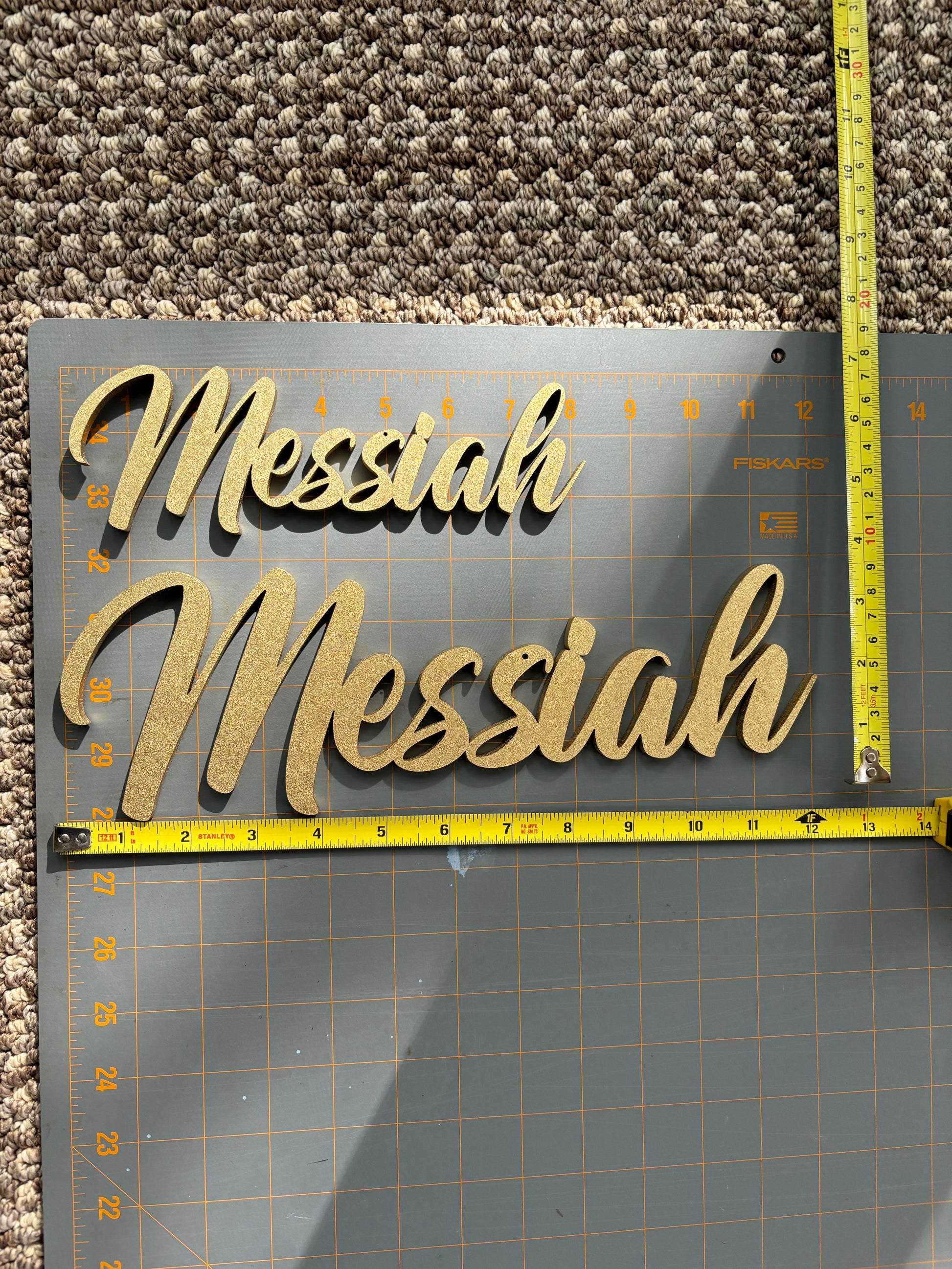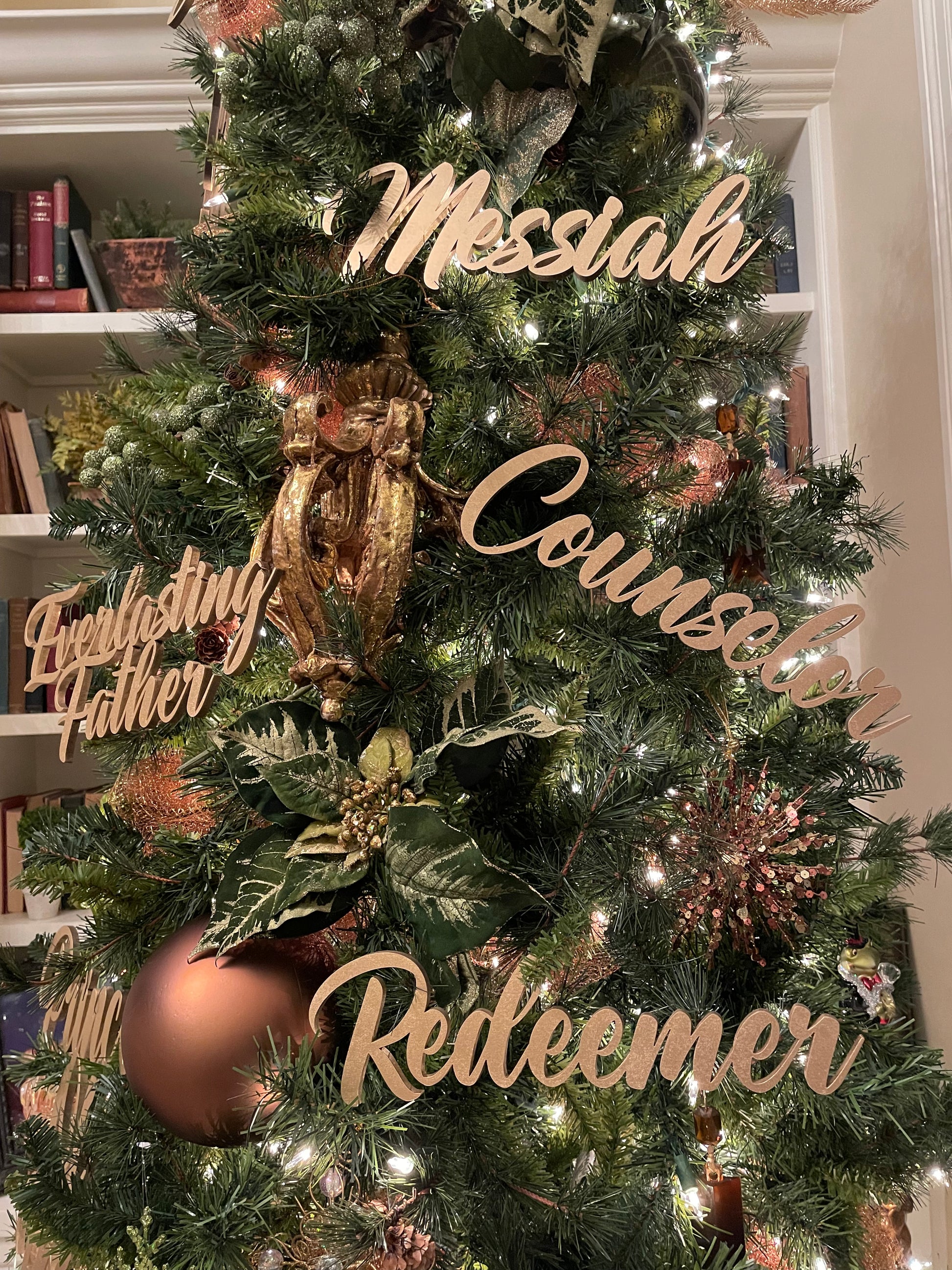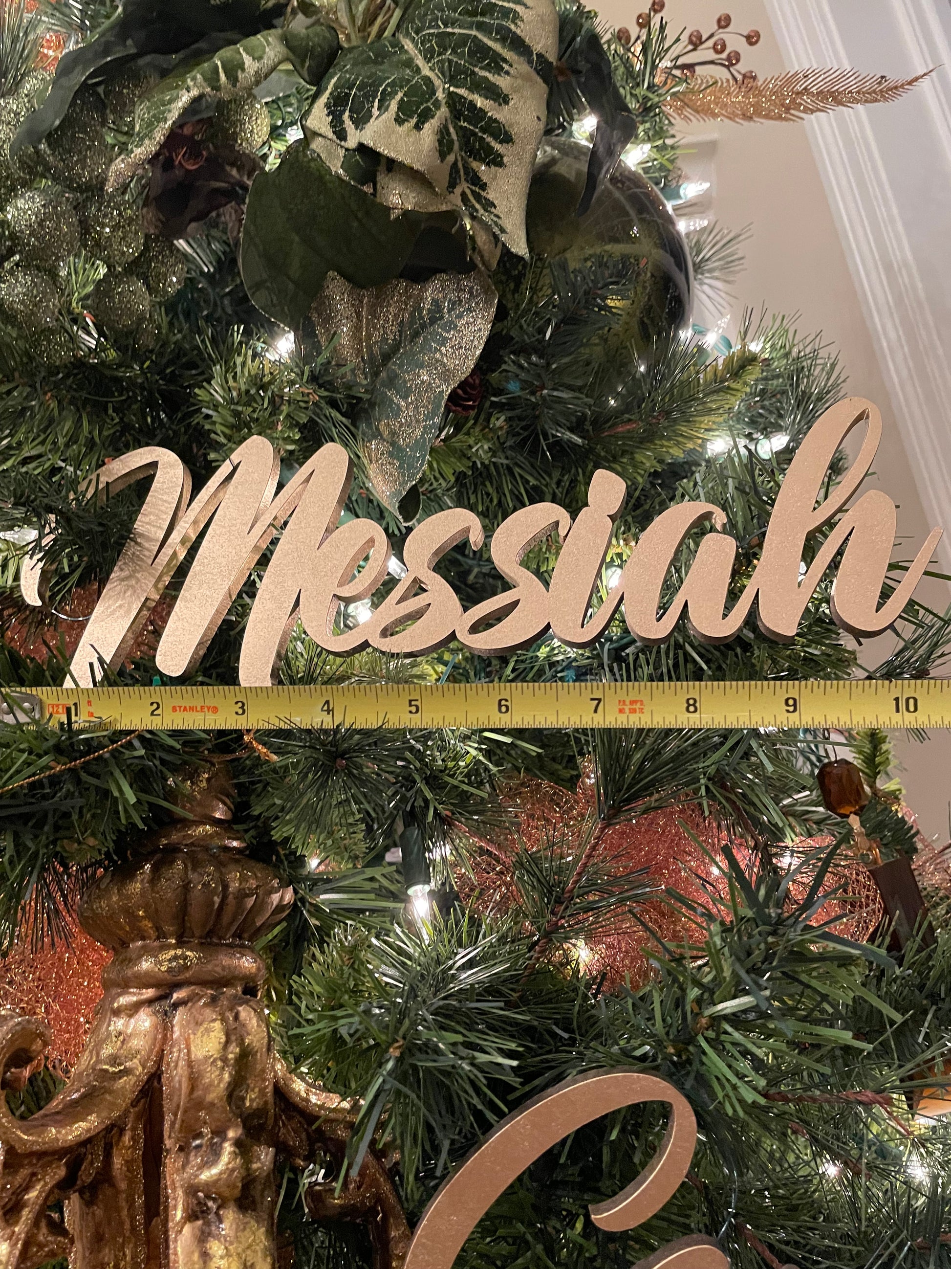Messiah Trio of Ornaments includes the 3 individual Ornaments in this collection of the Names of Messiah Trio Set are: Messiah, . They are currently available in Gold offered in 2 sizes. The sizes may vary slightly due to word length or with multiple words. Measurements shown in pictures listings. For picture references all names shown on the trees are the "grande size" and are shown as gold (on a 7 foot Christmas tree)This listing Messiah, Redeemer and Everlasting Father Trio Set of Ornaments pricing include 3 individual ornaments.