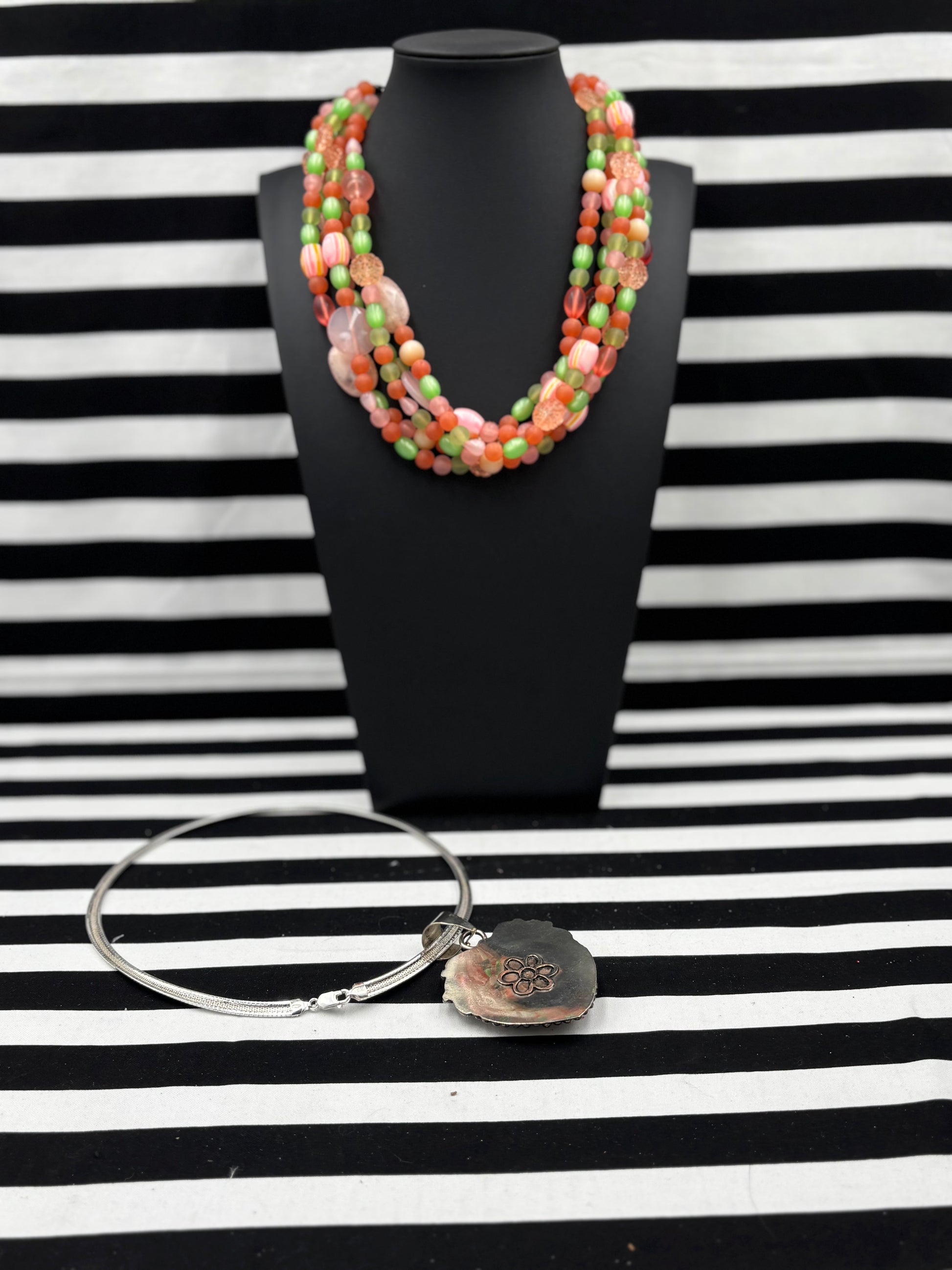 In the pictures in this description, the Carrots and Peas Necklace is layered with the Adorn by Jennifer Omega Necklace and the The Heart of the Matter Pendant -each sold separately.