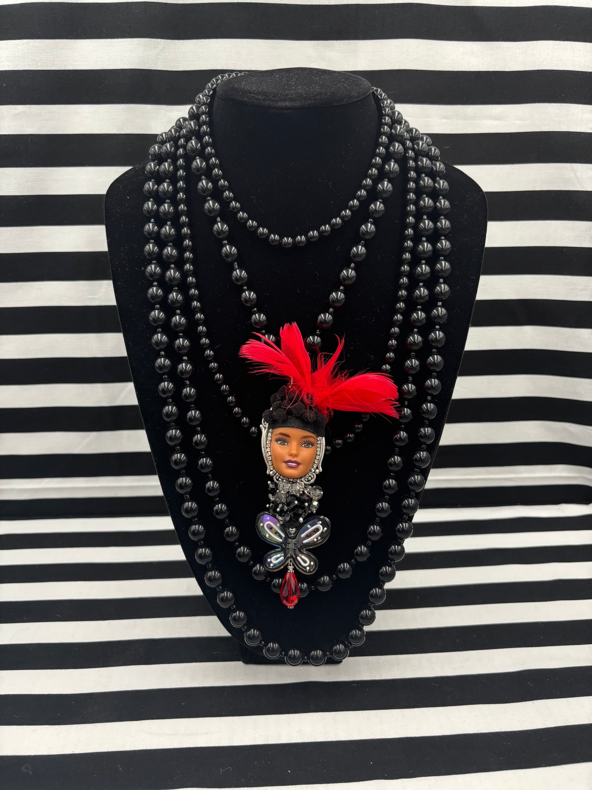 Ooh Lala Face Necklace is a show stopper conversation piece!  An ooolala one of a kind head turner! Well her head won’t turn!  This was made by hand and designed by Jennifer!