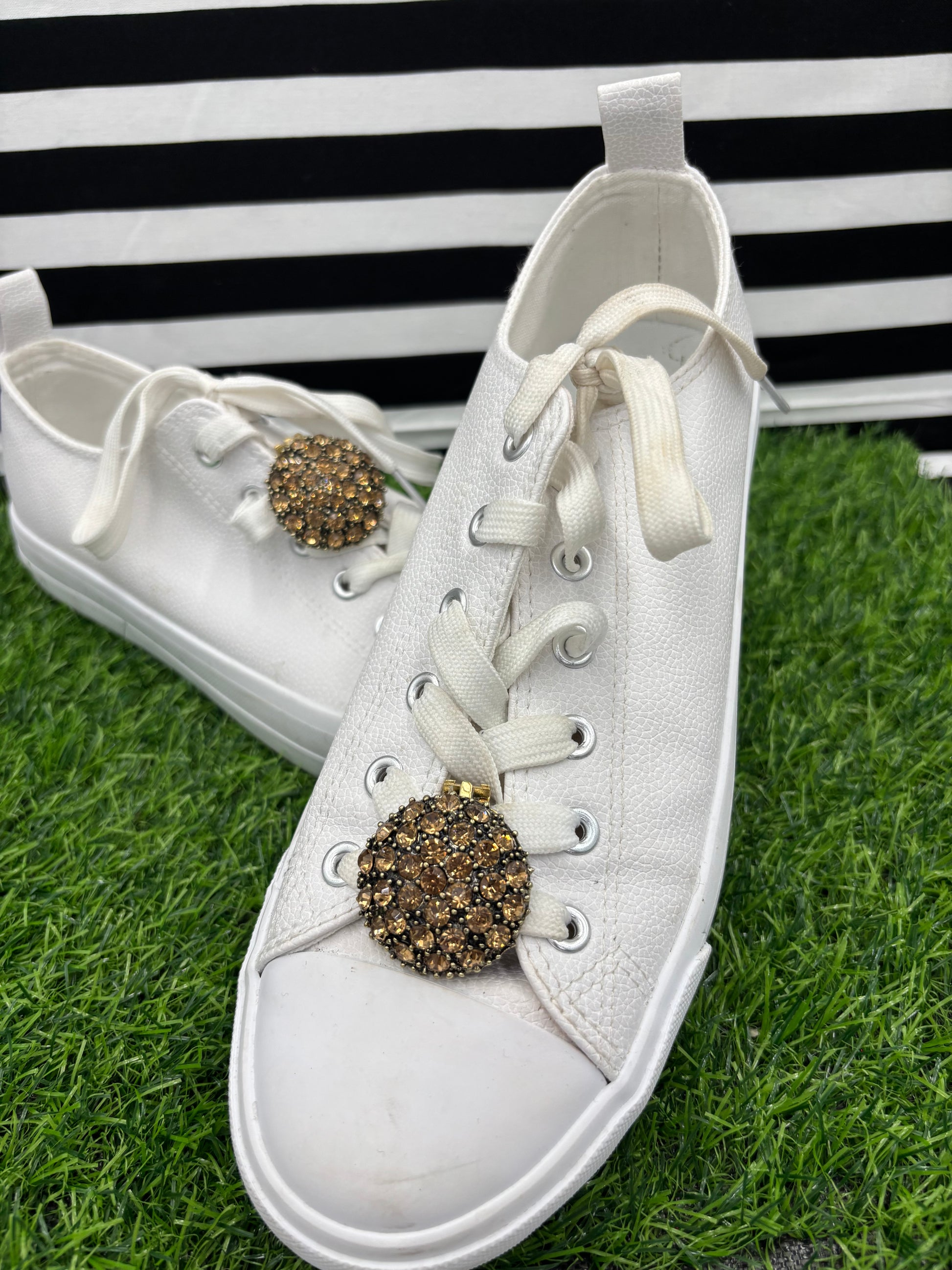 Golden Dome Shoe Clips that can clip to almost anything: purse, scarf, shirt, jacket, flip flop even home accessories like a lampshade! Takes something ordinary and “Adorn” it to something extraordinary! Mix and match for fun a fashion! 2 Golden Dome Shoe Clips Included in Order *Shoes not included. Please wear clips with care as they may pop off with movement-particularly on rubber flip flops*