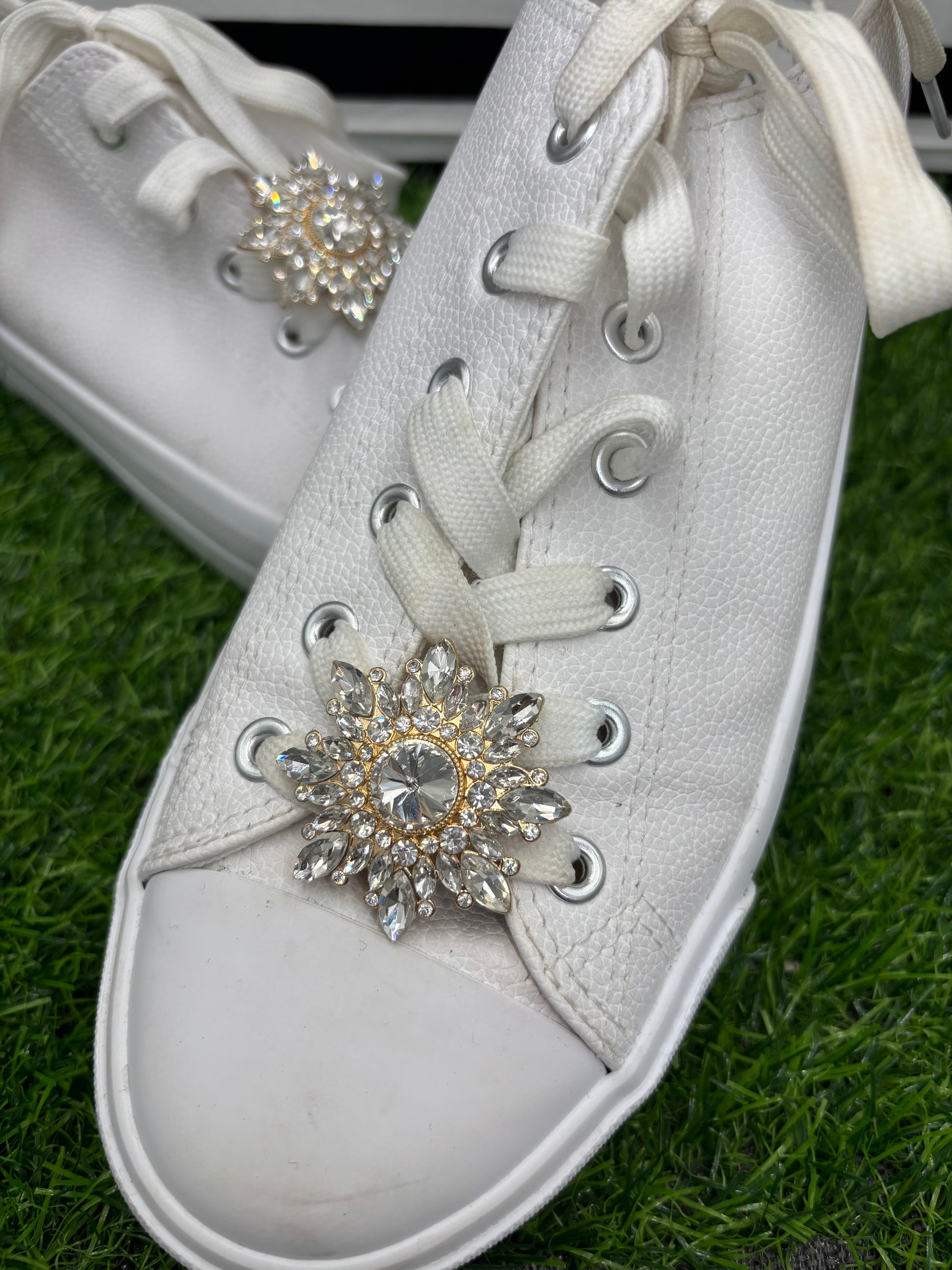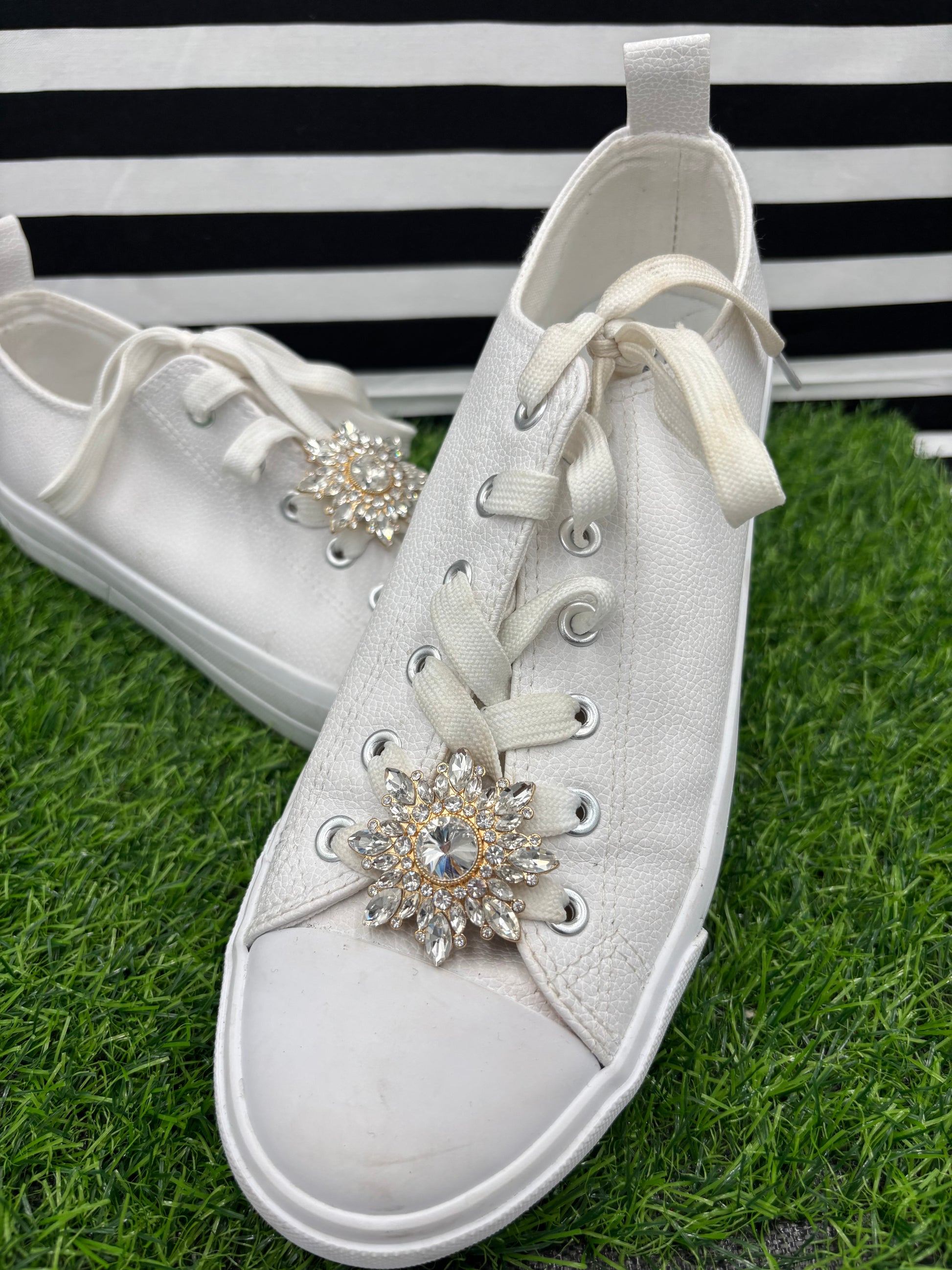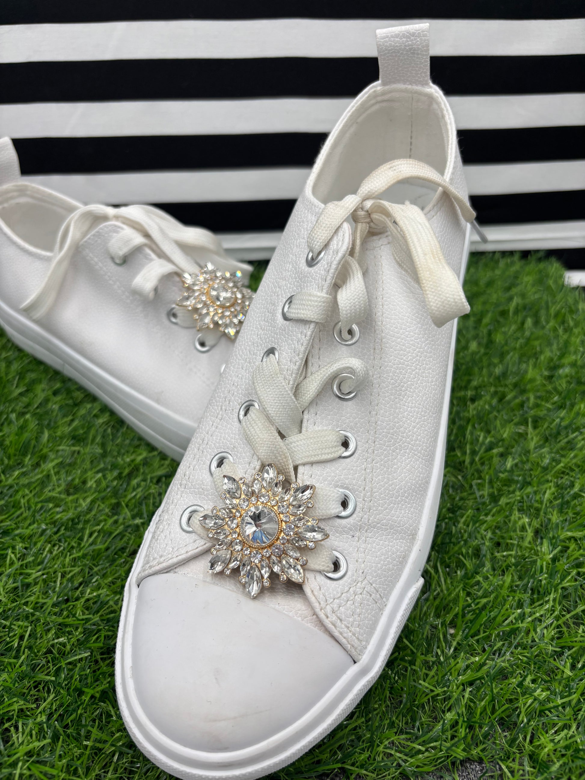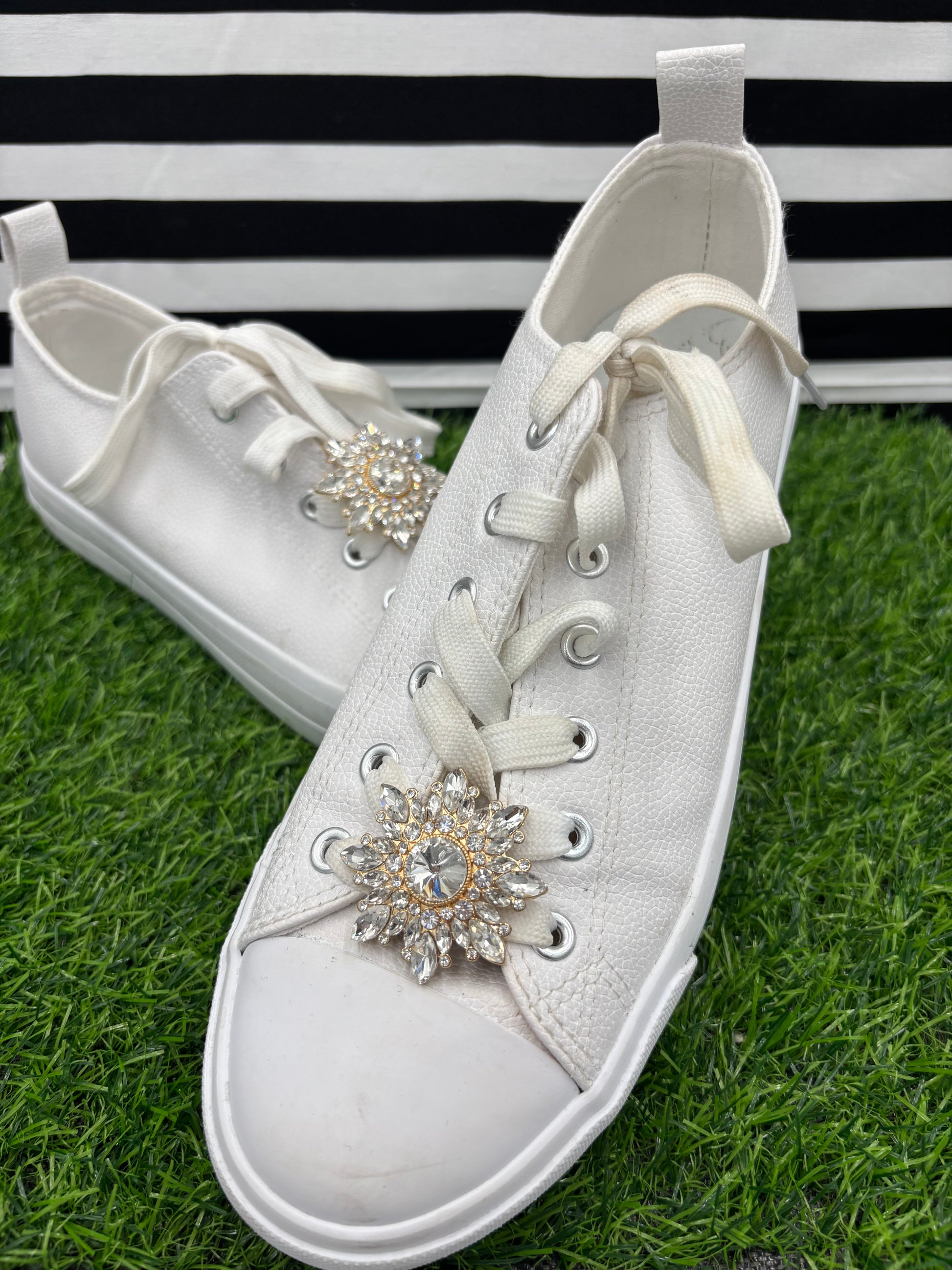 Golden Flurry Shoe Clips that can clip to almost anything: purse, scarf, shirt, jacket, flip flop even home accessories like a lampshade! Takes something ordinary and “Adorn” it to something extraordinary! Mix and match for fun a fashion! 2 Golden Flurry Shoe Clips Included in Order *Shoes not included. Please wear clips with care as they may pop off with movement-particularly on rubber flip flops*
