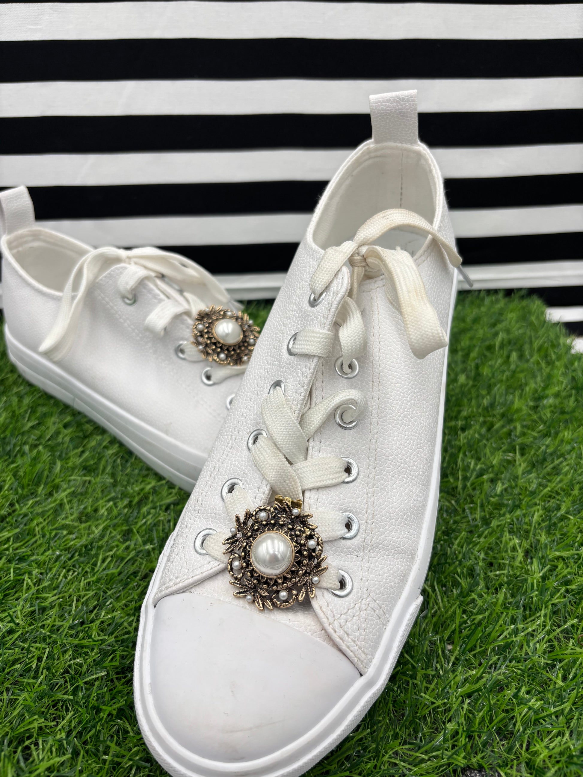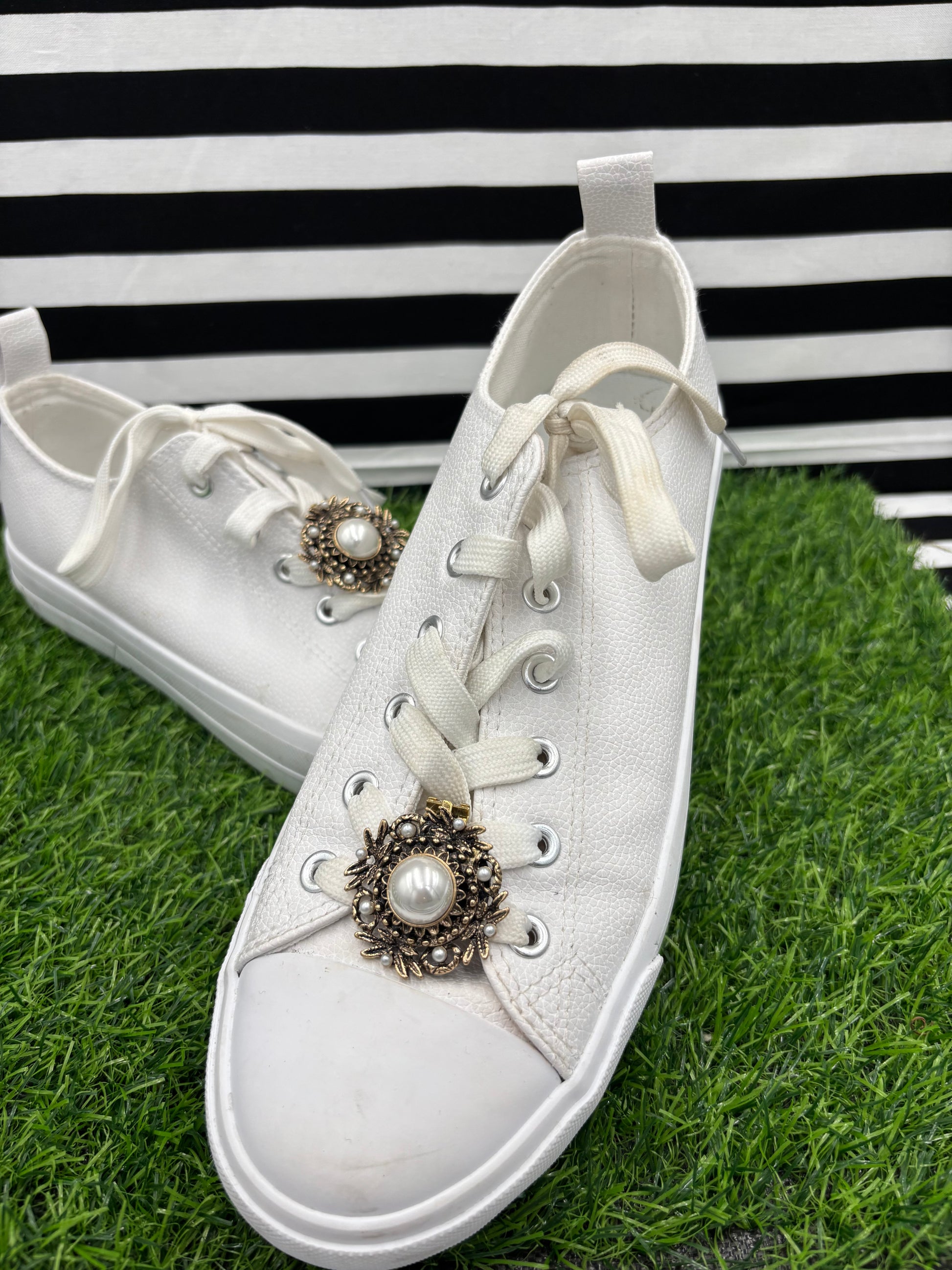 Vintage Pearl Shoe Clips that can clip to almost anything: purse, scarf, shirt, jacket, flip flop even home accessories like a lampshade! Takes something ordinary and “Adorn” it to something extraordinary! Mix and match for fun a fashion! 2 Vintage Pearl Shoe Clips Included in Order *Shoes not included. Please wear clips with care as they may pop off with movement-particularly on rubber flip flops*