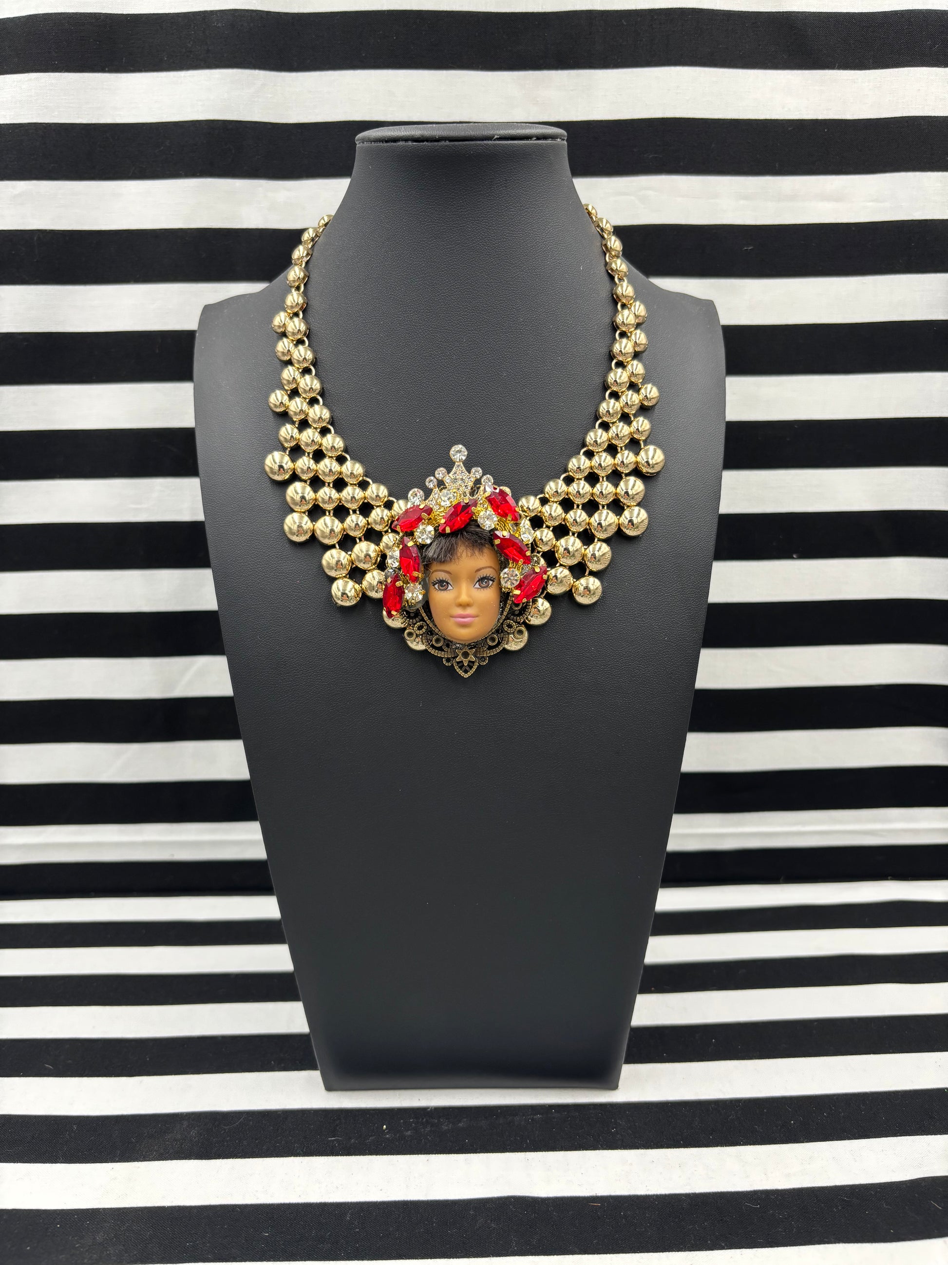Face of the East Necklace is a show stopper conversation piece! An ooolala one of a kind head turner! Well her head won’t turn! This was made by hand and designed by Jennifer!