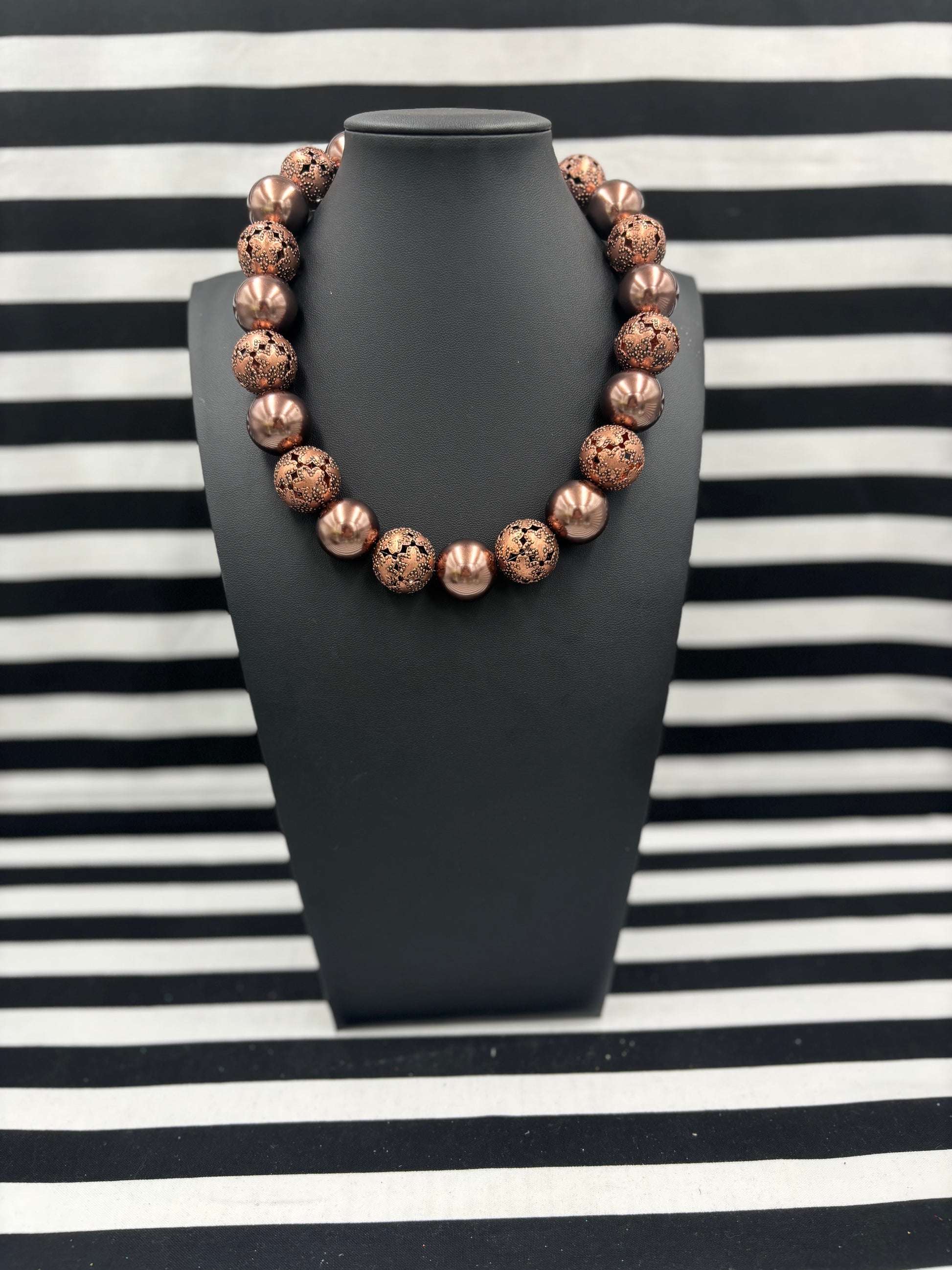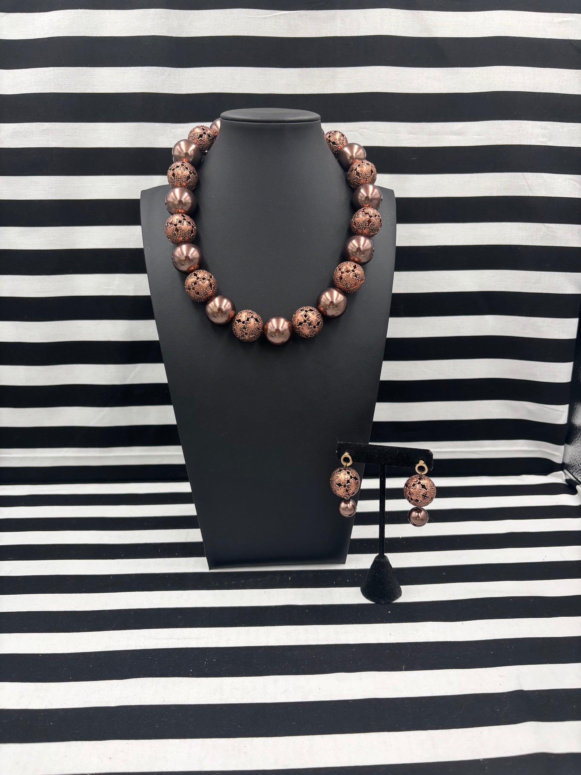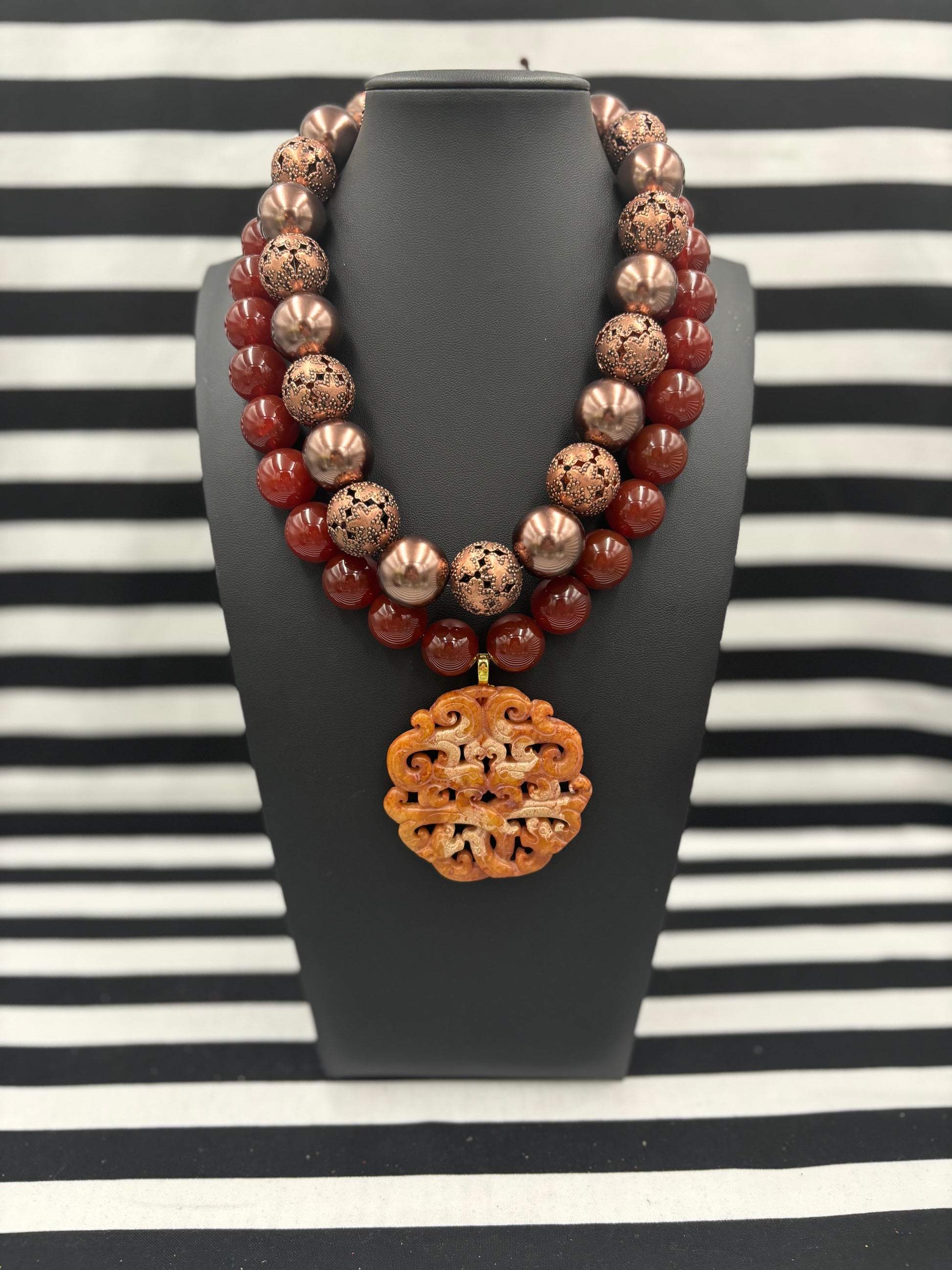 The Copper Clapped Beauty Necklace is a gorgeous statement necklace that layers well with others but stands well on its own as well. It is shown layered with the pictures Seal of Carnelian Necklace. A variety of earrings look great with these too like the Seal of Carnelian Earrings and the Chiefs Kingdom Earrings