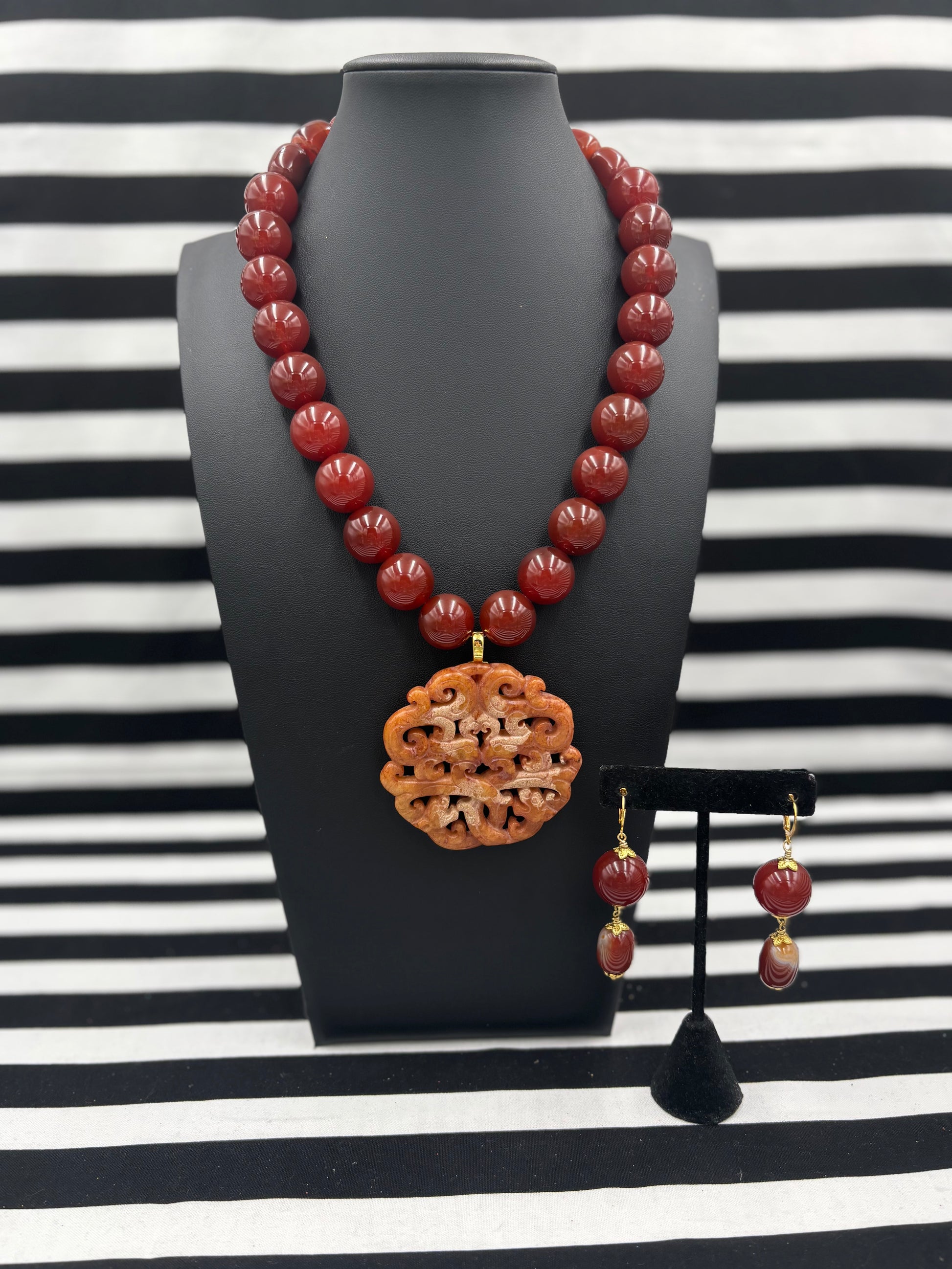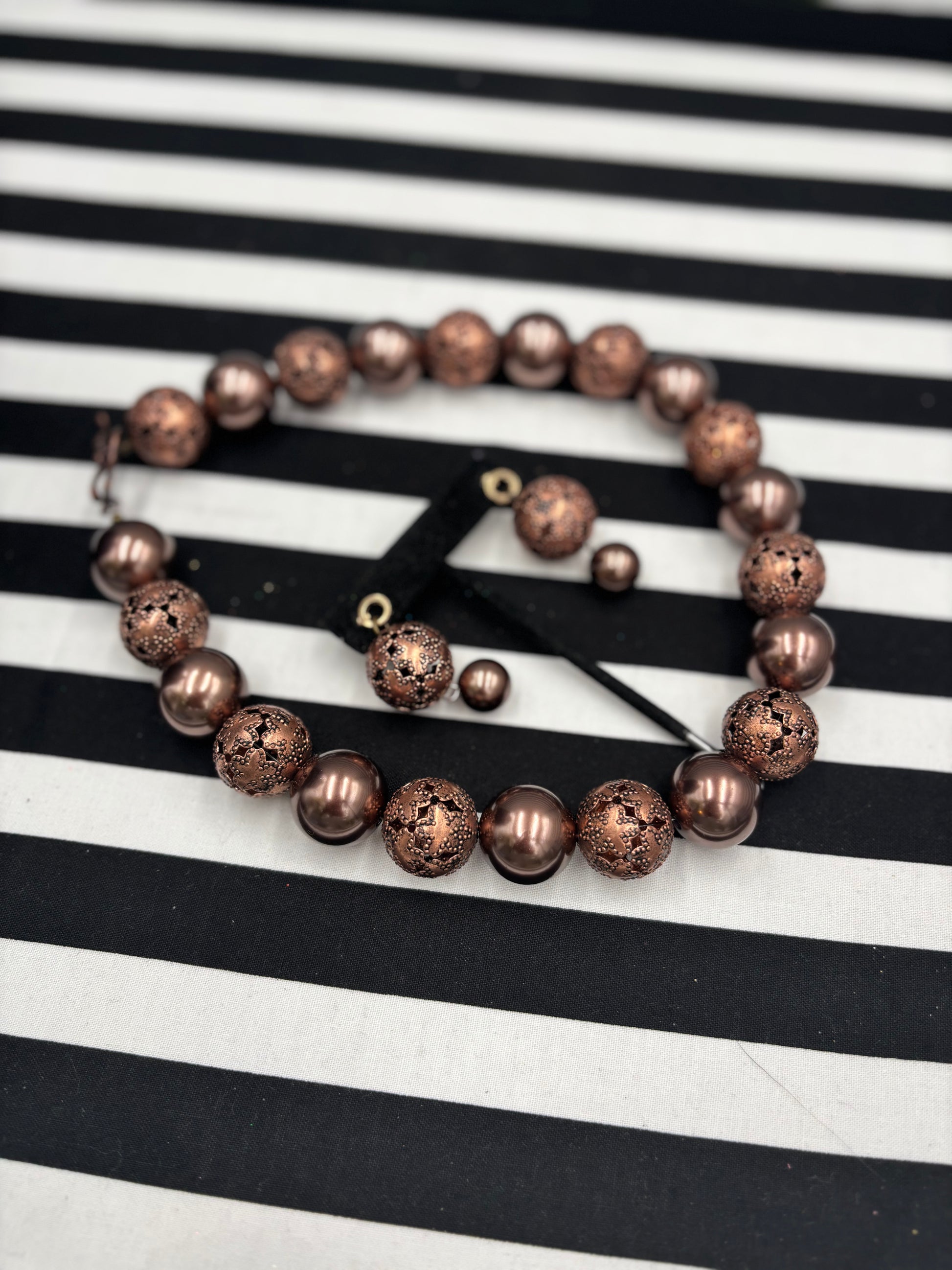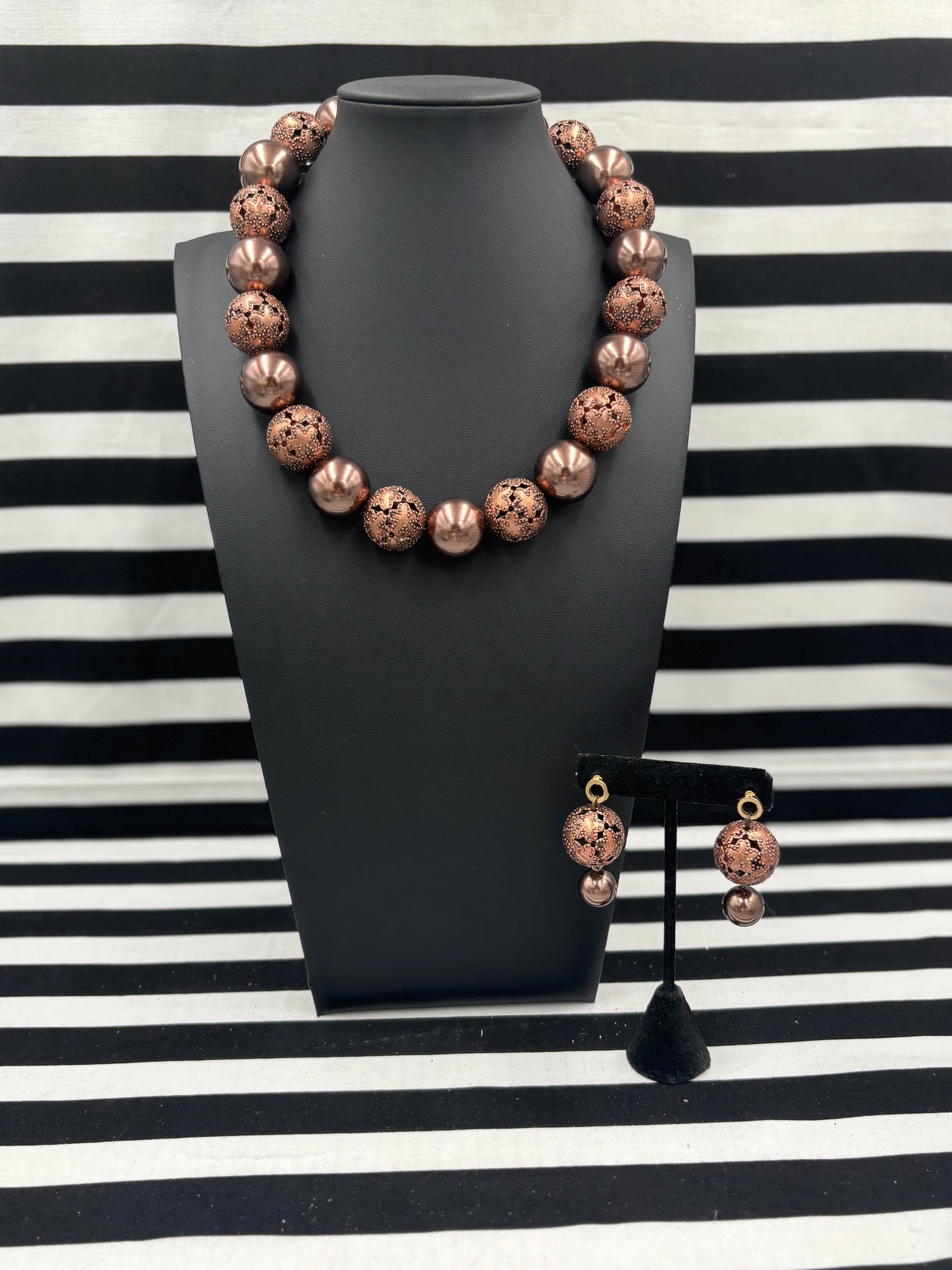The Copper Clapped Beauty Necklace is a gorgeous statement necklace that layers well with others but stands well on its own as well. It is shown layered with the pictures Seal of Carnelian Necklace. A variety of earrings look great with these too like the Seal of Carnelian Earrings and the Chiefs Kingdom Earrings