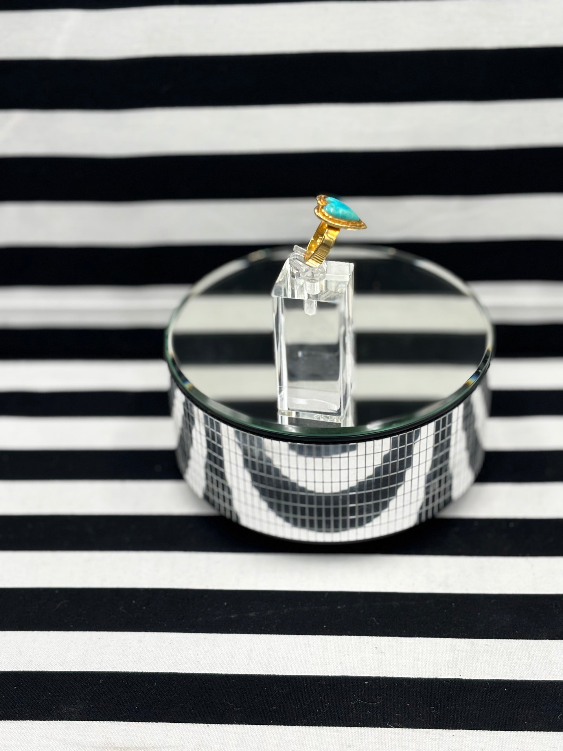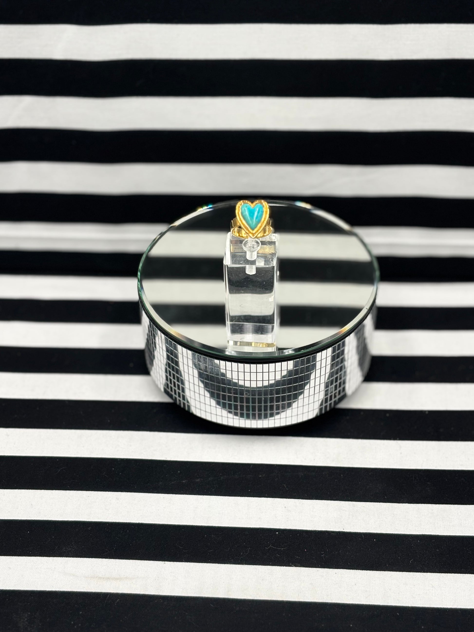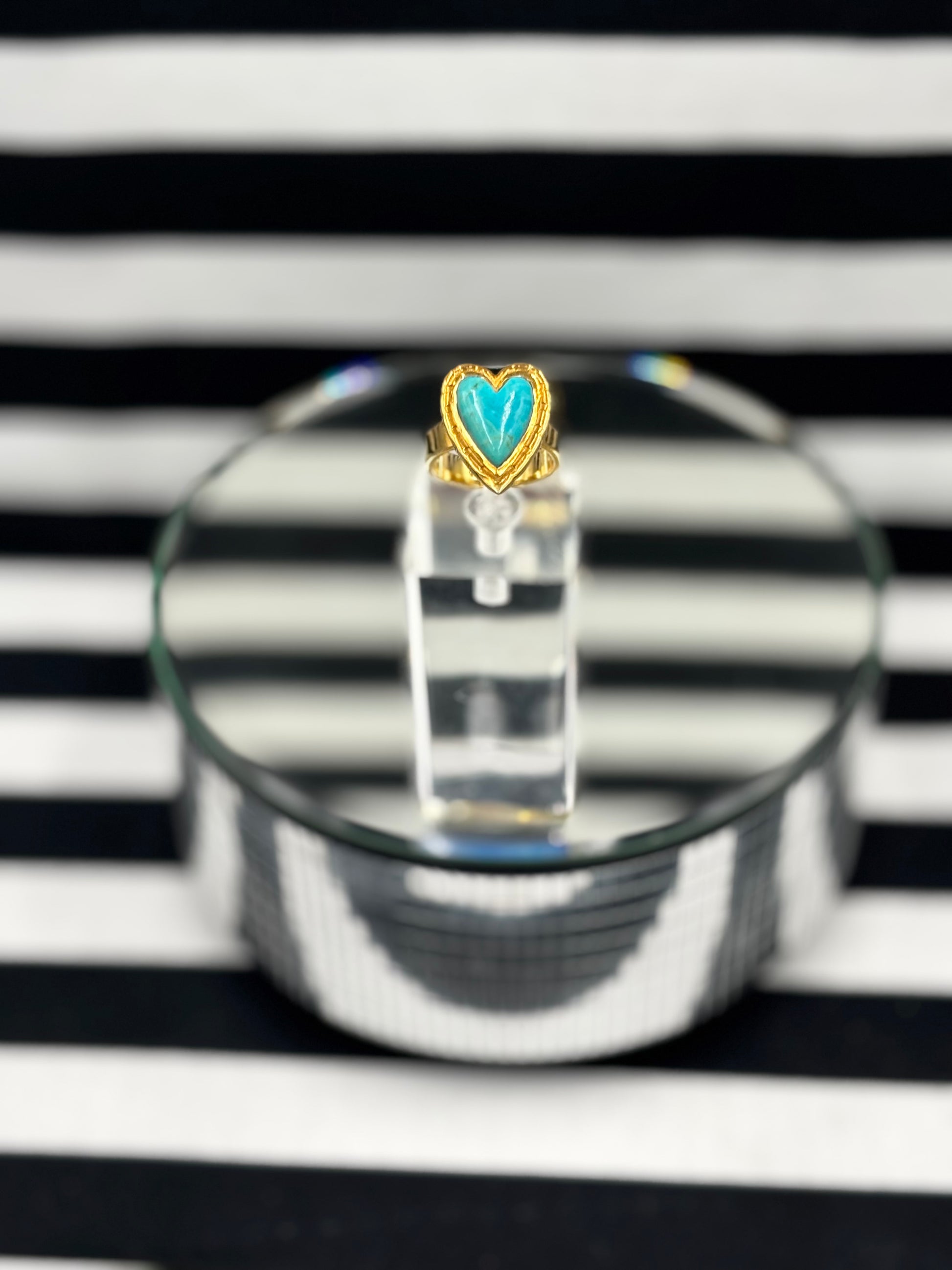 Golden Heart Ring Adjustable and features a turquoise heart in sterling silver dipped in plated gold with a thick adjustable band that you adjust to wear on a different finger every day of the week! This is KrushKandy.
