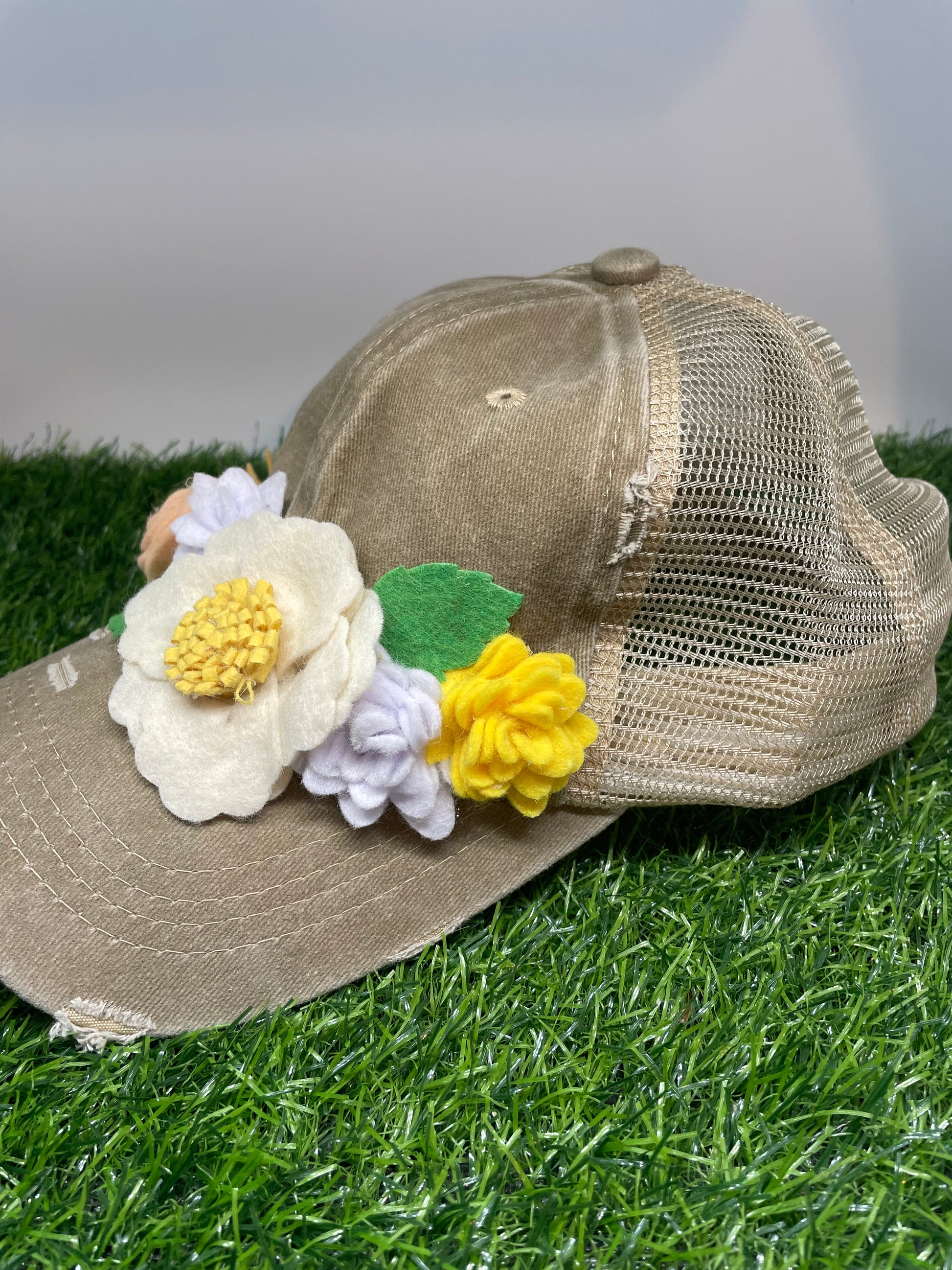 Each embellishment is handmade one of a kind placed on a vintage looking worn baseball hat with an adjustable backing and features the Adorn by Jennifer logo on back! Wear this with pride when you don't have time to do your hair or even when you do because it's will bring a smile to everyone you see!