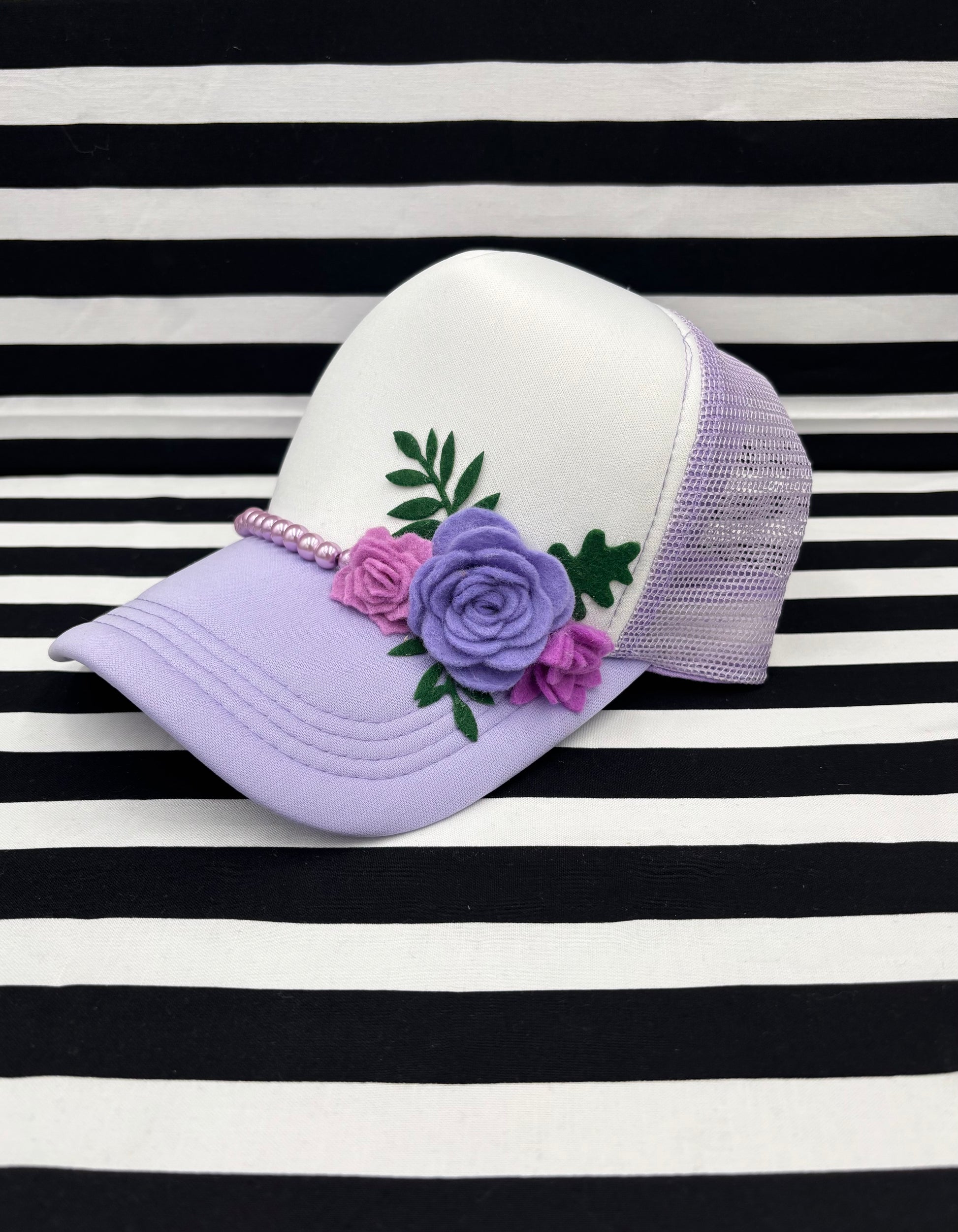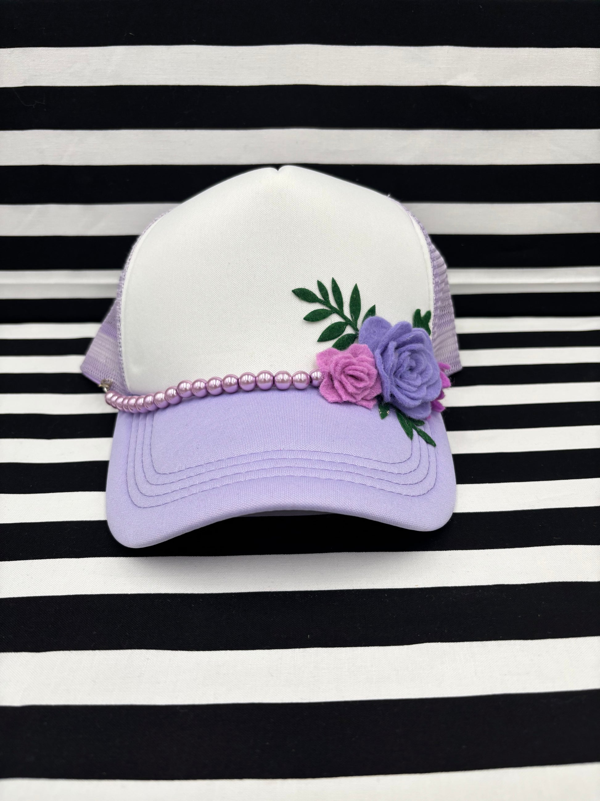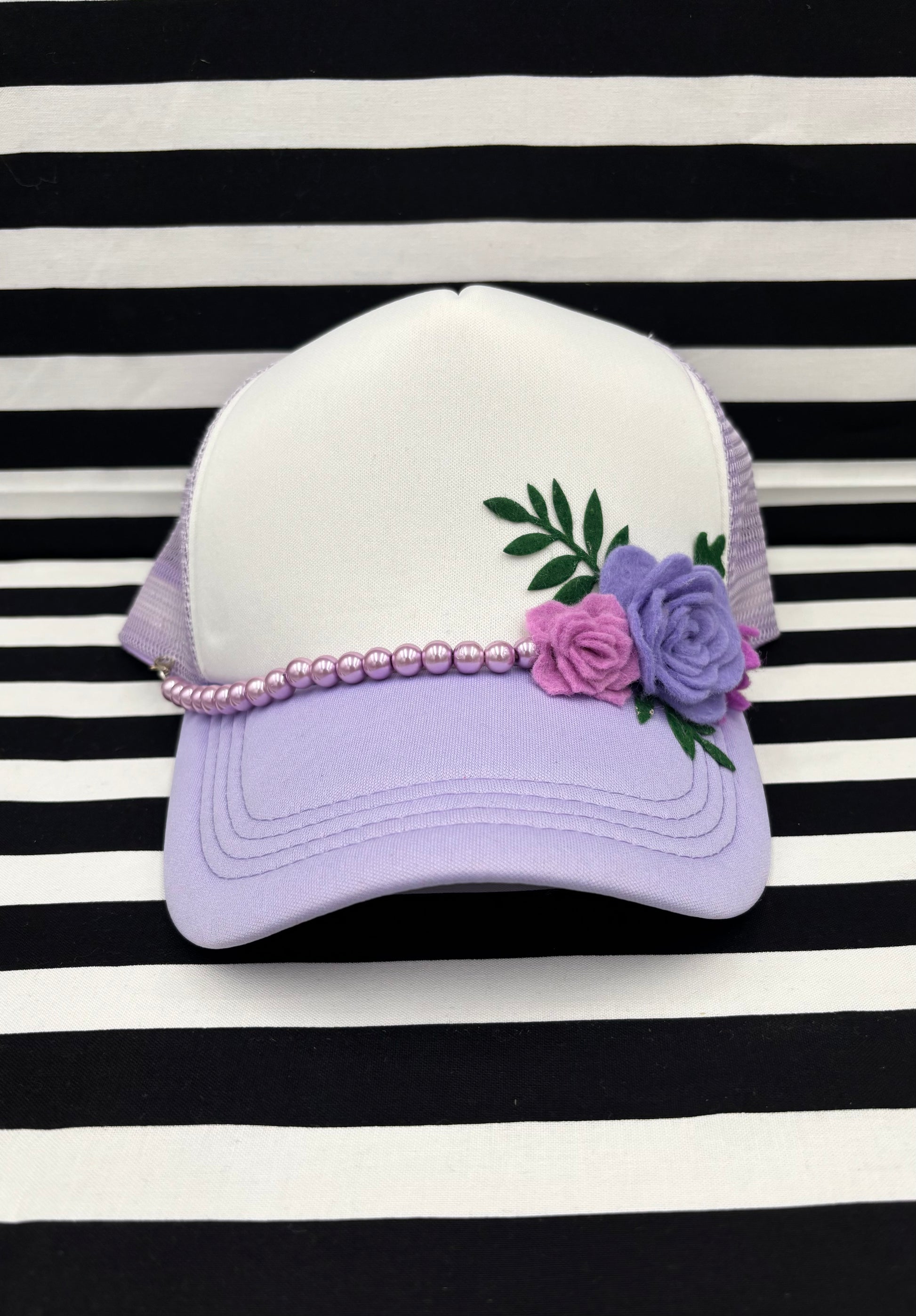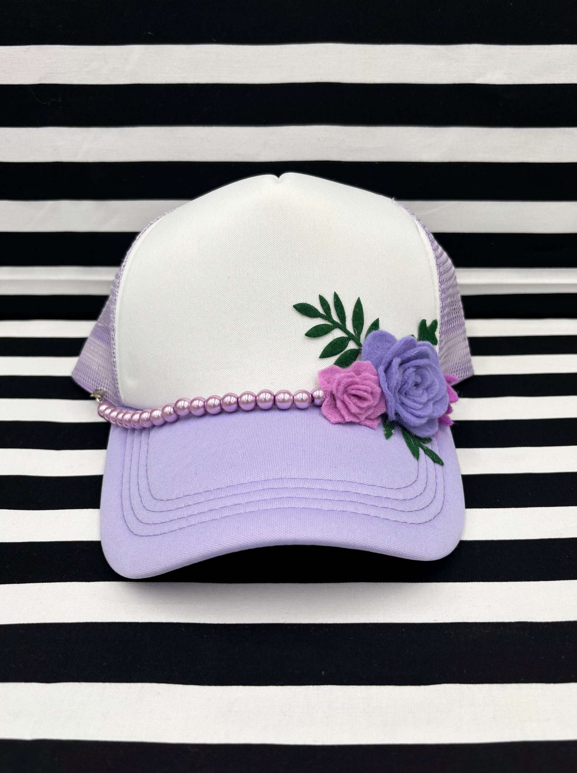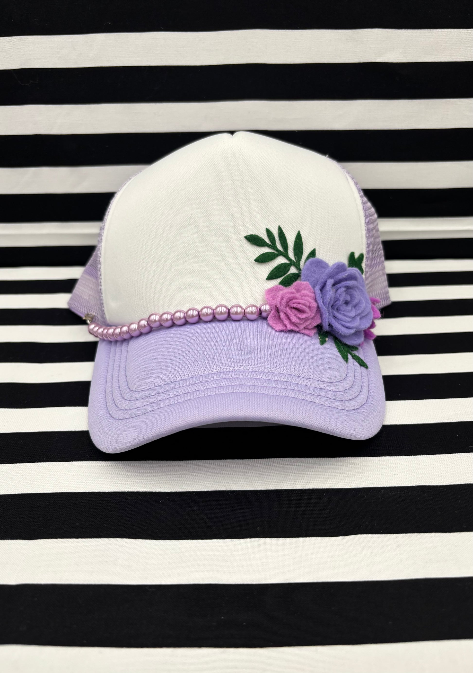 Violet Bouquet Trucker Hat each embellishment is handmade one of a kind placed on a lightweight trucker hat with an adjustable backing and features the Adorn by Jennifer logo on back! Wear this with pride when you don't have time to do your hair or even when you do because it will bring a smile to everyone you see!