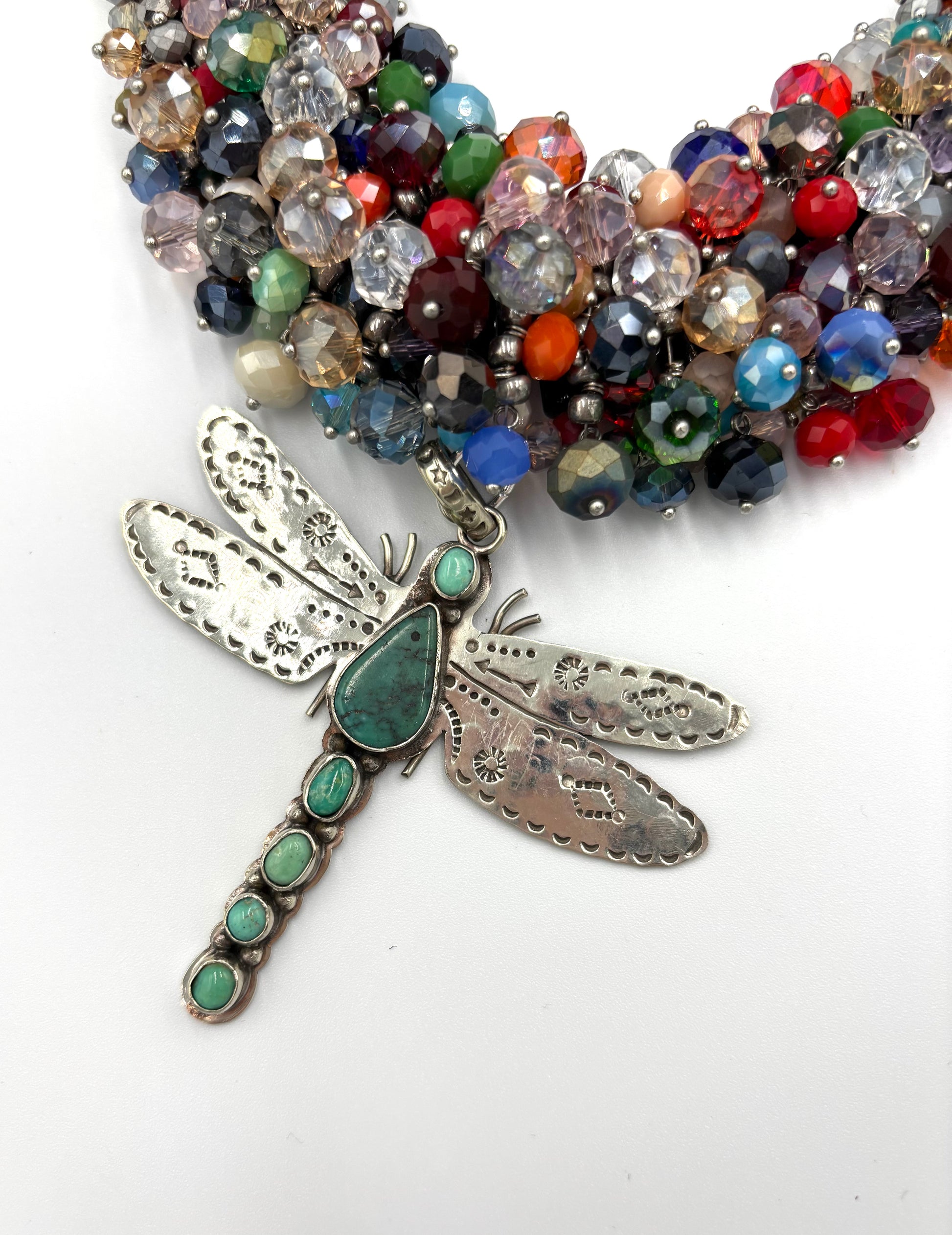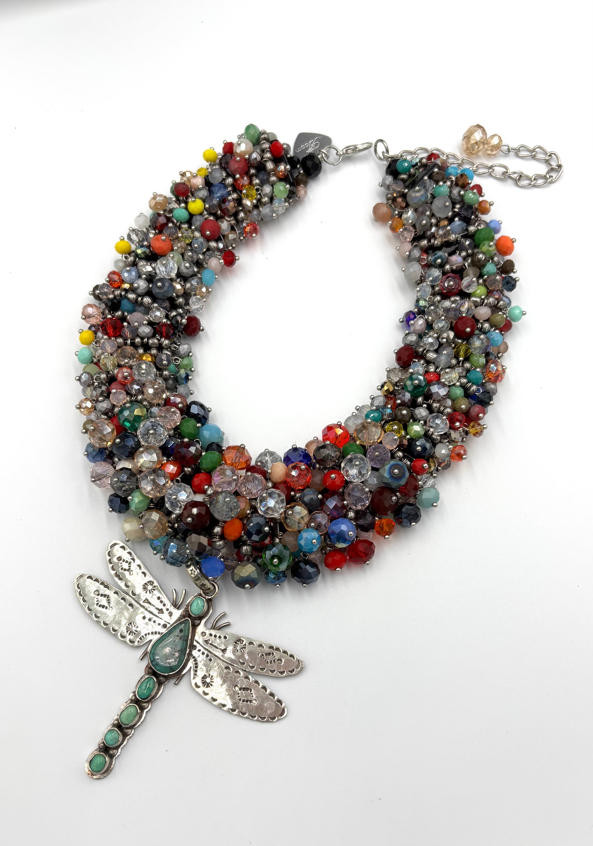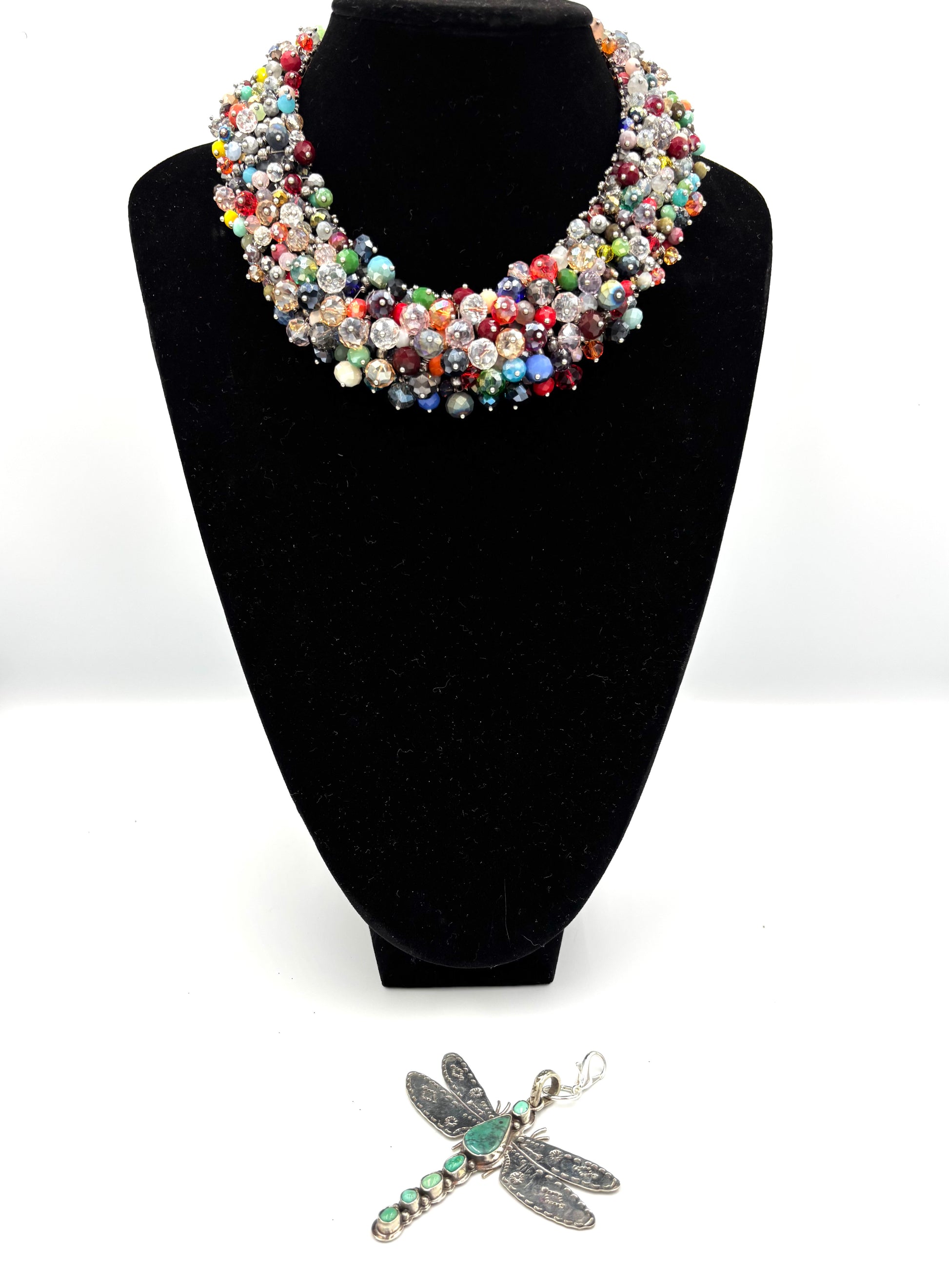 This multicolored statement necklace has some lighthearted suprises as the lovely elements of a pendant dragonfly set the tone! It actually has a lobster claw that allows you to remove the pendant so you can not only wear this necklace multiple ways, you can swap out your pendant for another and you can wear this playful pendant with other necklaces as well! Adorn by Jennifer loves to offer multifunctional options so you can wear your Adorn-a-ments in as many ways as your imagination can take you! Snag this one of a kind pendant necklace combo up! You will love how the colors play well to dress up or go casual!