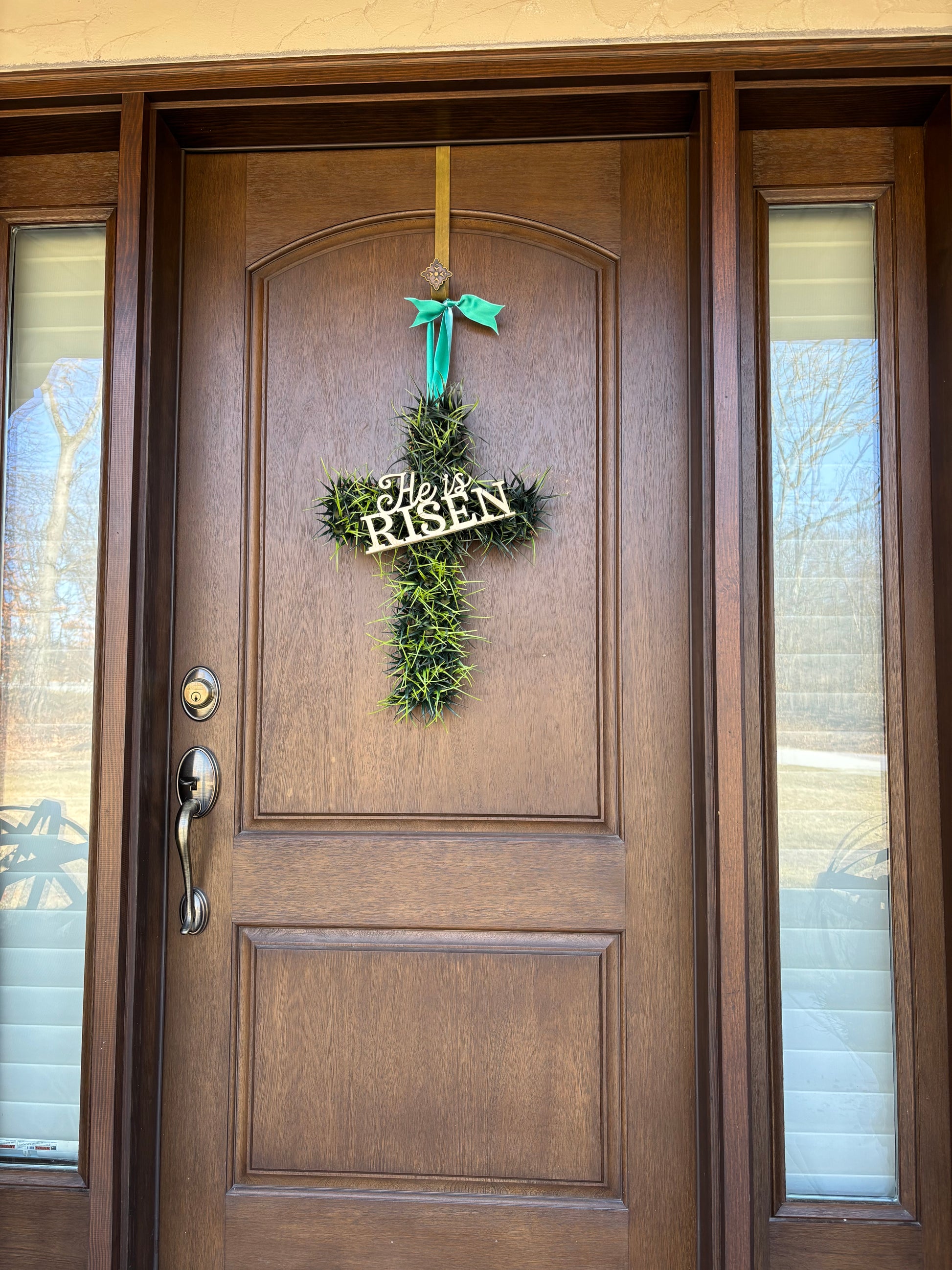 This beautiful cross can be used on your front door to display for all to see the true reason for celebrating Easter it can also be used to display on the wall all year long! Adorn by Jennifer specializes in multifunctional uses so this has a fun bonus feature! The He is Risen sign can slide off easily and be used as a Christmas ornament (which compliments the Adorn Names of Jesus Line!) and then you just slide it back on your cross when you want to use it for the cross display! Measurements: Cross: 14x20 inches Text: 10x5 inches