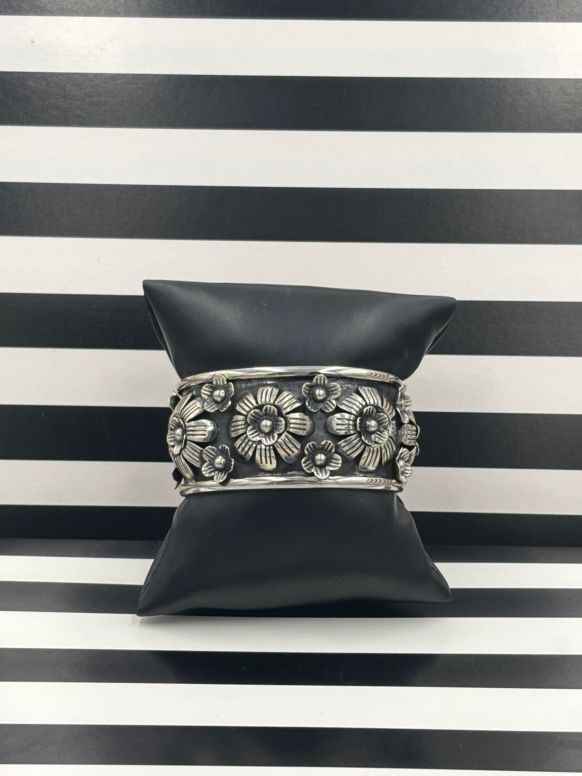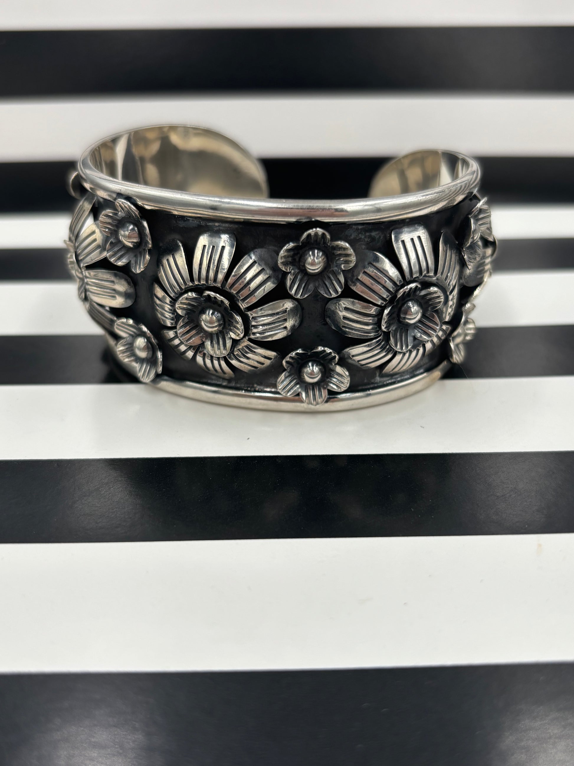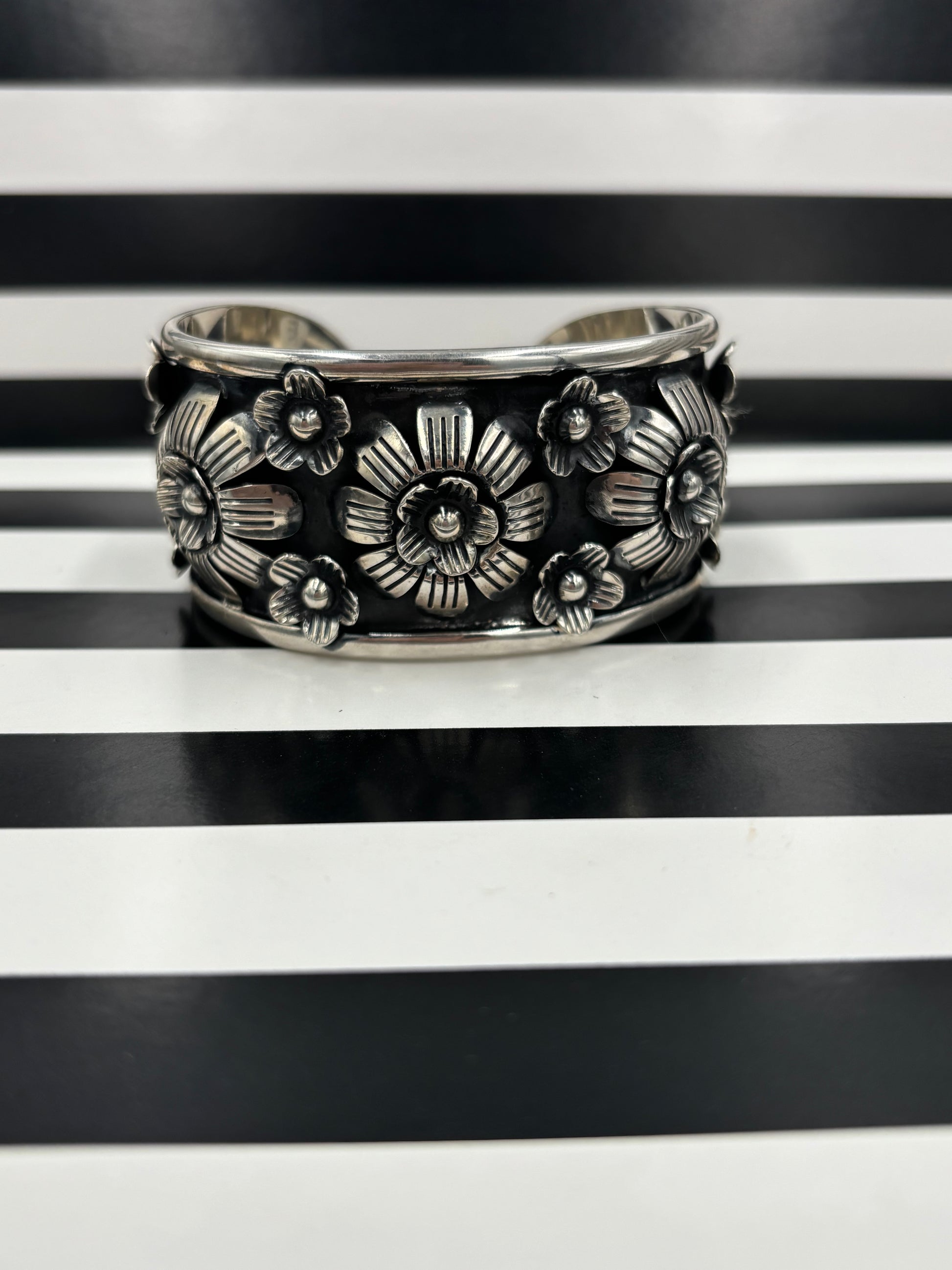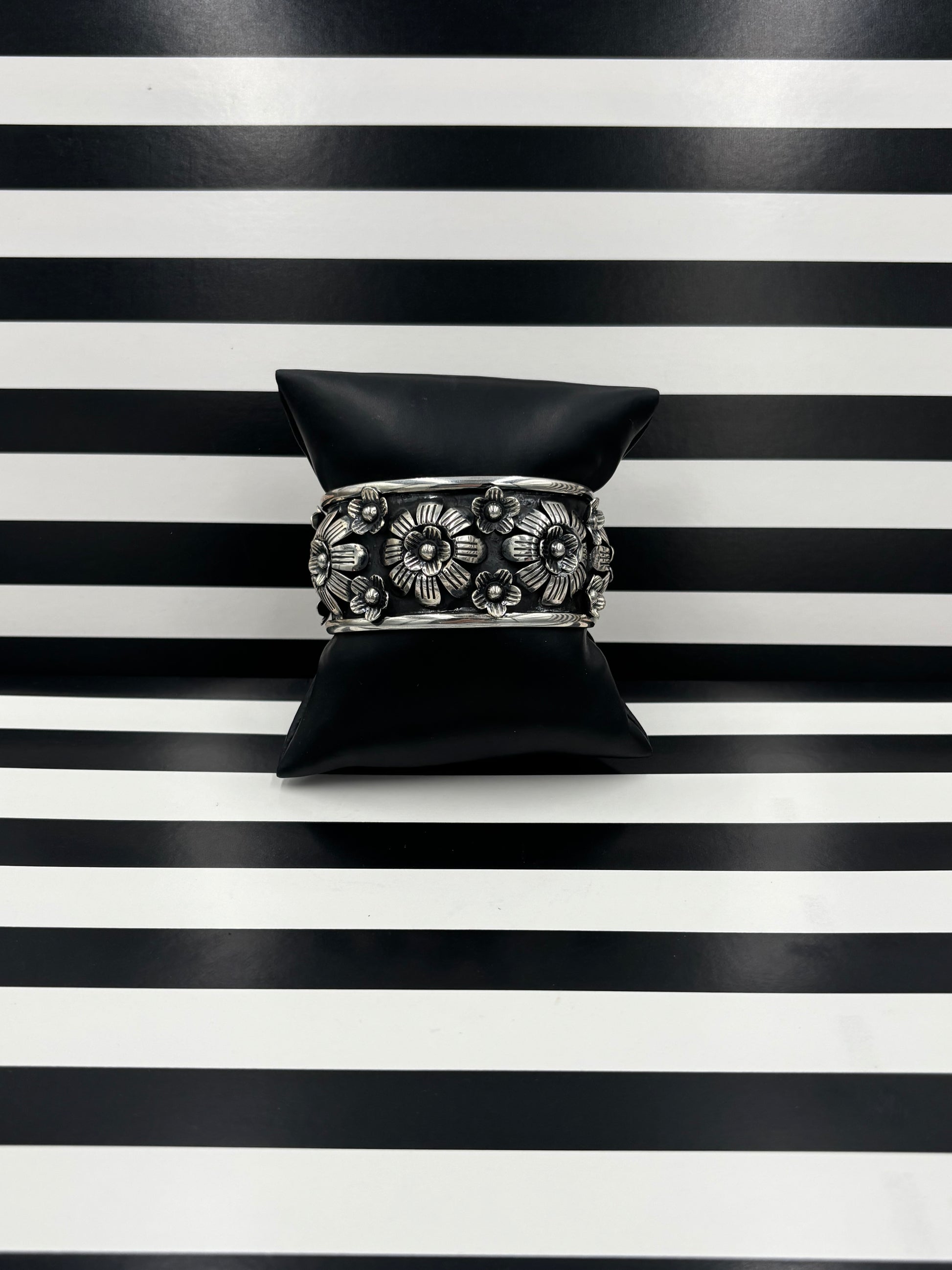 Pass on the bouquet of flowers and add this sterling boutique of flowers wrapped in a cuff! Each of these flowers made of sterling silver are a masterpiece! You will find yourself staring at your wrist in admiration of this masterpiece-and no pollen producing allergies or sneezing from these gorgeous flowers!