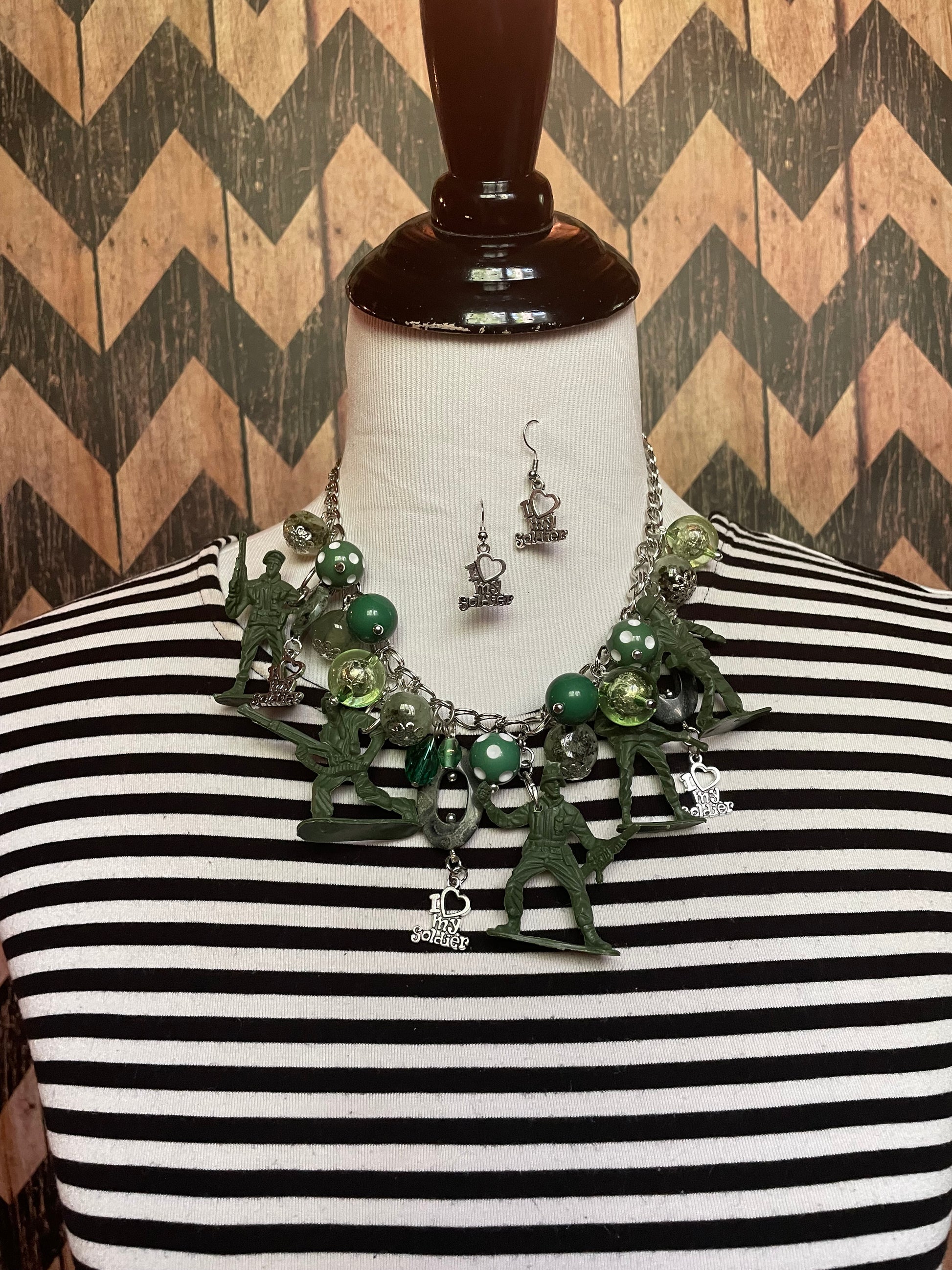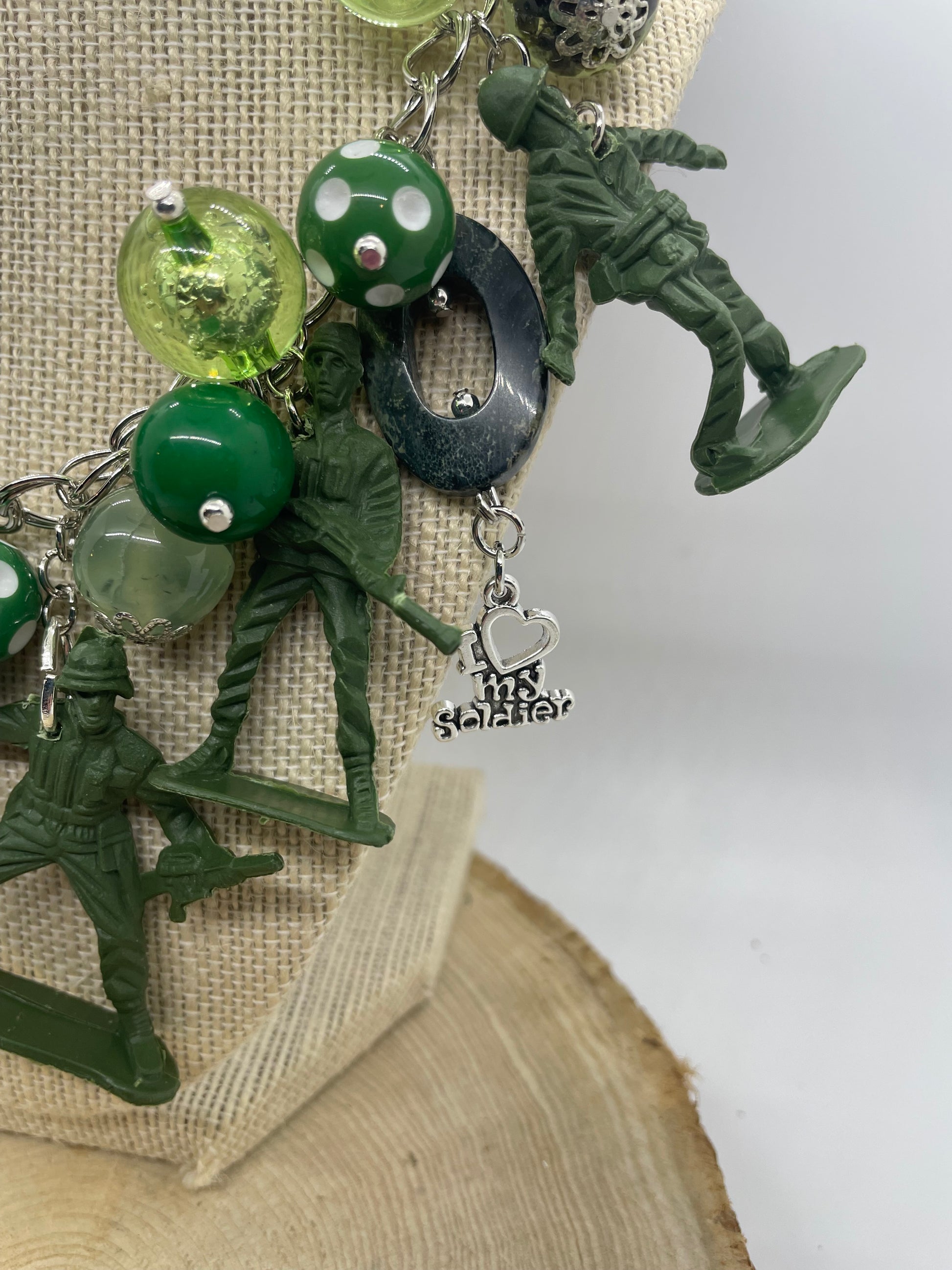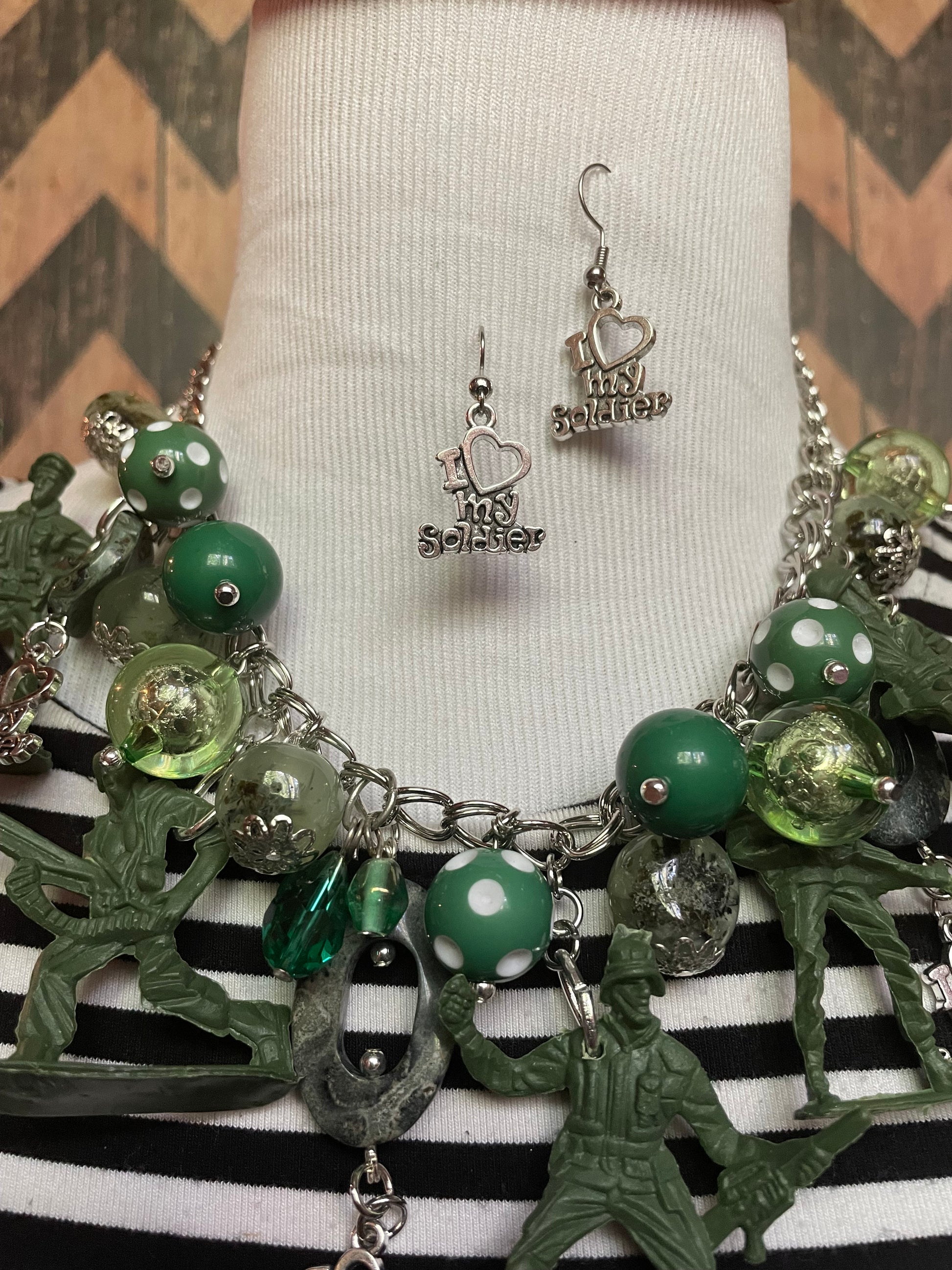 I Love My Soldier Necklace is loaded with hand crafted charmed each uniquely one of a kind designed my Jennifer with the desire to honor that special soldier and all soldier who are and have served our country! Made with much love and gratitude! Pairs beautifully with the I Love My Soldier Earrings!