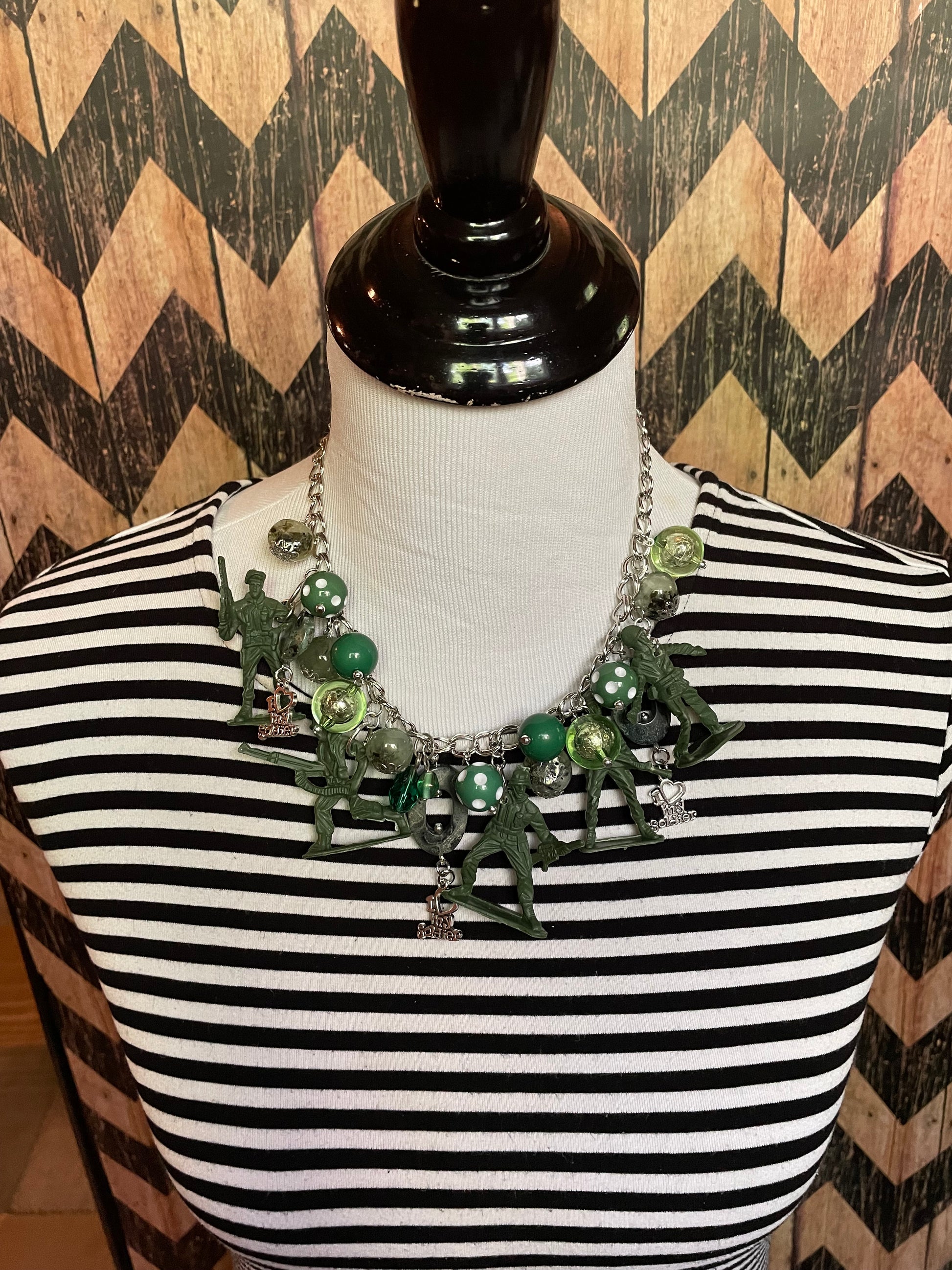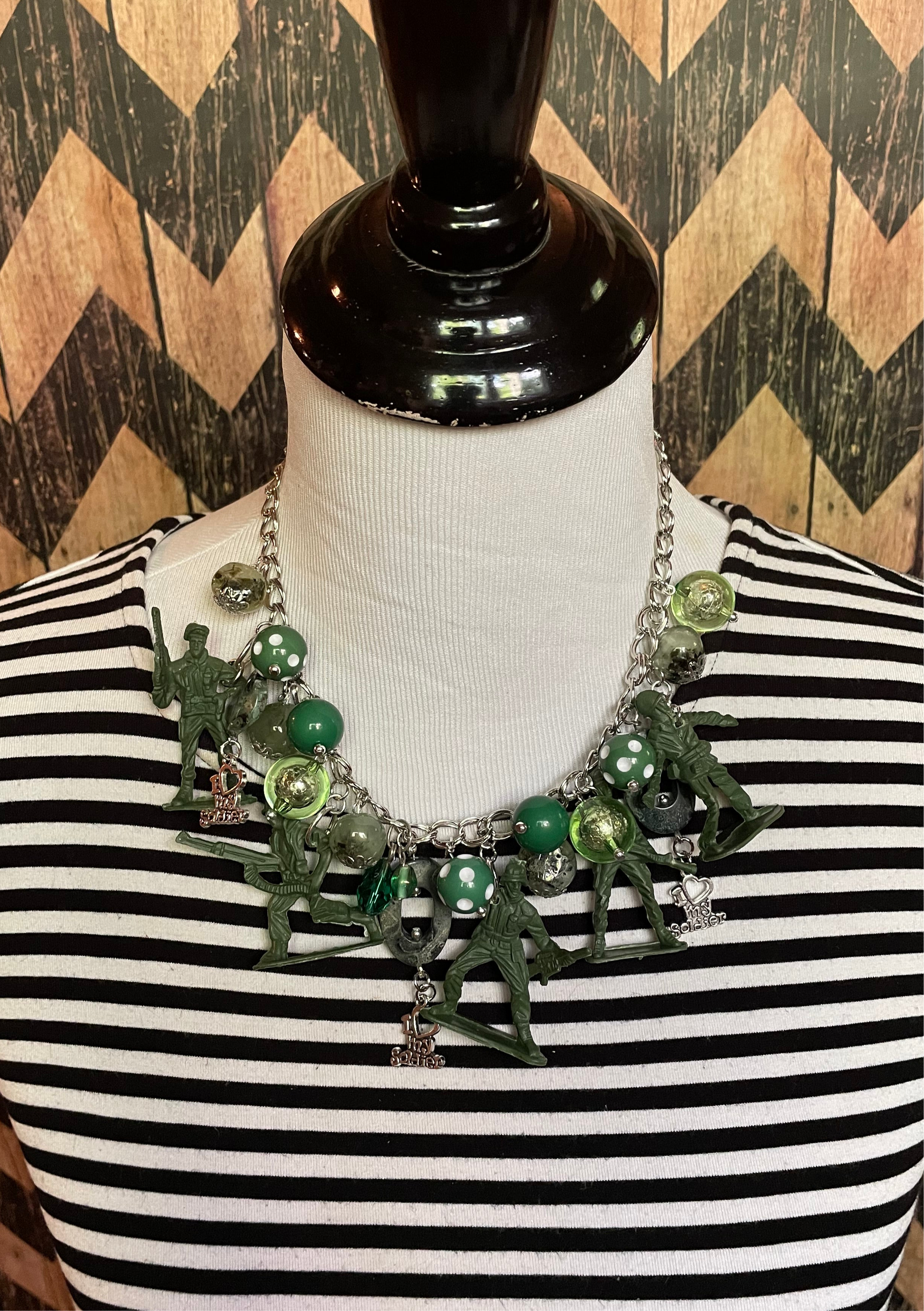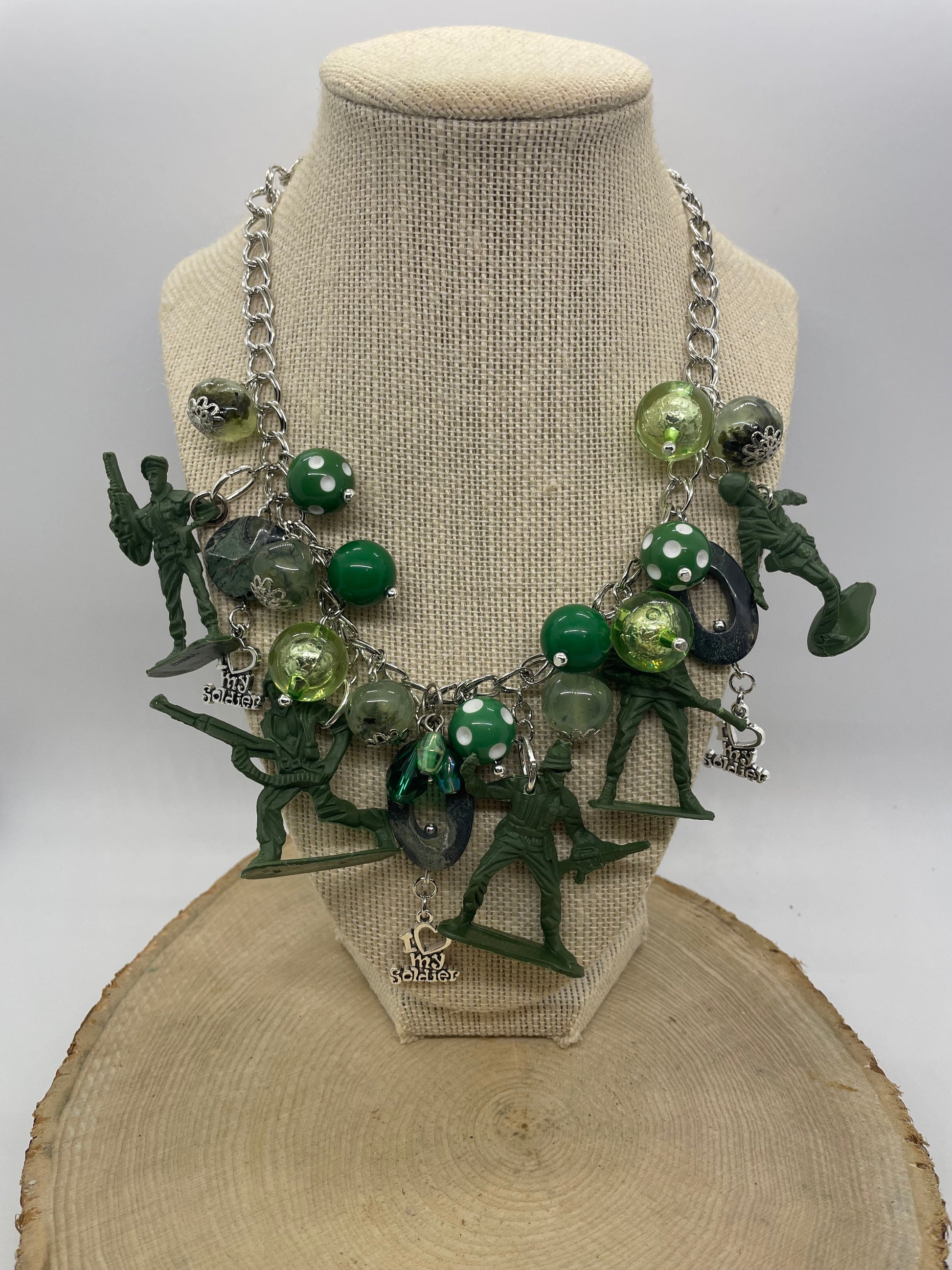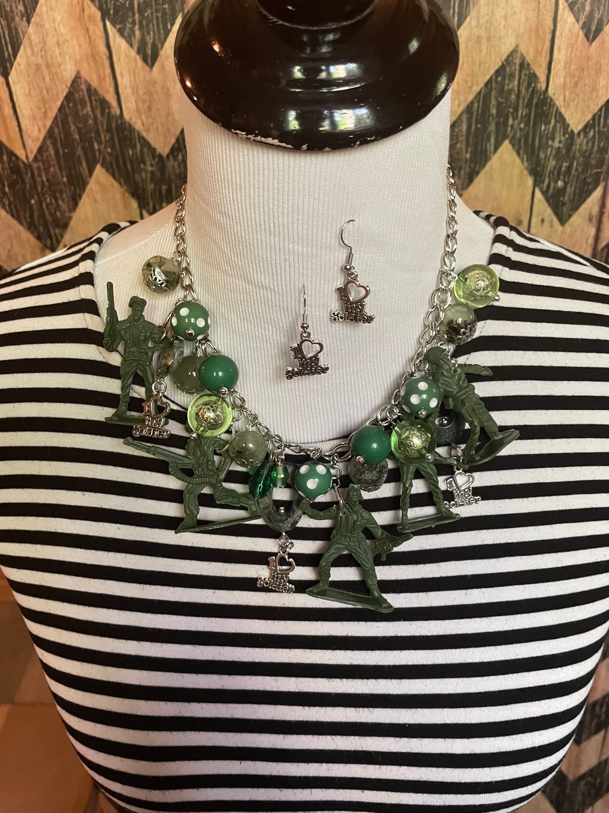I Love My Soldier Necklace is loaded with hand crafted charmed each uniquely one of a kind designed my Jennifer with the desire to honor that special soldier and all soldier who are and have served our country! Made with much love and gratitude! Pairs beautifully with the I Love My Soldier Earrings!