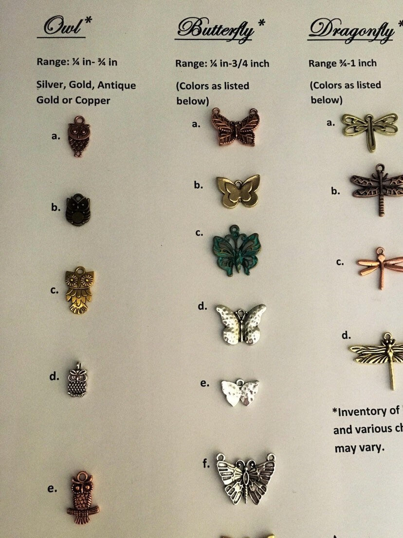 See picture of optional charms that can selected and please note the letter that is listed next to your favorite Owl--if it is still available, I will make it custom for you! (Charms are first come first serve...supplies are limited in color/style/size). Each owl available in Gold, Silver, Antique Gold and Copper colors!) *Standard is similar to picture shown....Owl charms may vary slightly. Due to the nature of custom hand stamping metals, each piece has it's own unique alignment and may vary in depth of impression. This is completely normal and expected with handmade artwork in this medium. Your piece will be completely one of a kind!