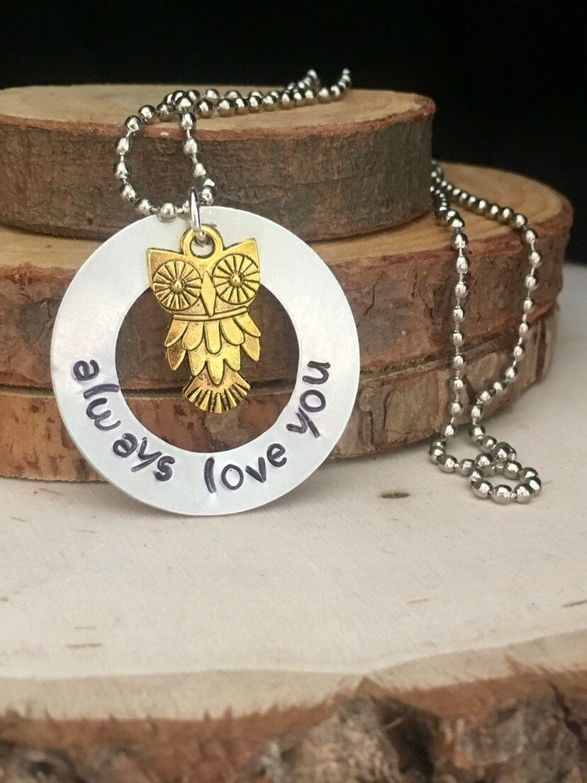 Whooooooo do you know that needs this "Owl" Always LOVE you charmed pendant necklace? Want to start your day with a smile? Put this on as a fun reminder of someone special! Customization is detailed at checkout.