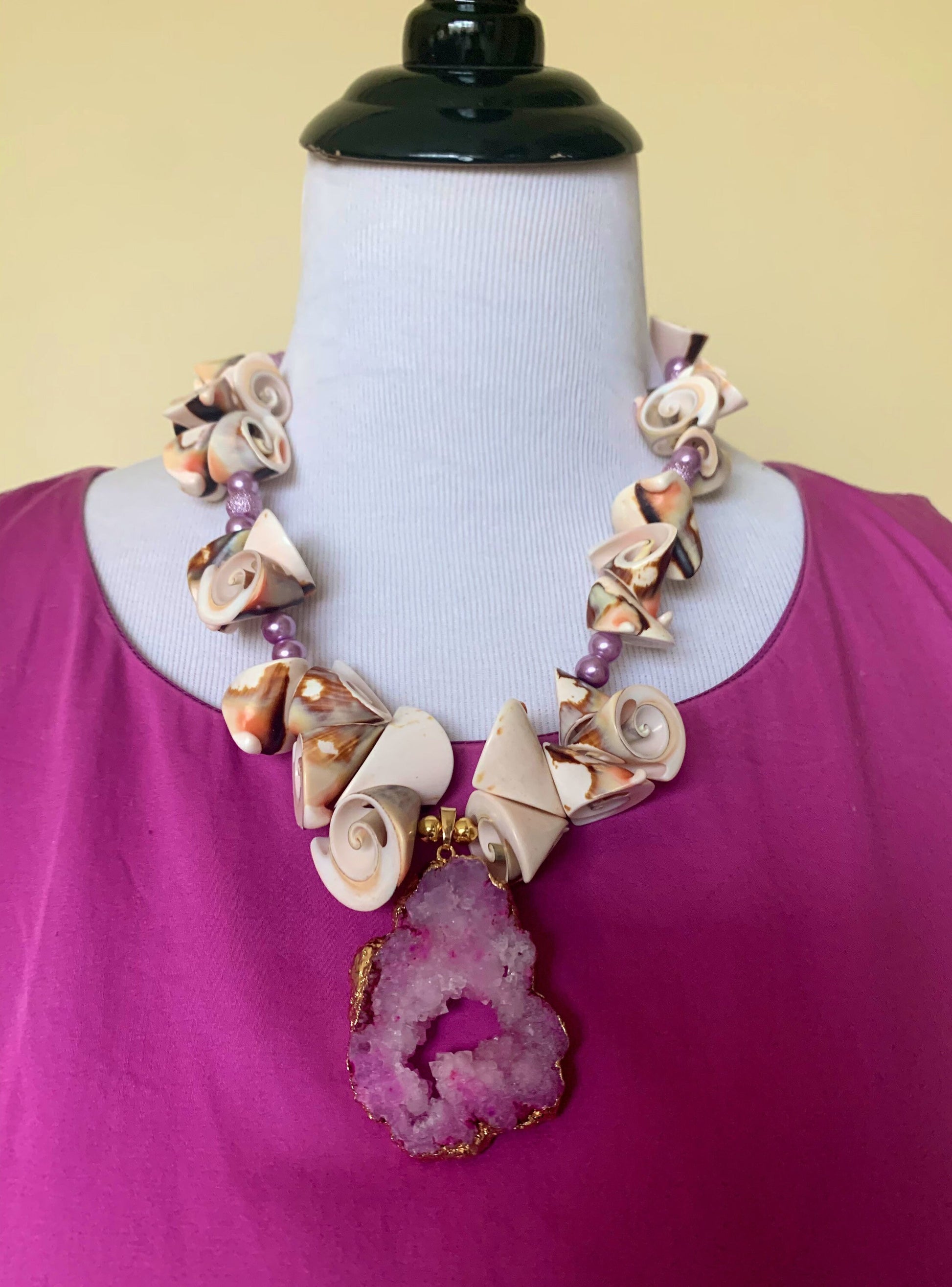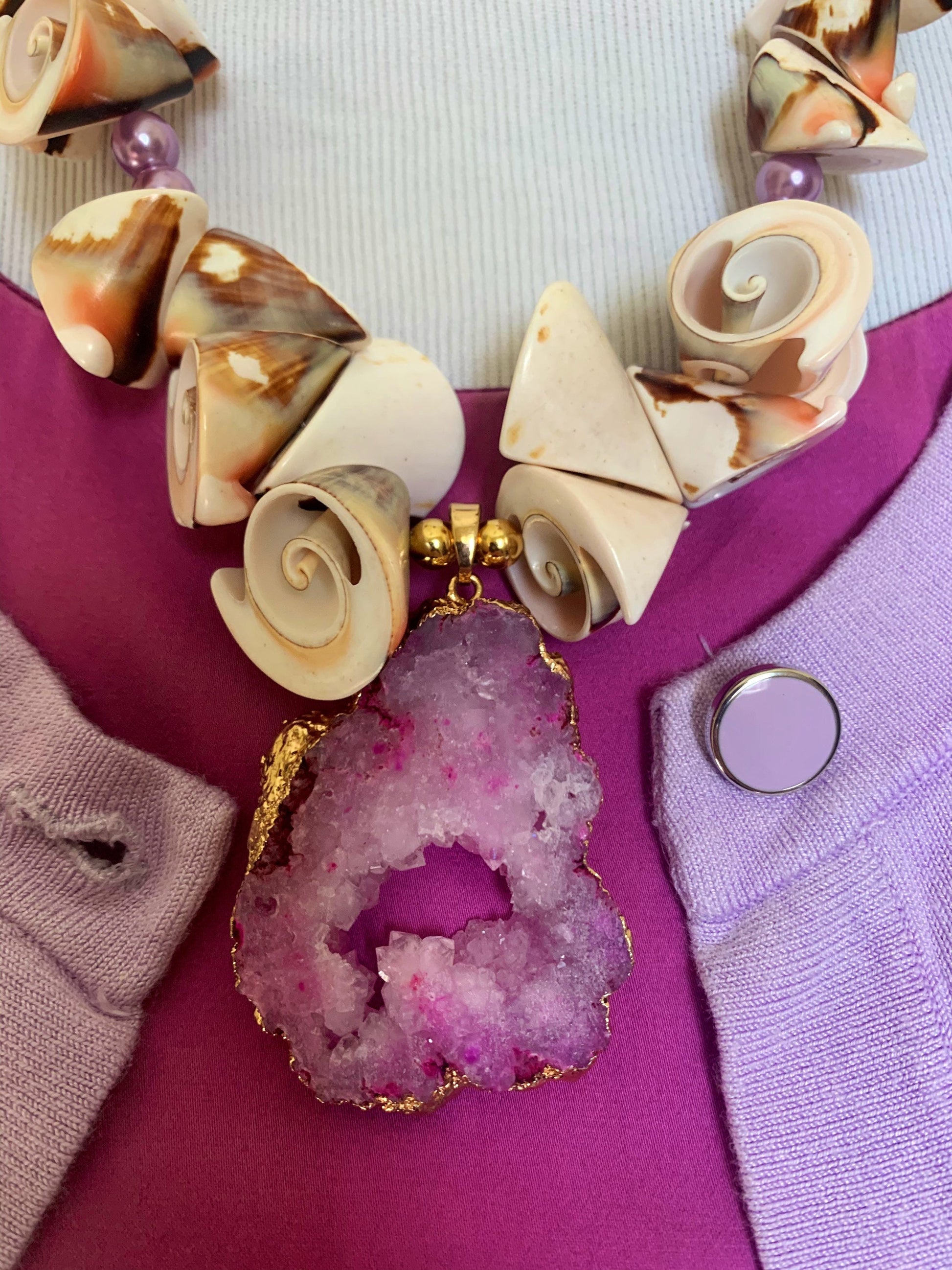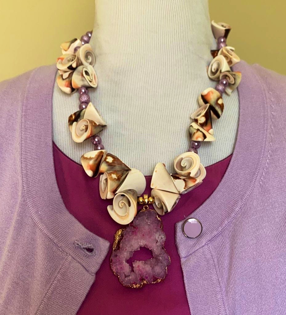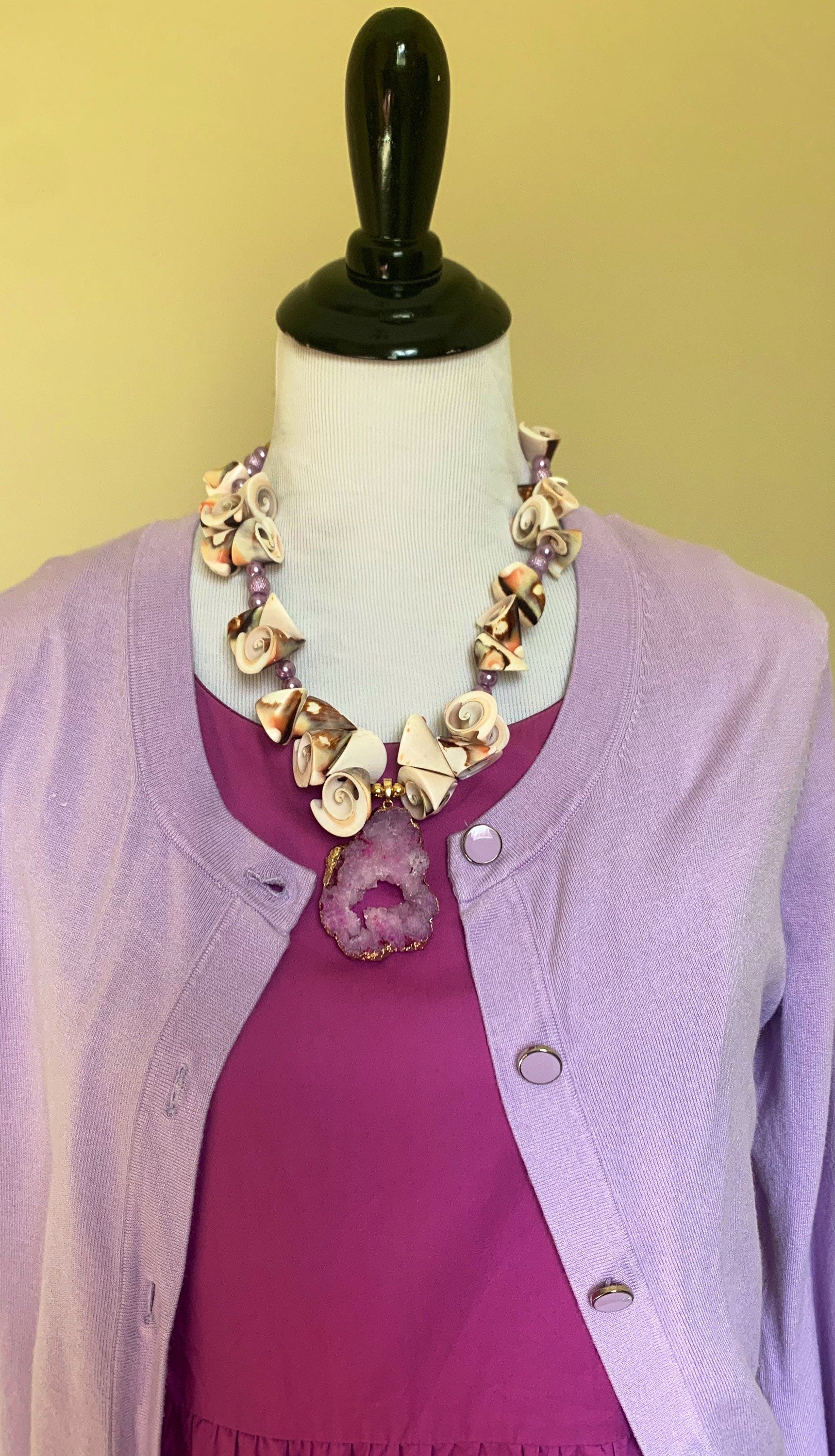 Purple Goodness Necklace is full of gorgeous pearl shell detail adorned with a classic geo styled drop pendant. One of a kind necklace...a show stopper! The Jam Bracelet looks lovely with this necklace as well!