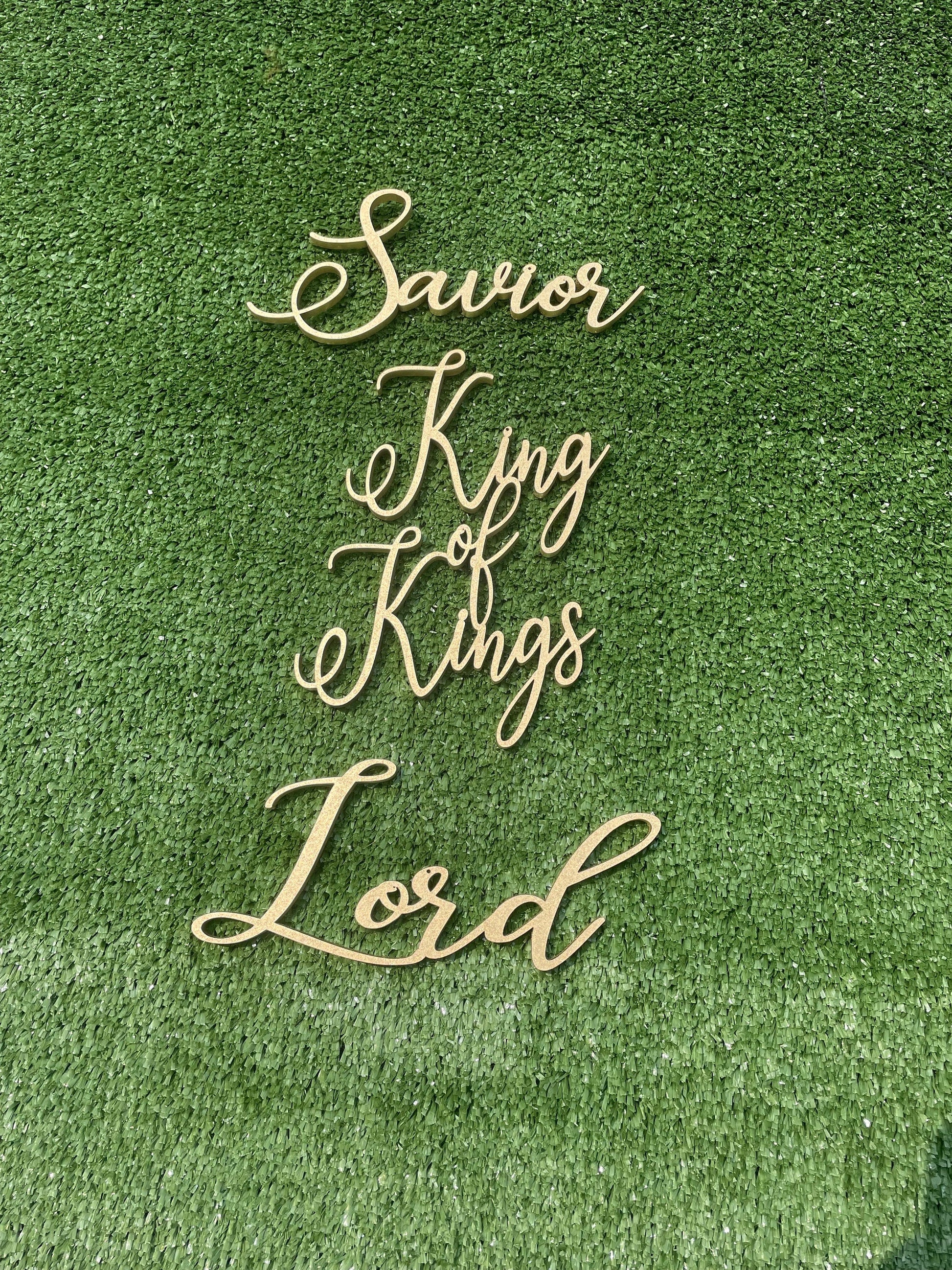 King of Kings, Savior and Lord are the 3 Individual Ornaments in this collection of the Names of Jesus Christmas Trio Set . They are currently available in Gold offered in 2 sizes. The sizes may vary slightly due to word length or with multiple words. Measurements shown in pictures listings. This listing King of Kings, Savior and Lord Set of Ornaments pricing include 3 individual ornaments.