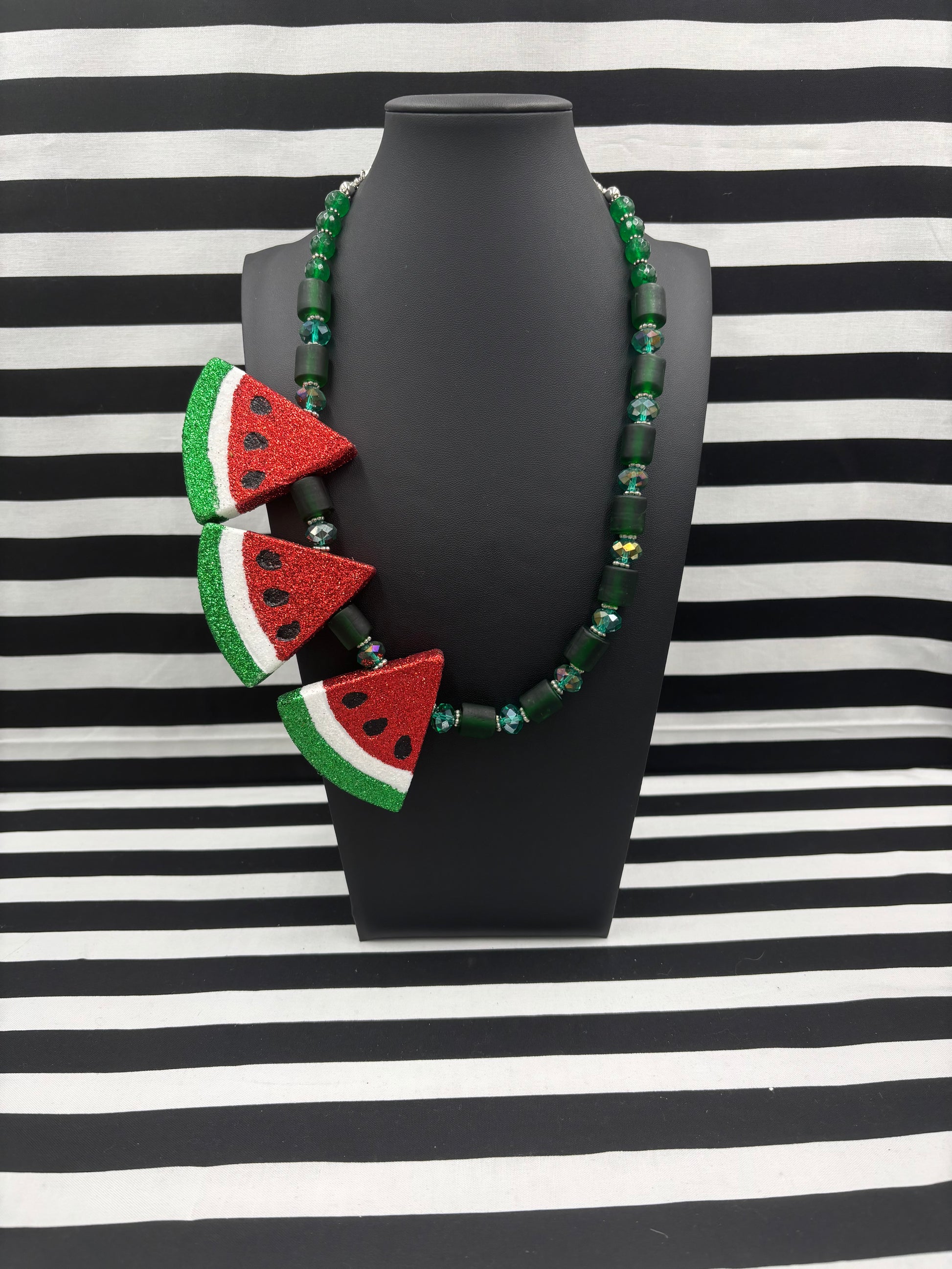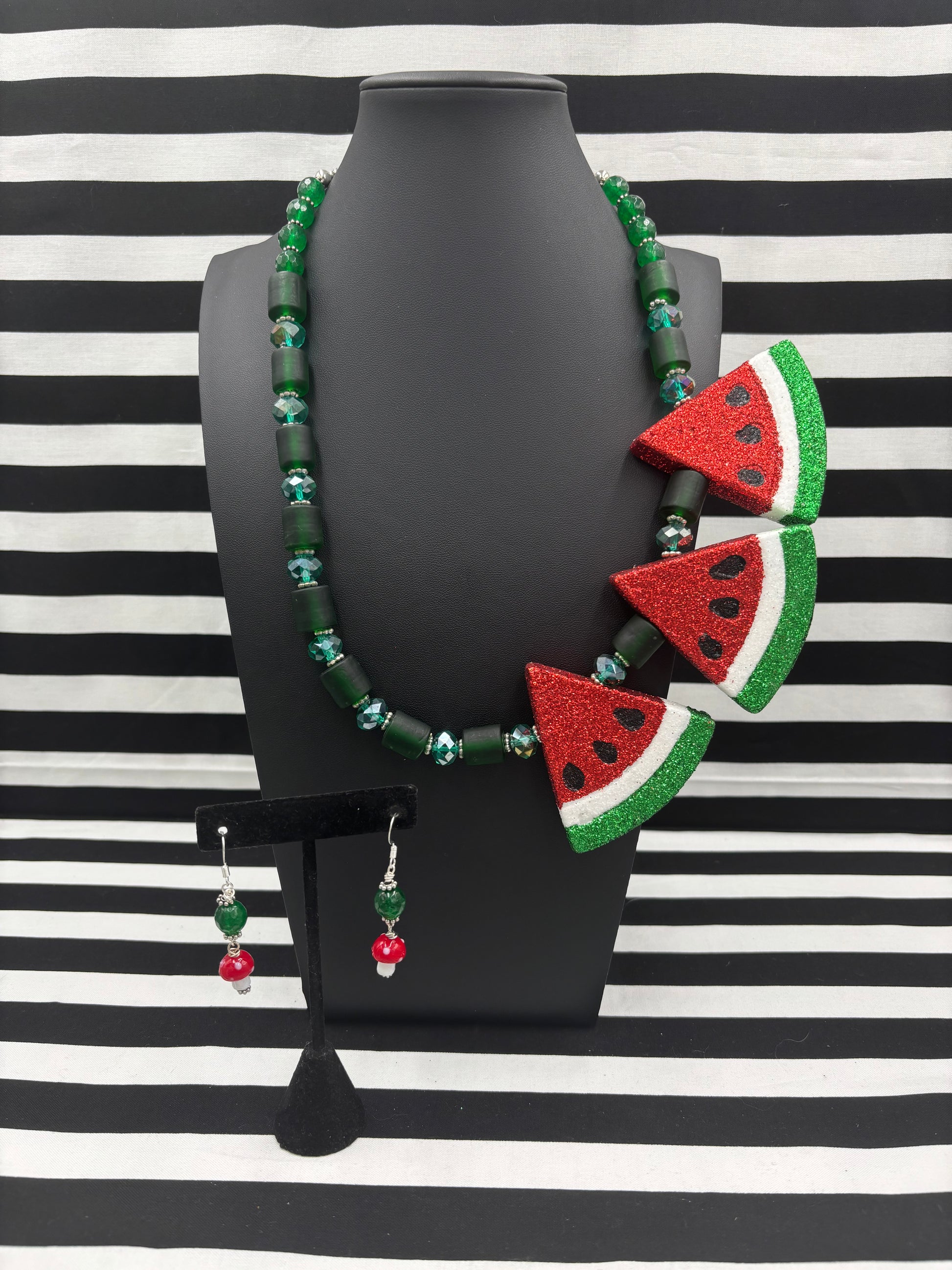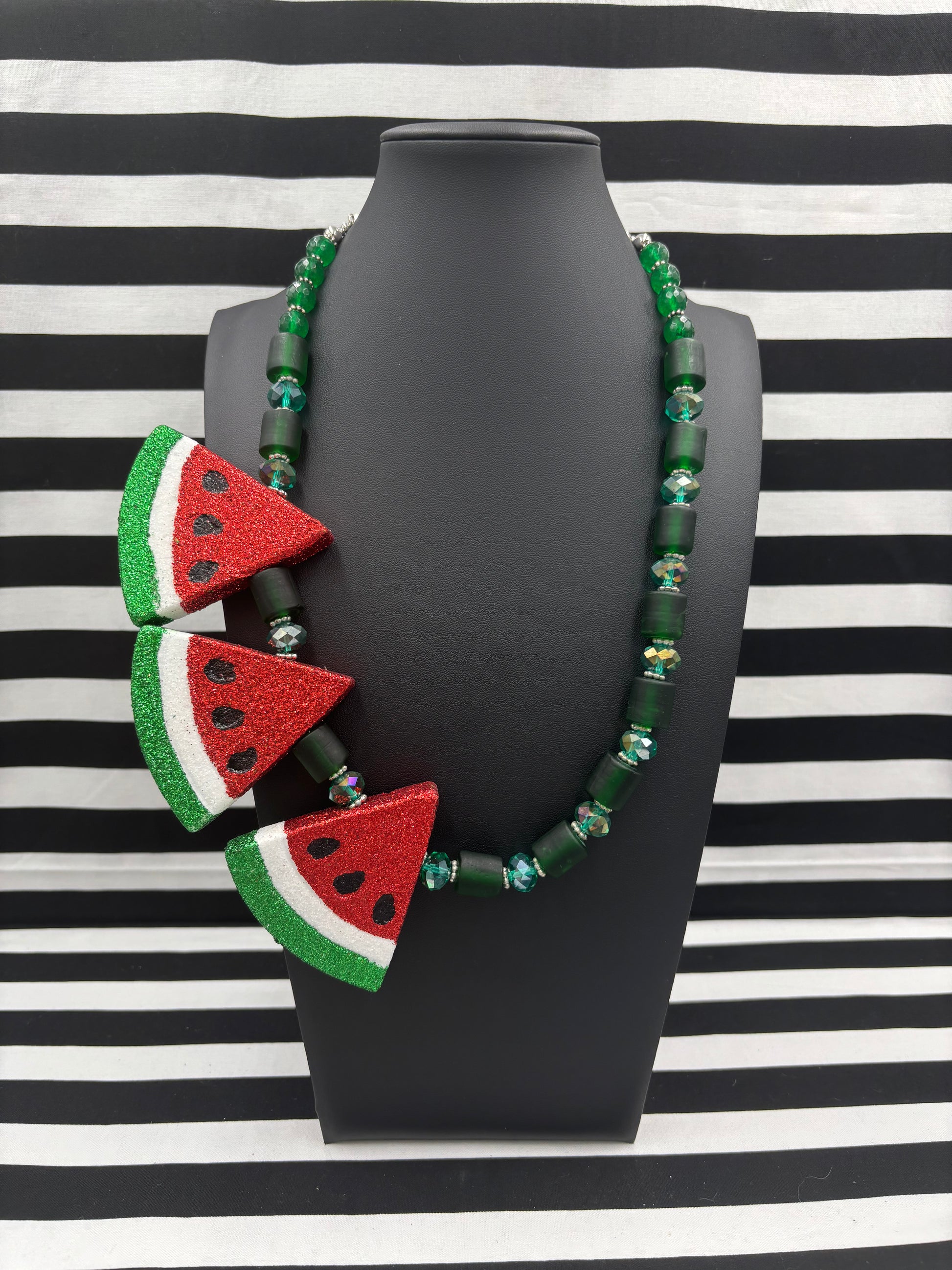 Slices is a fun offset Watermelon necklace that is playful and lightweight adding pops of color to a festive look! The Ladybug Earrings and Mushroom Earrings also compliment this look in a charming way with their blown glass finishings!