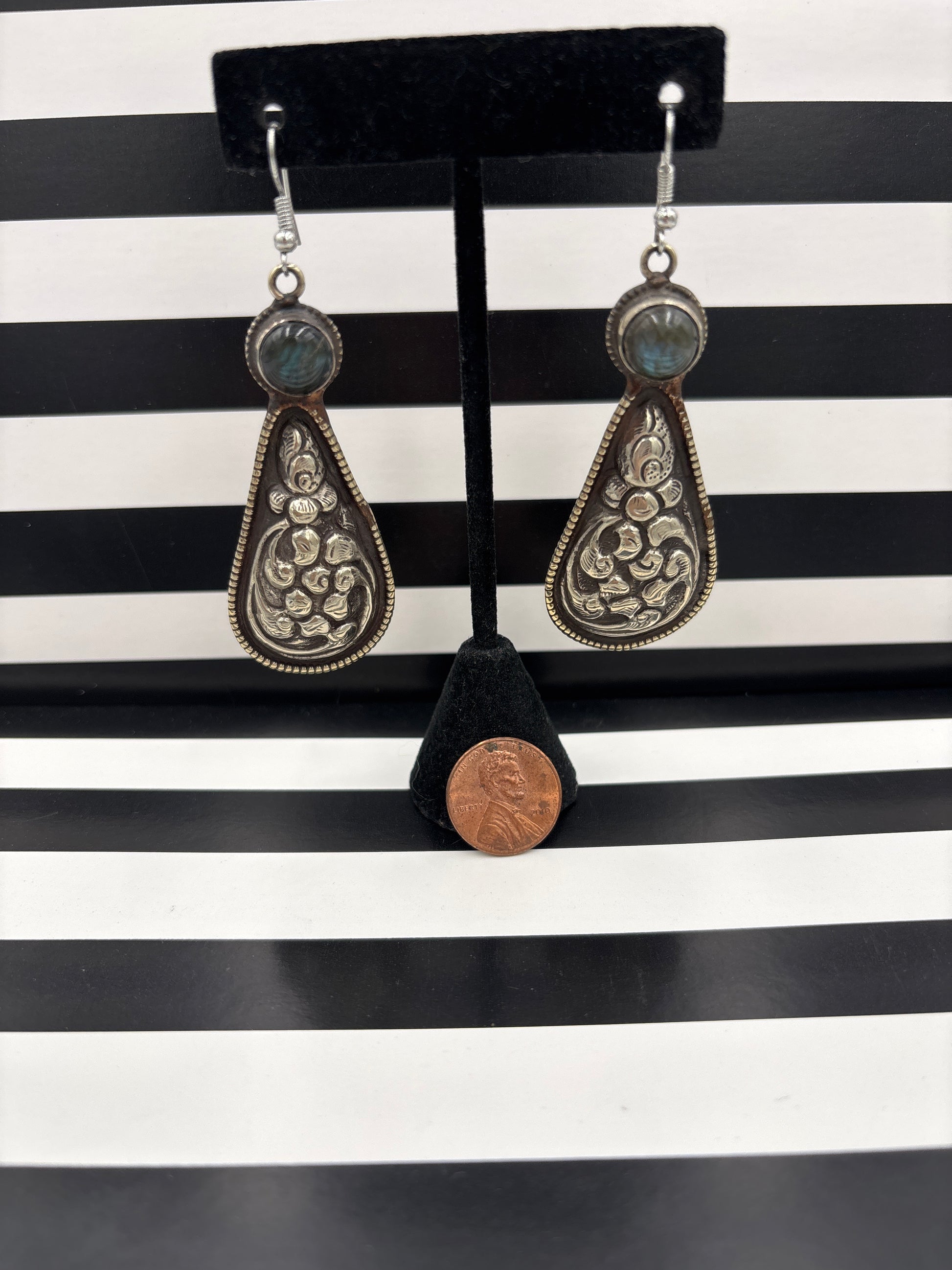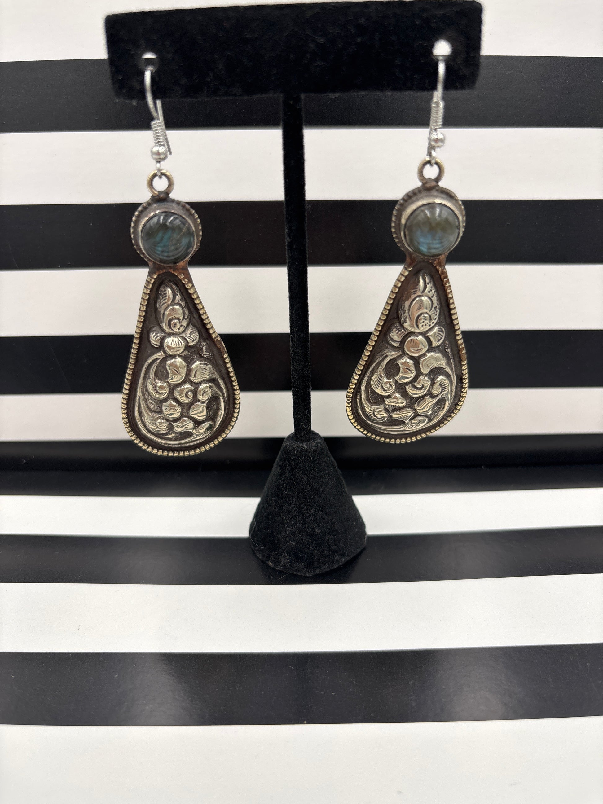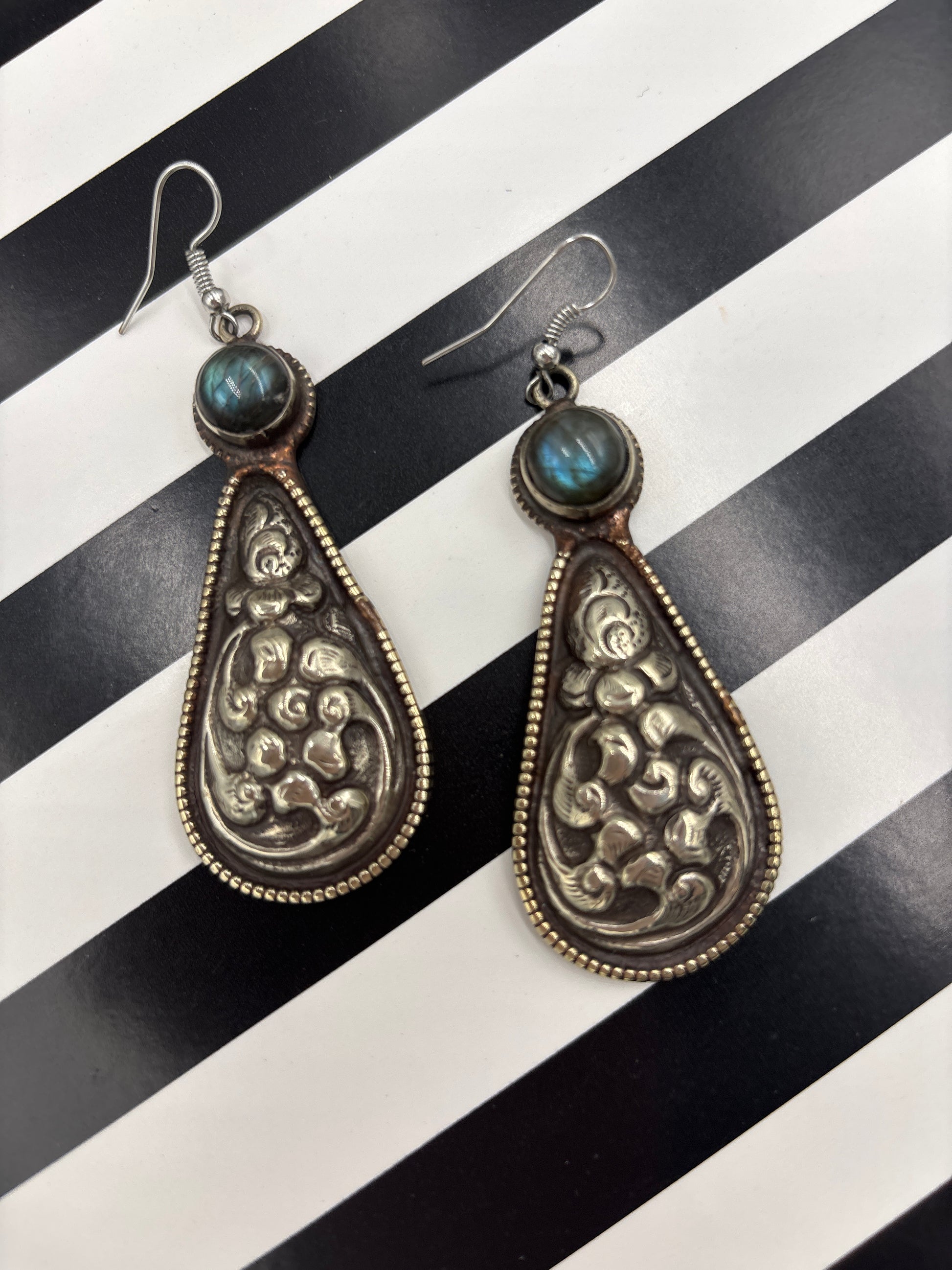 The Repousse Earrings are classic and Tearshaped-elongating the face and boast the most eyecatching moody stone: Labradorite! Although these 2 stones anre beautifully mounted the design is still super lightweight! You can wear these every day and your ears will love you too! Only 1 pair available!