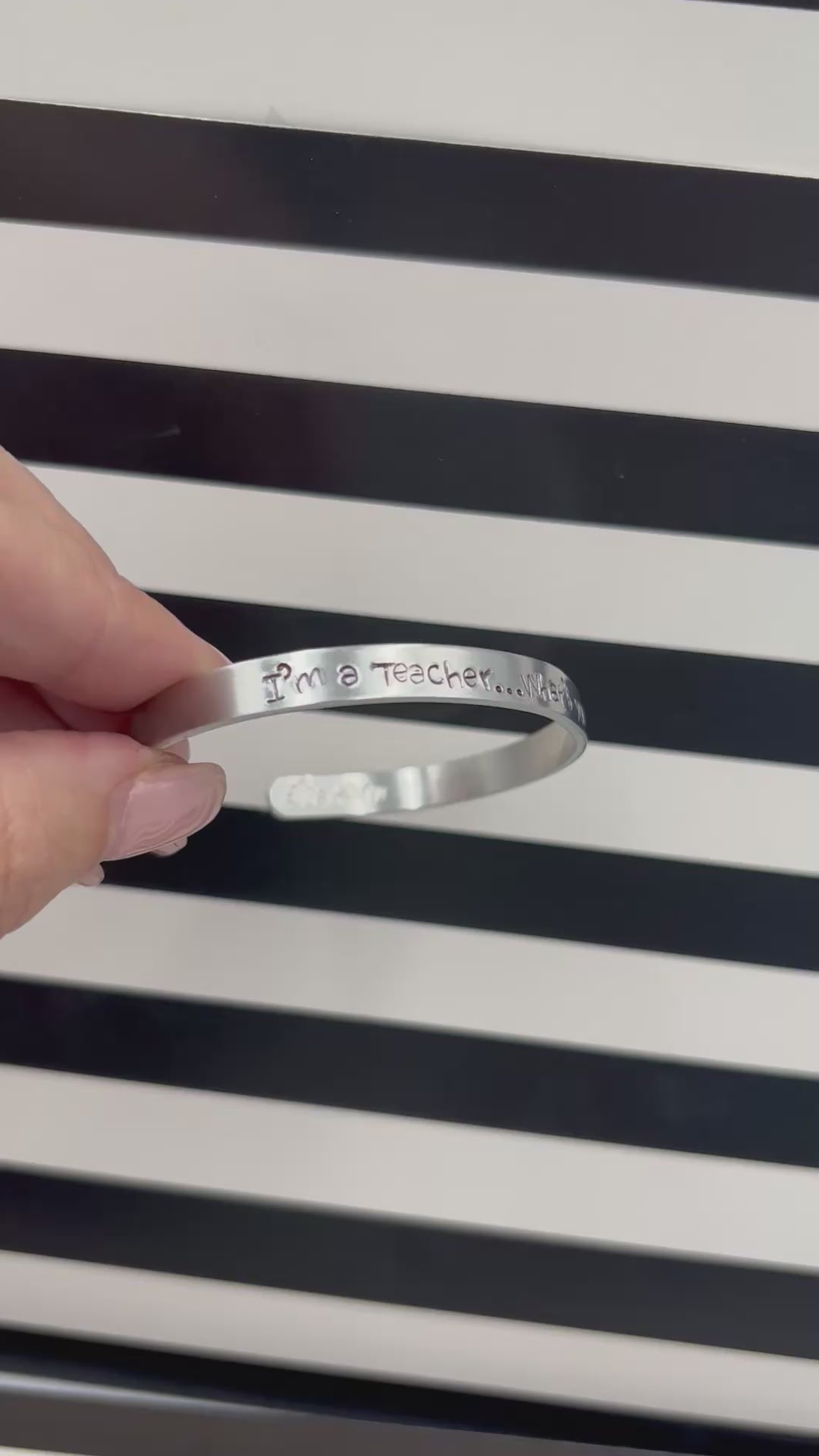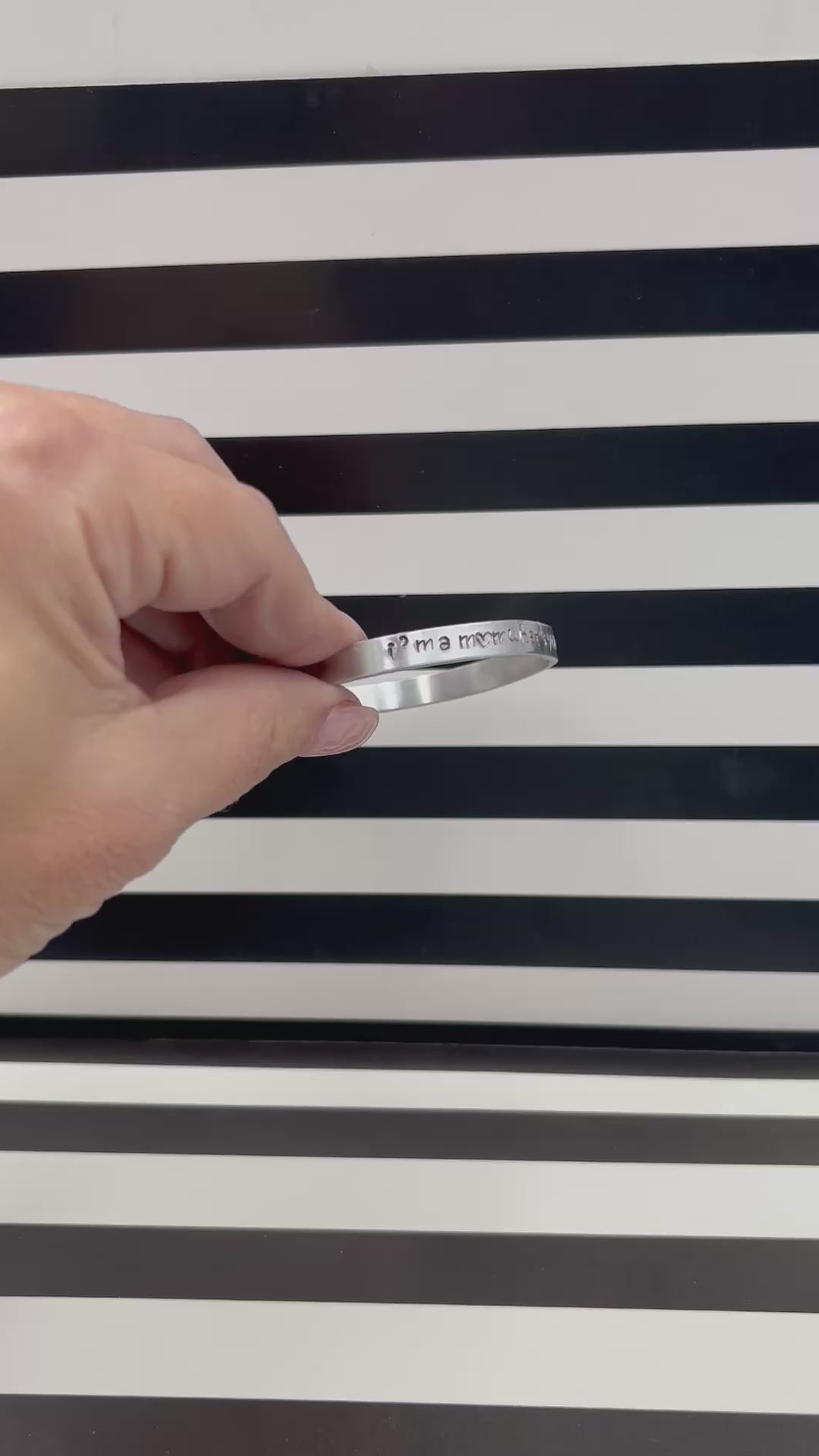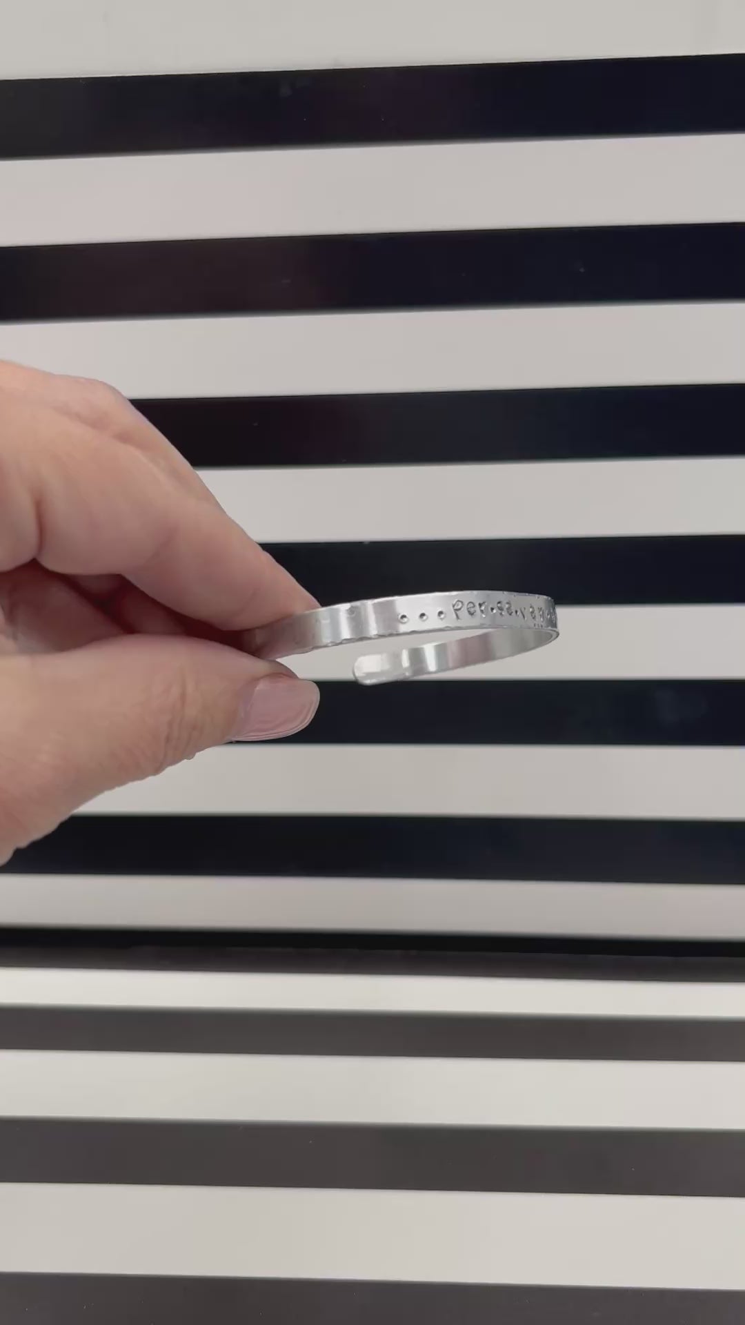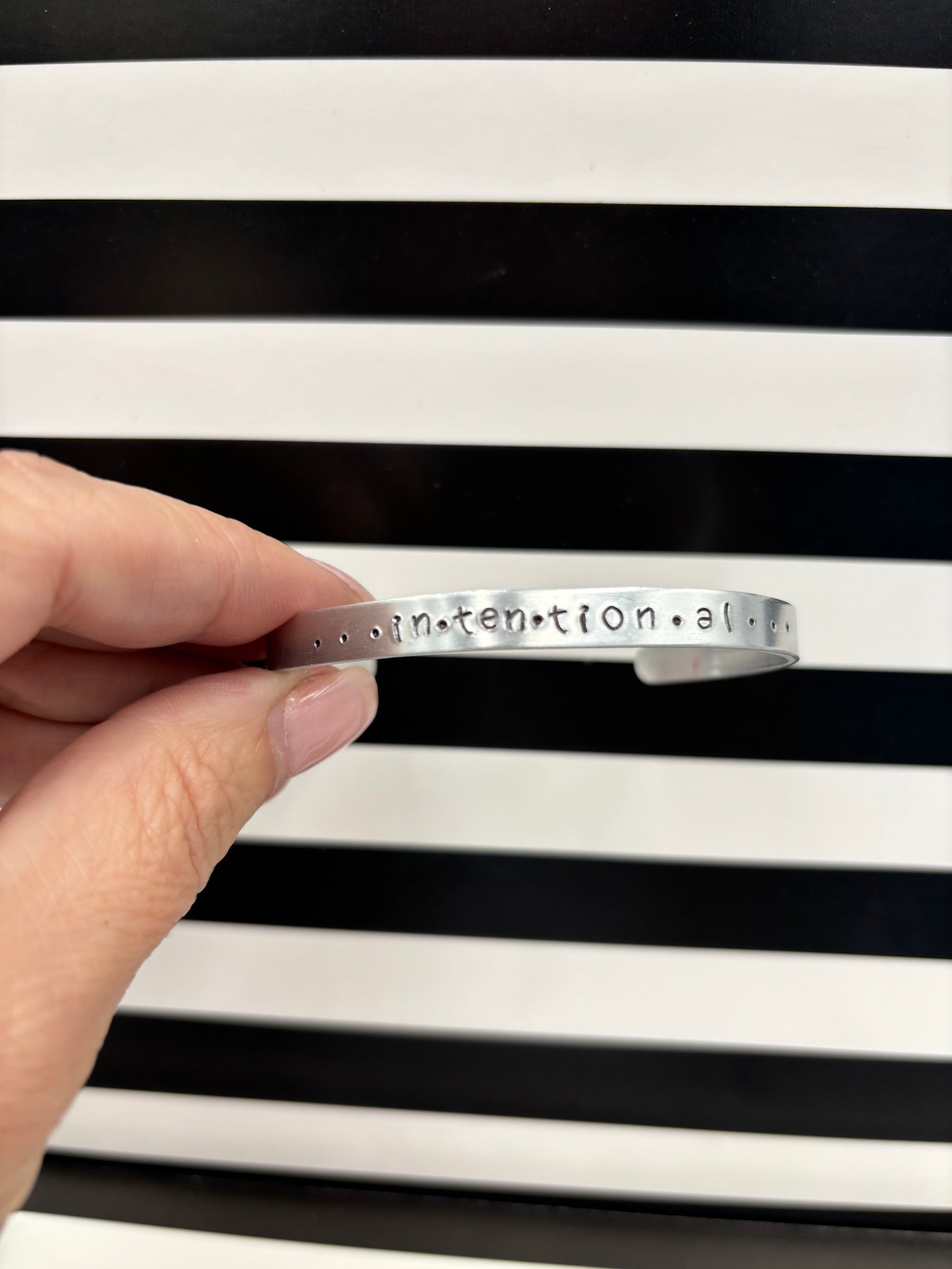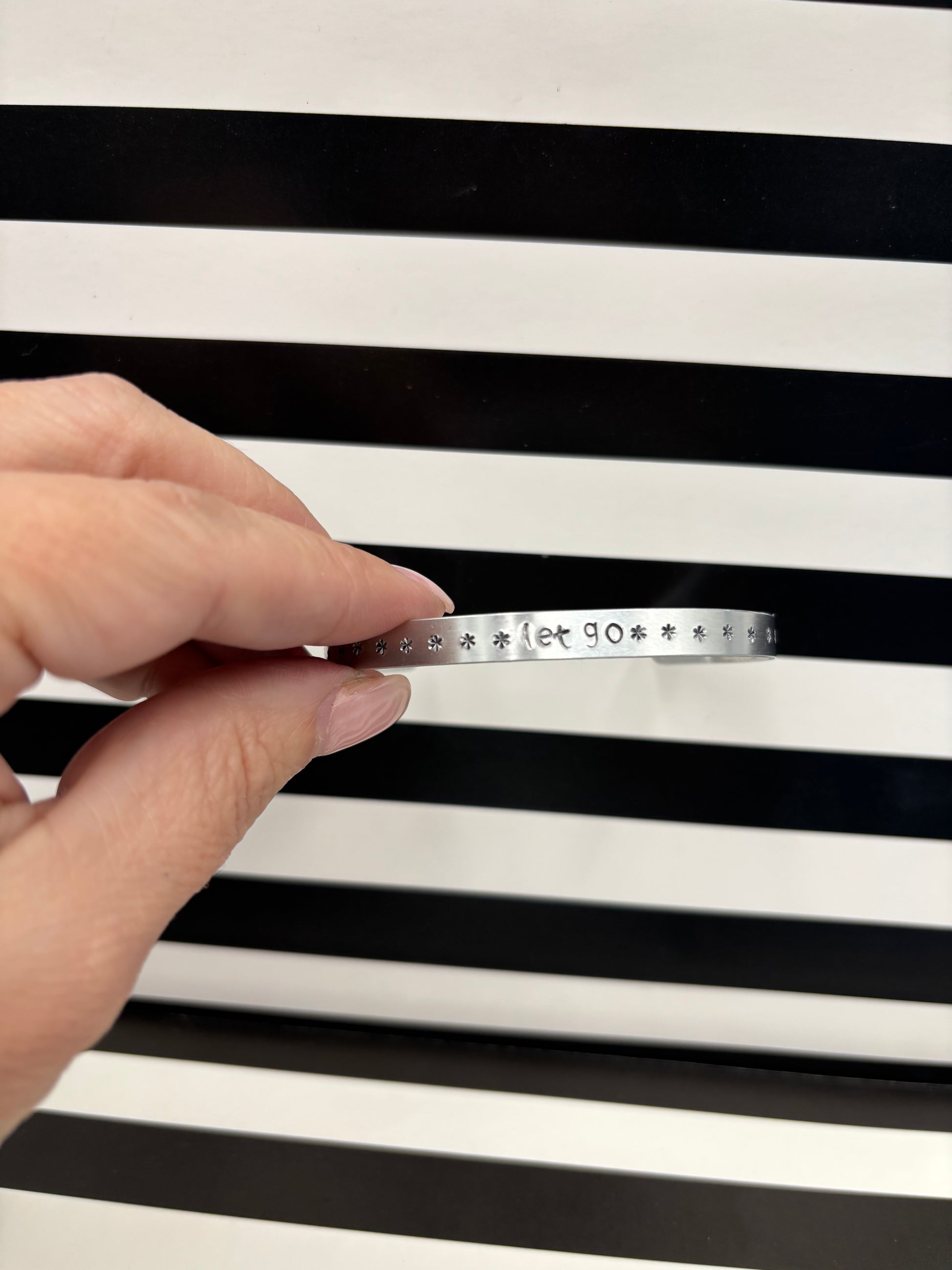 The Angelina Bracelet features a row of available text (up to approximately 75 characters (including spaces) for you to customize for your own personalized message! This is easily adjustable and is a one size fits all adults although there is a separate link for children’s sized cuffs.