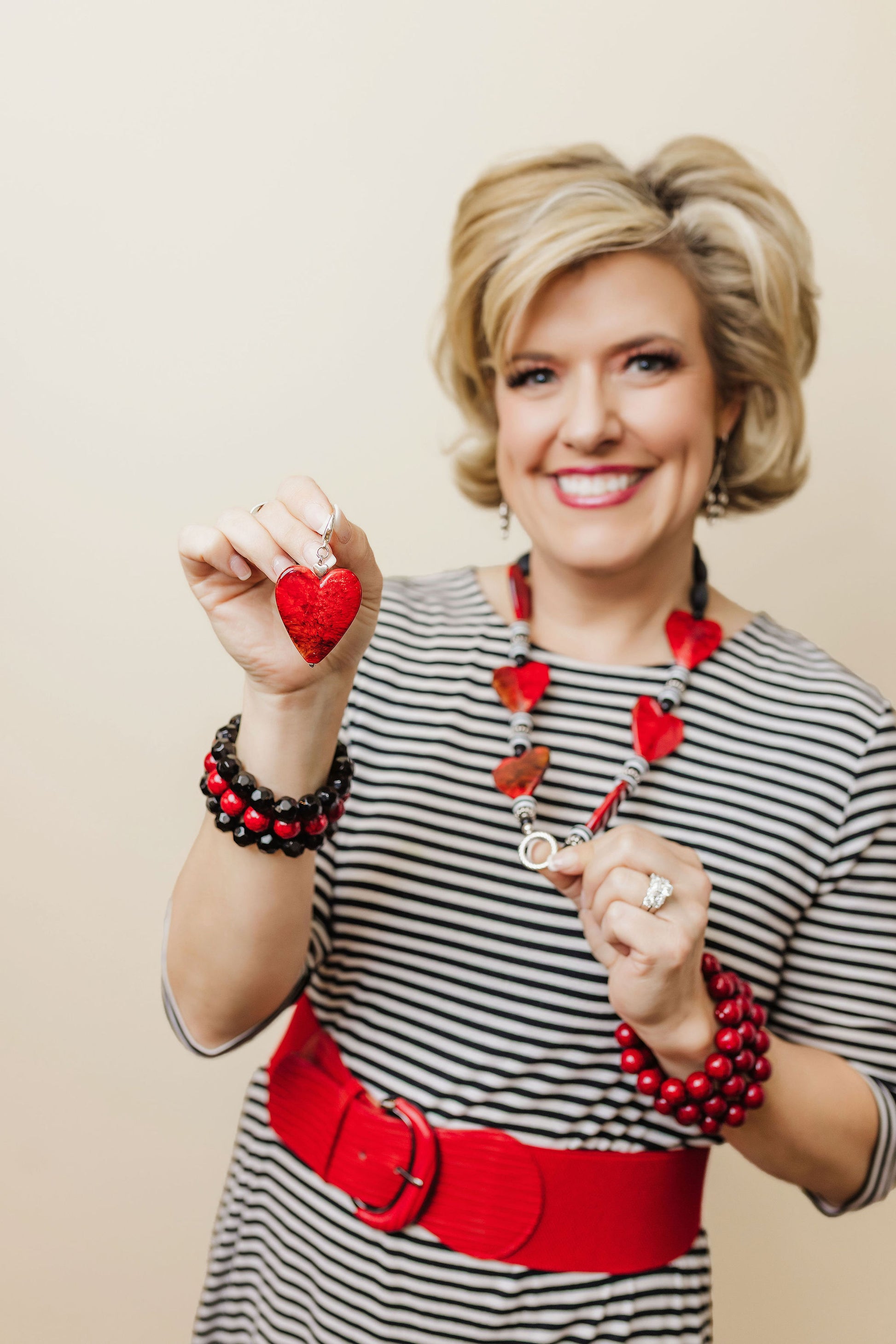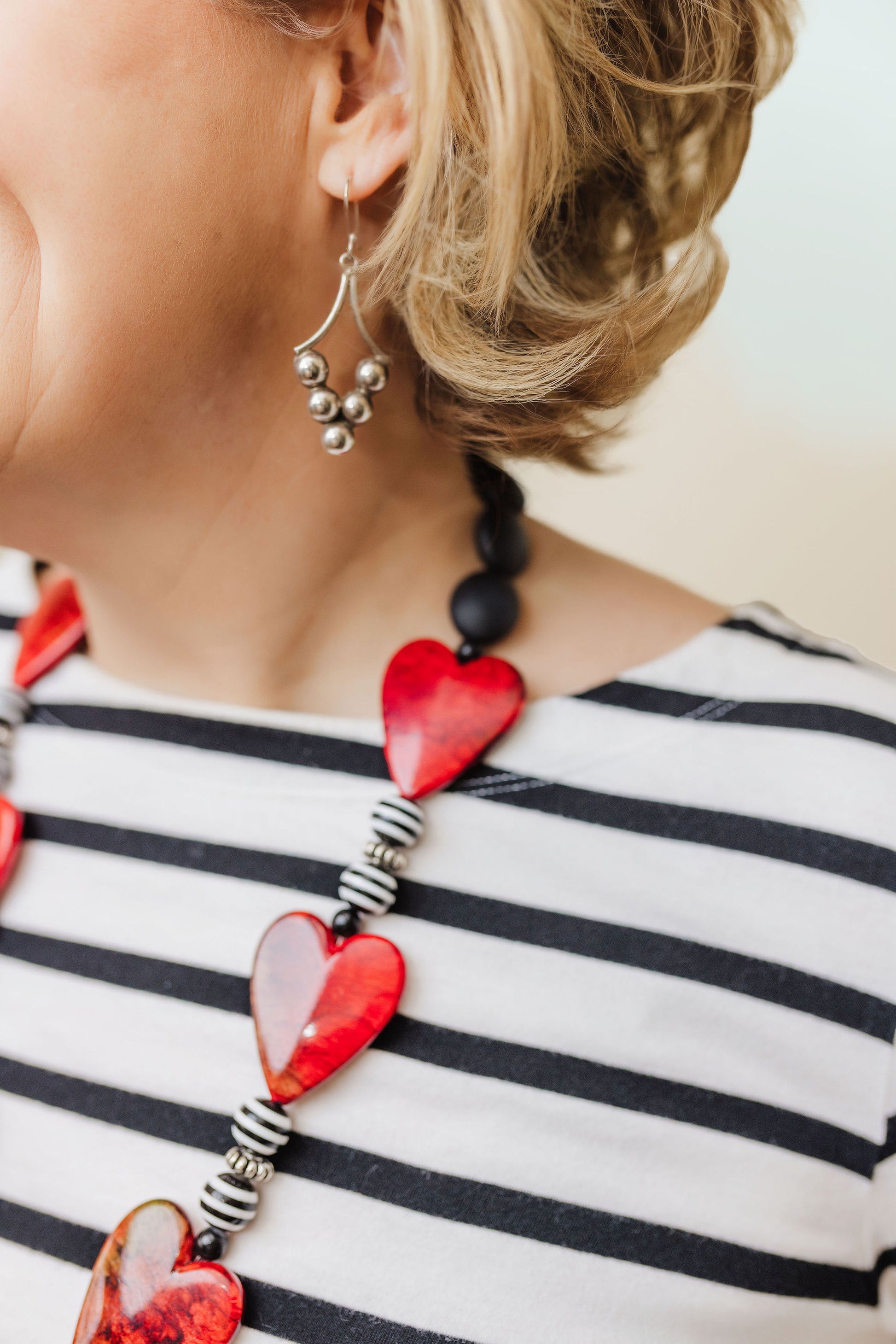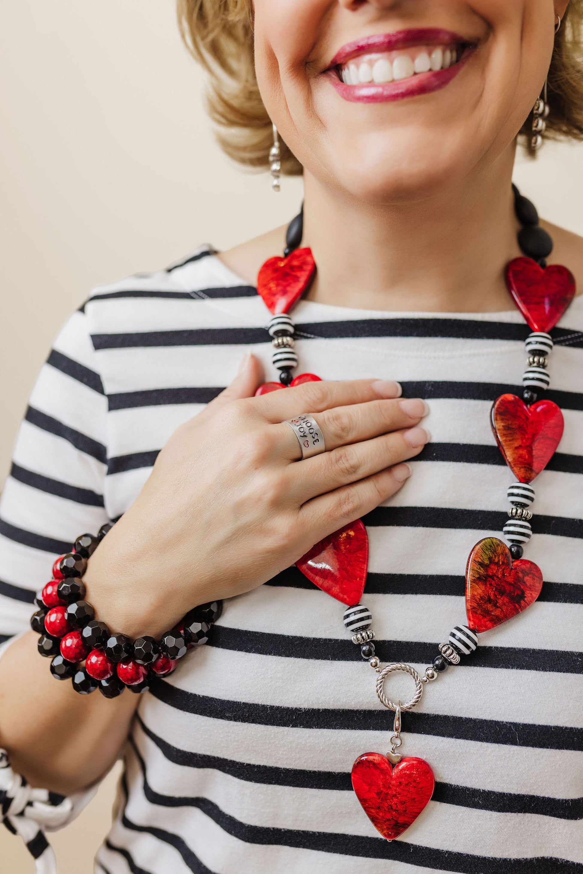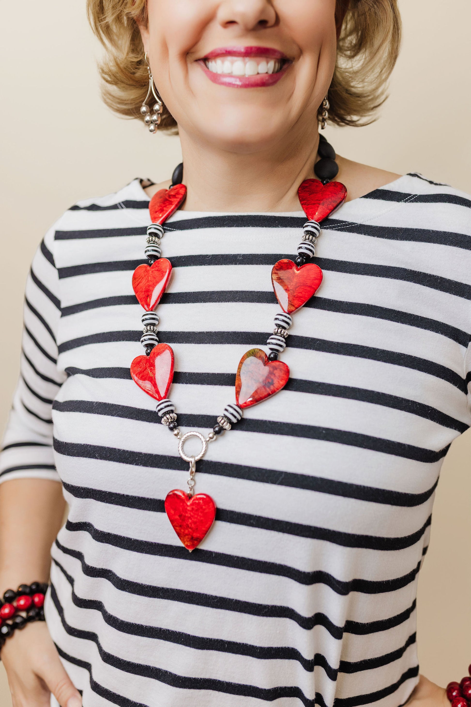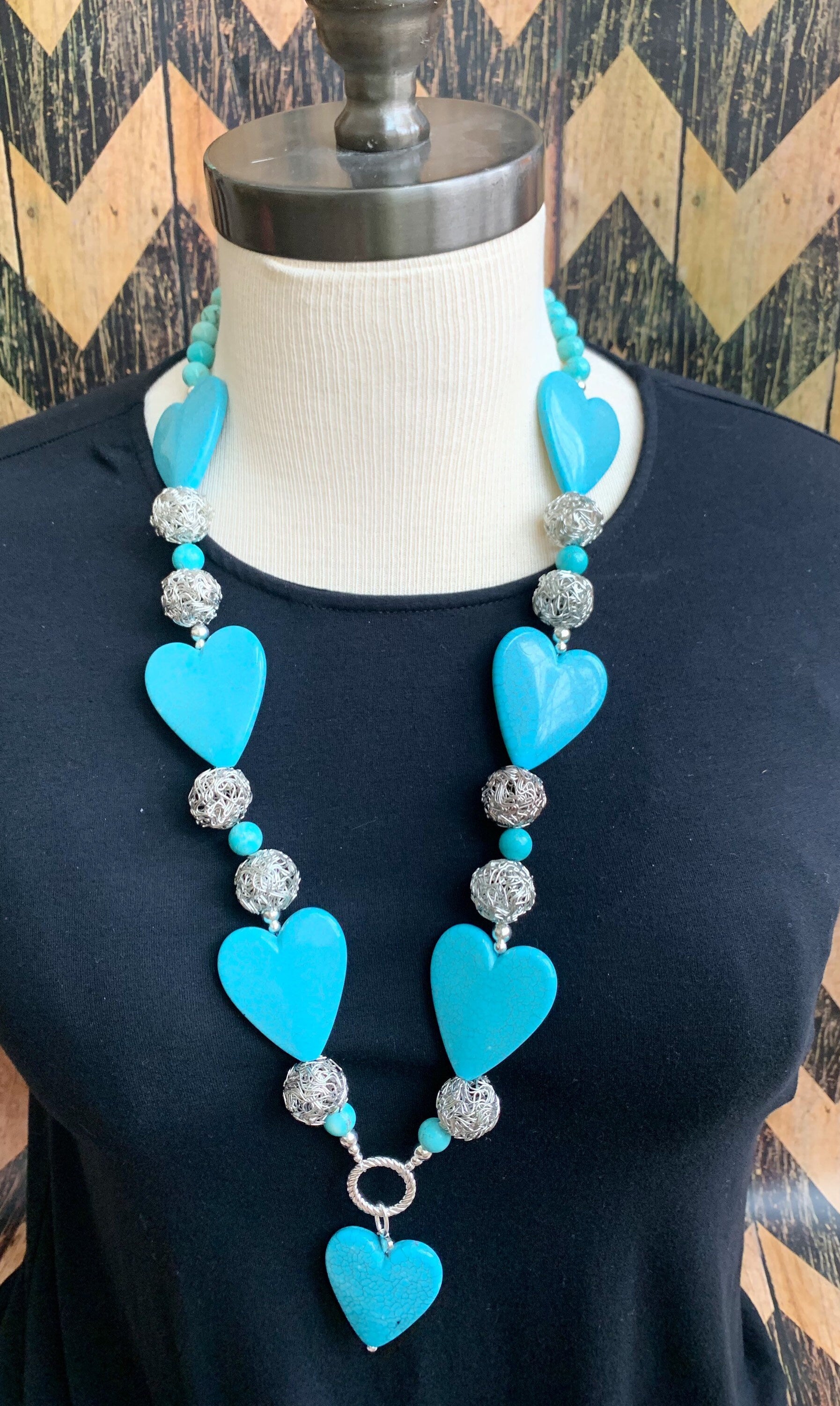 Statement necklace of hearts and beads creating a reminder of I Corinthians 13:13 “And now these three remain: faith, hope and love. But the greatest of these is love”! Fantastic necklace and even works for a lanyard chain to wear daily at work or for conference or name tag! The heart clip at the end of the lanyard can also be added to a zipper or purse pull to add an adorning look to another outfit for multiple uses!