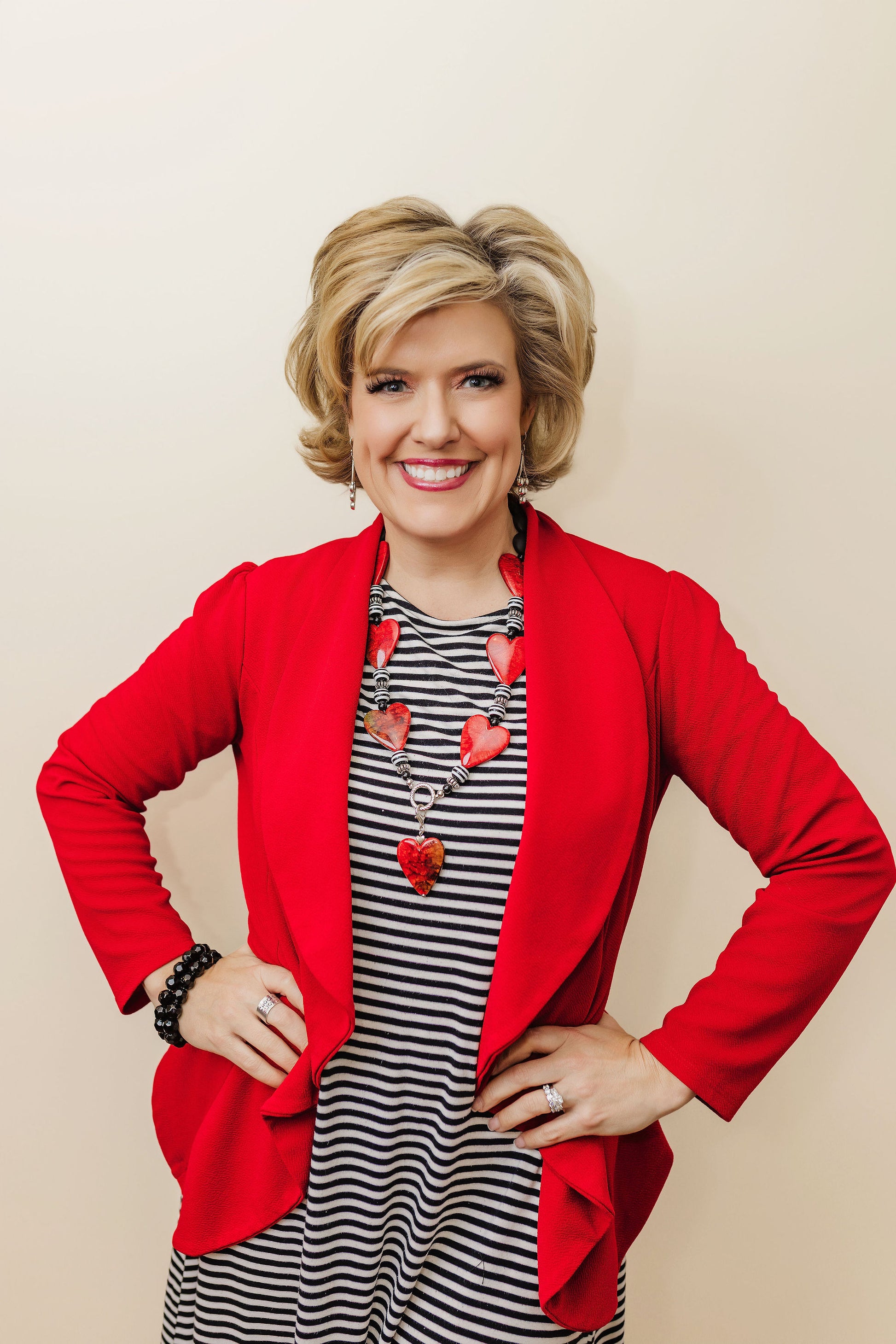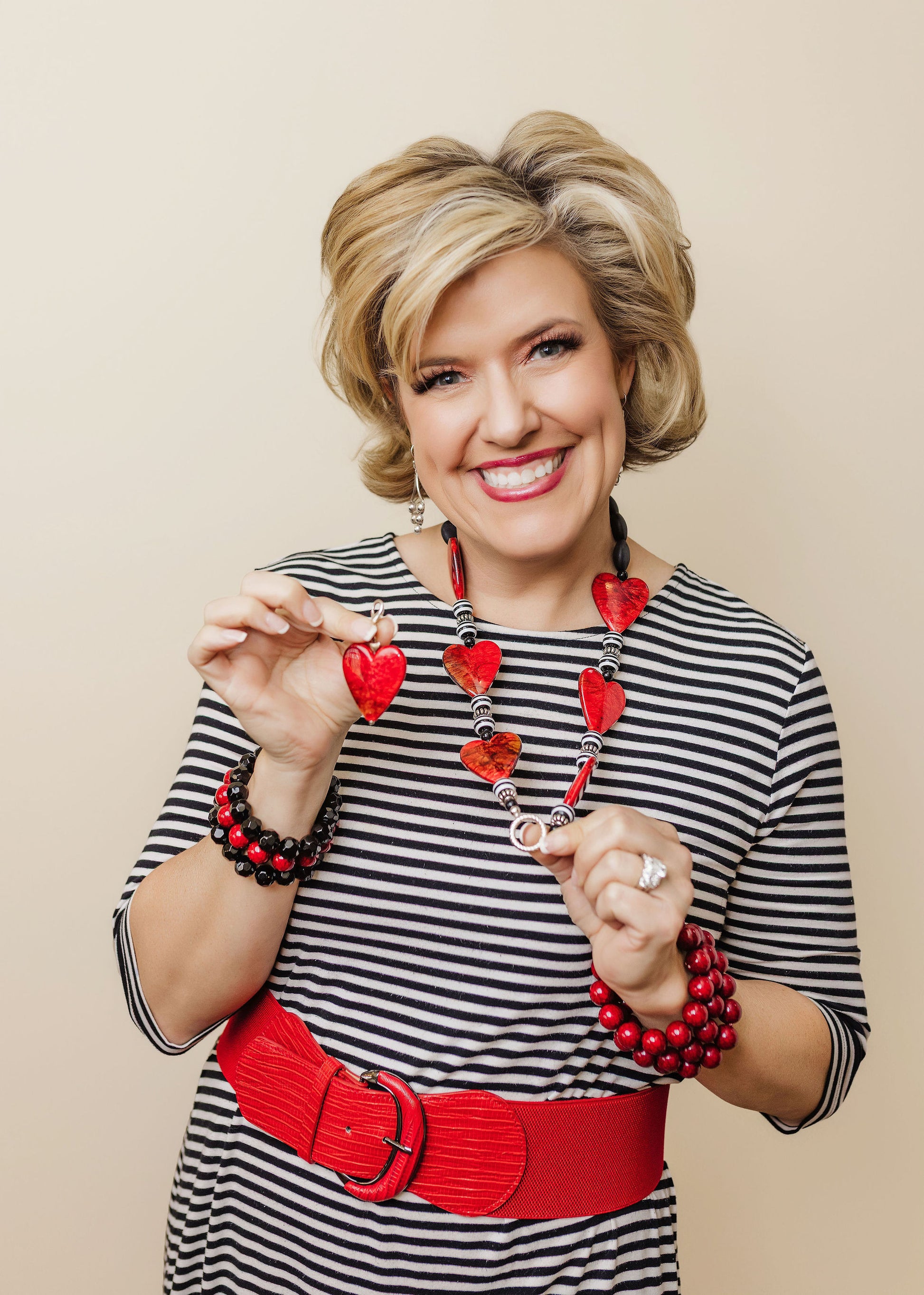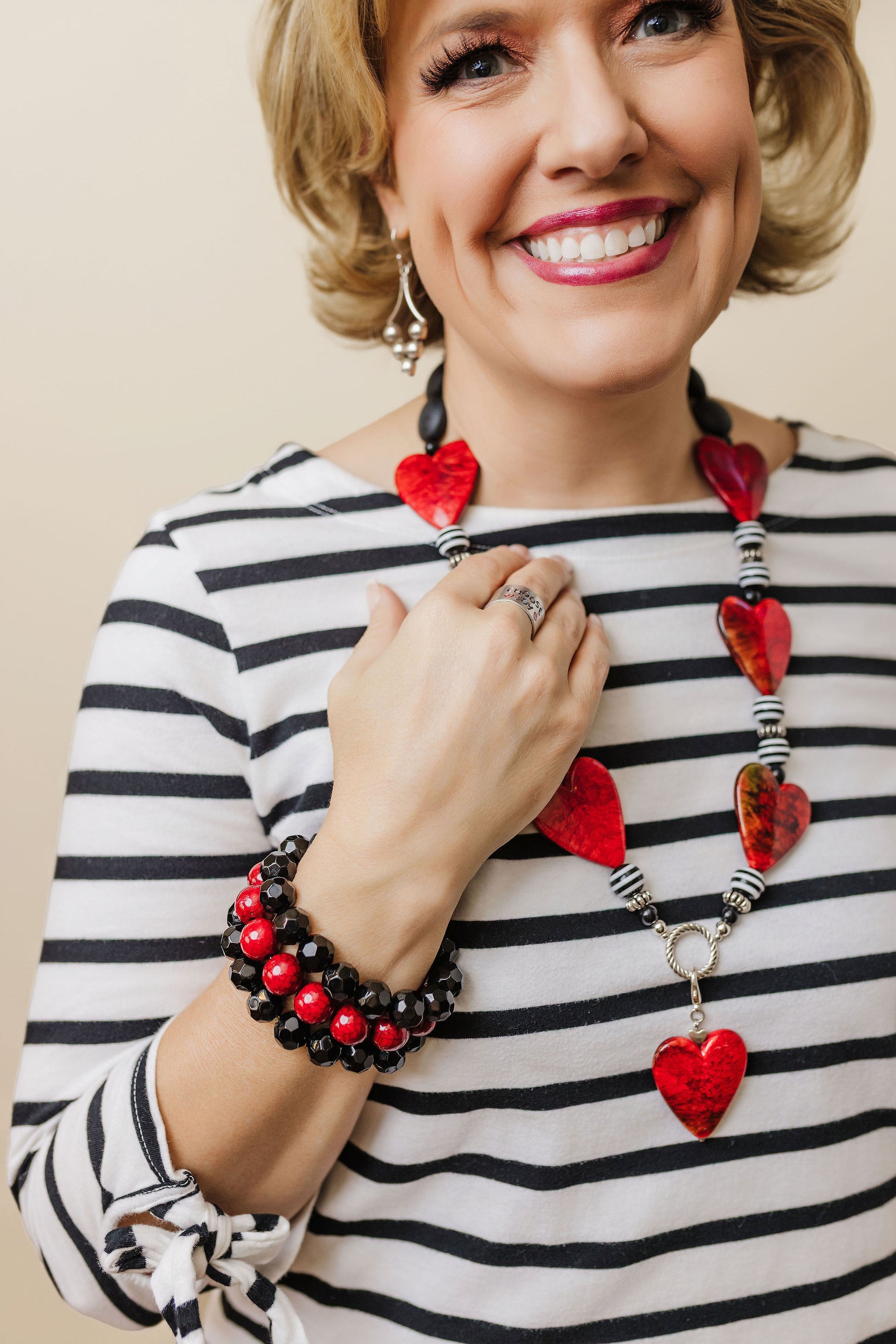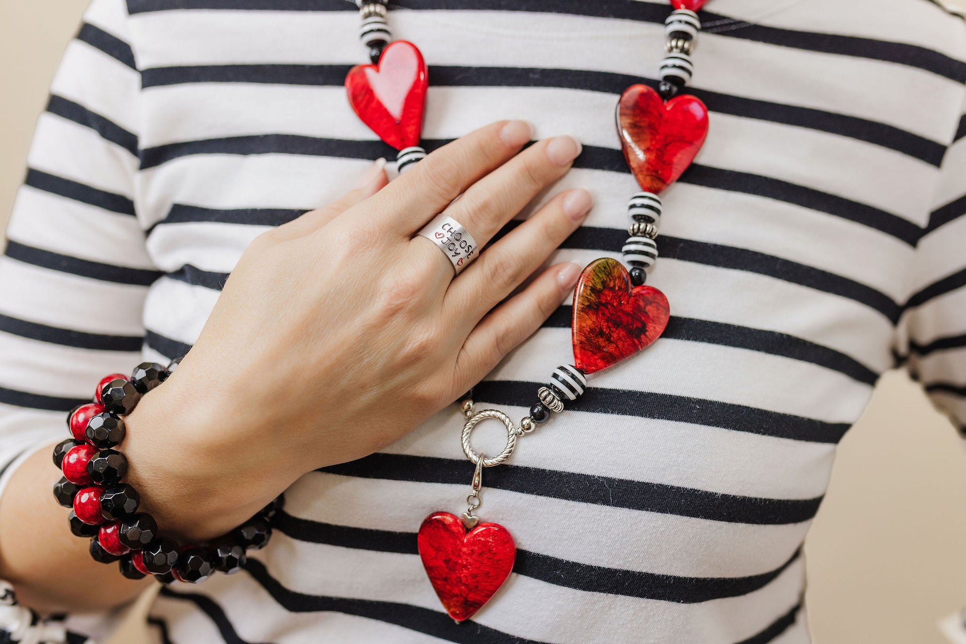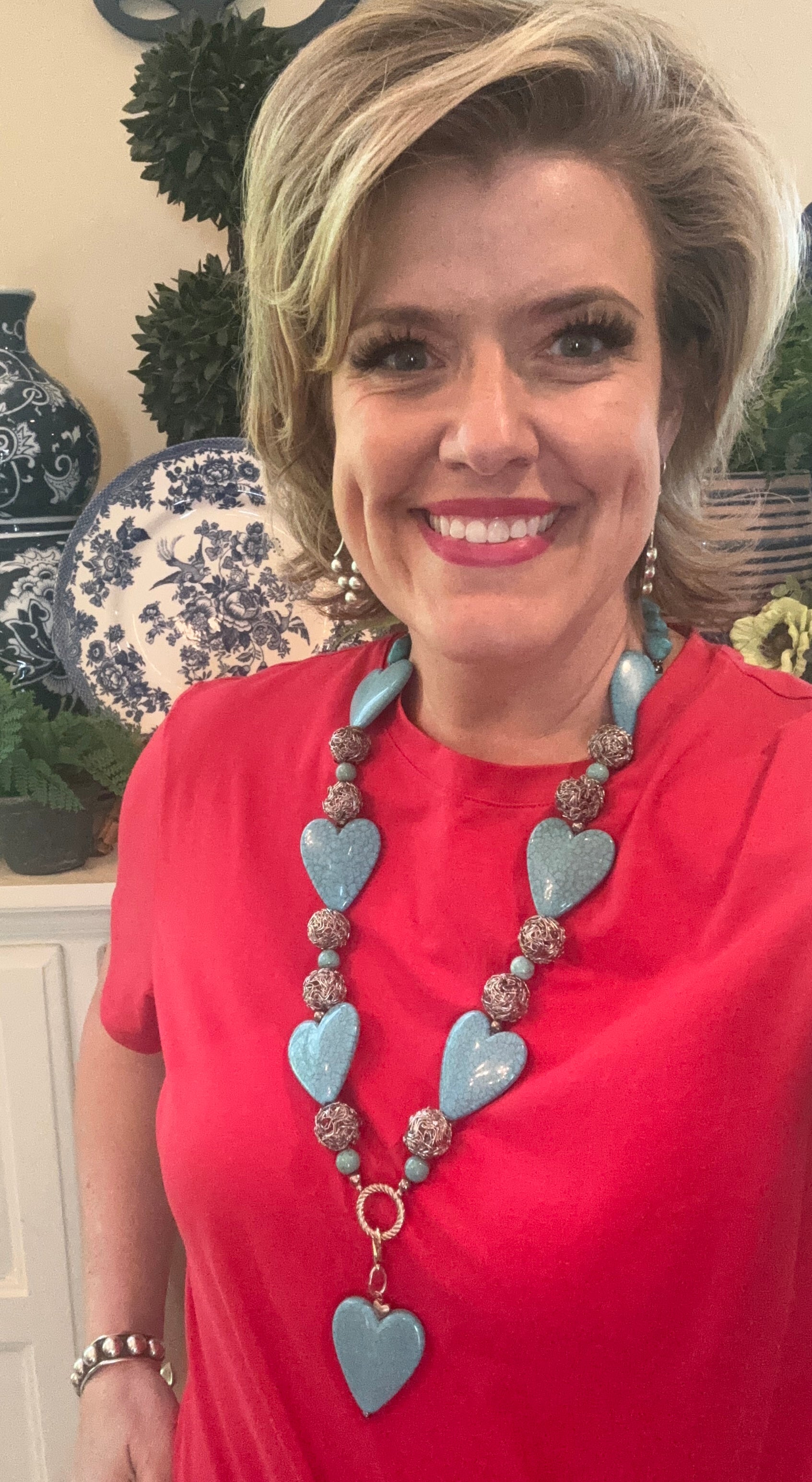 Statement necklace of hearts and beads creating a reminder of I Corinthians 13:13 “And now these three remain: faith, hope and love. But the greatest of these is love”! Fantastic necklace and even works for a lanyard chain to wear daily at work or for conference or name tag! The heart clip at the end of the lanyard can also be added to a zipper or purse pull to add an adorning look to another outfit for multiple uses!
