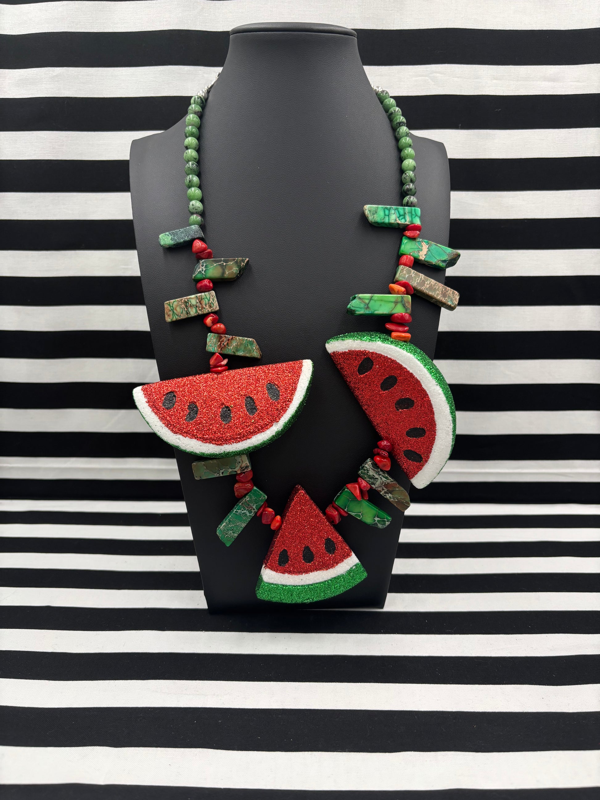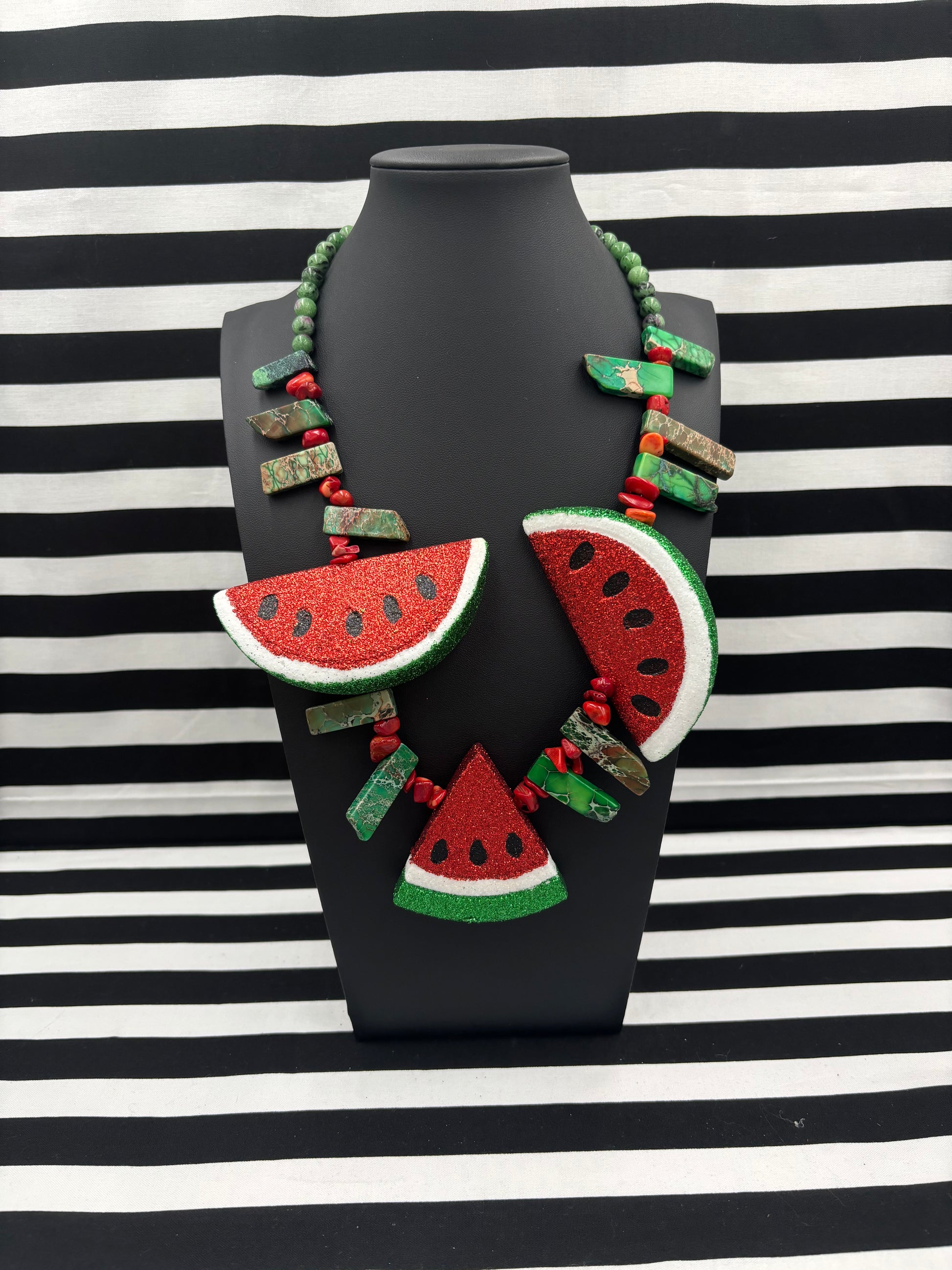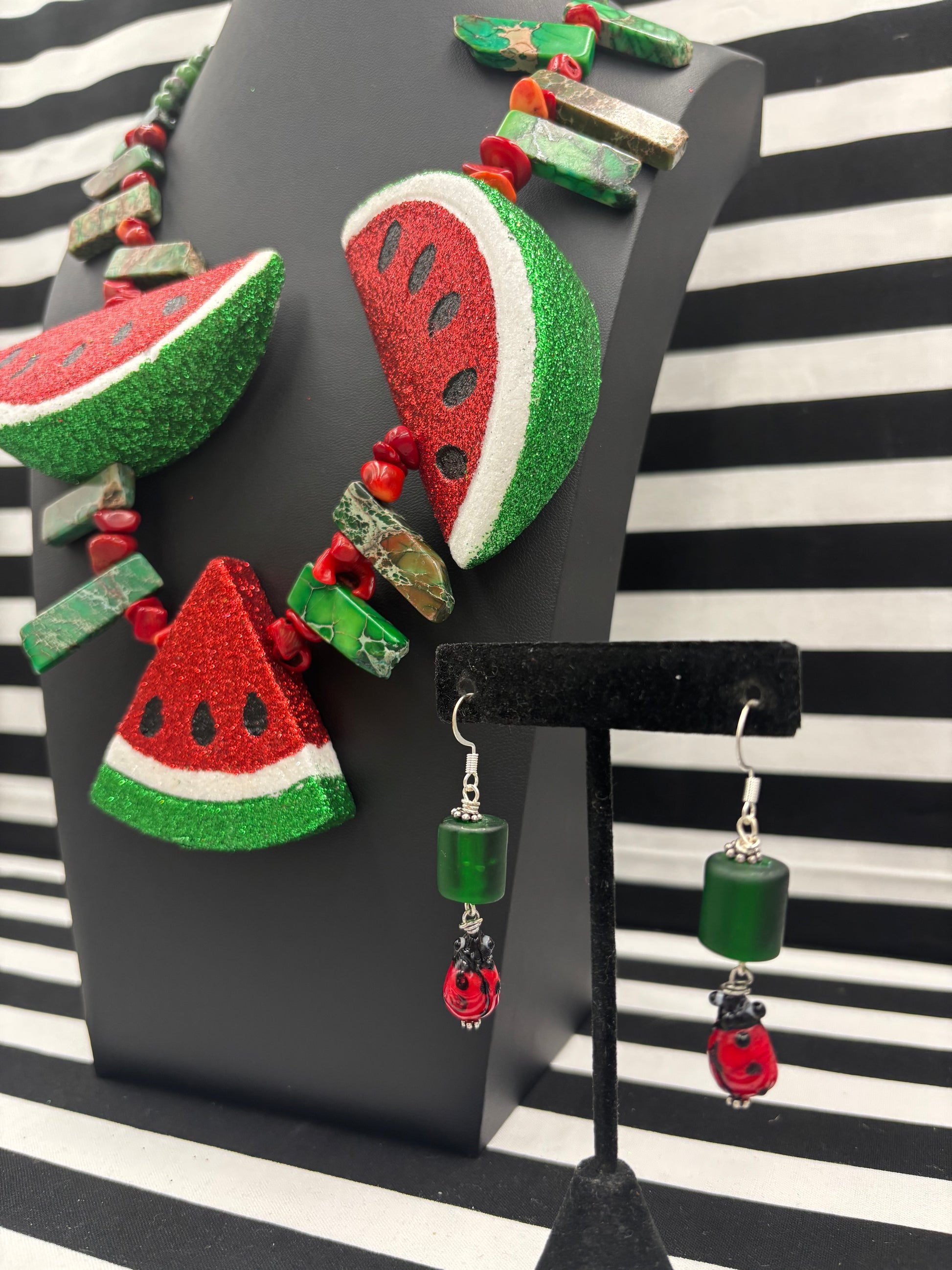 This and That Watermelon Necklace is a playful necklace that is lightweight and a conversation piece! It has an extender that allows you to wear it short or long and has complimenting earrings called Ladybug Earrings the Mushroom Earrings!