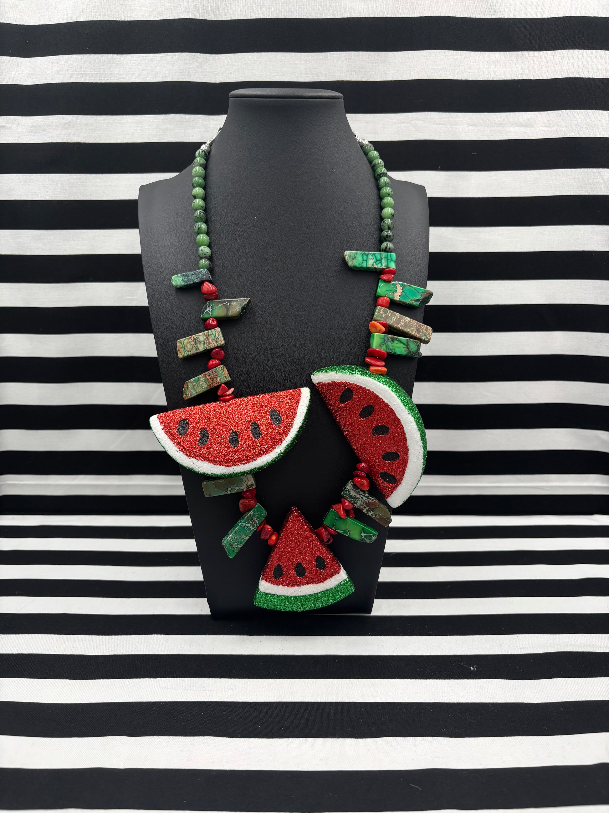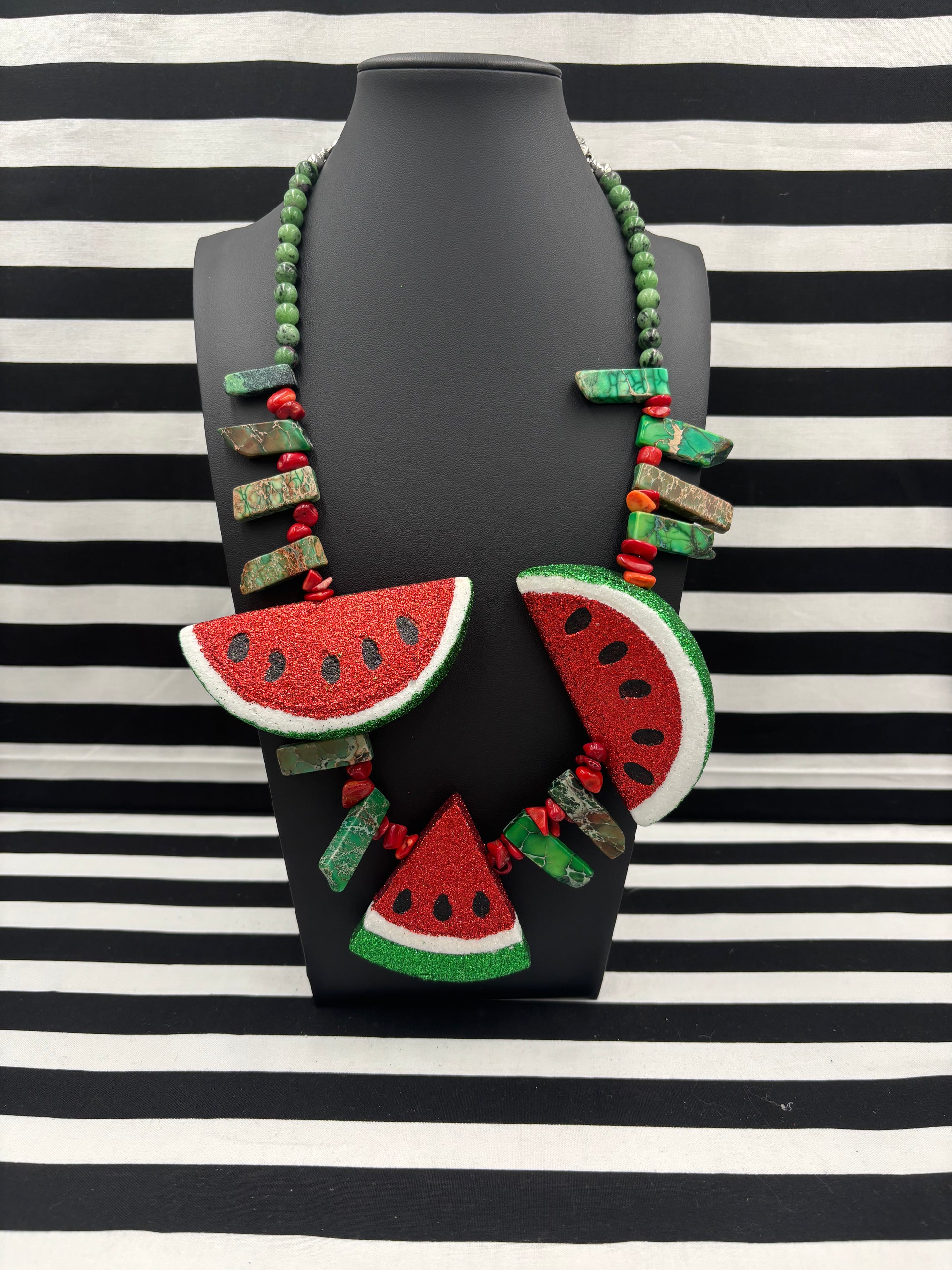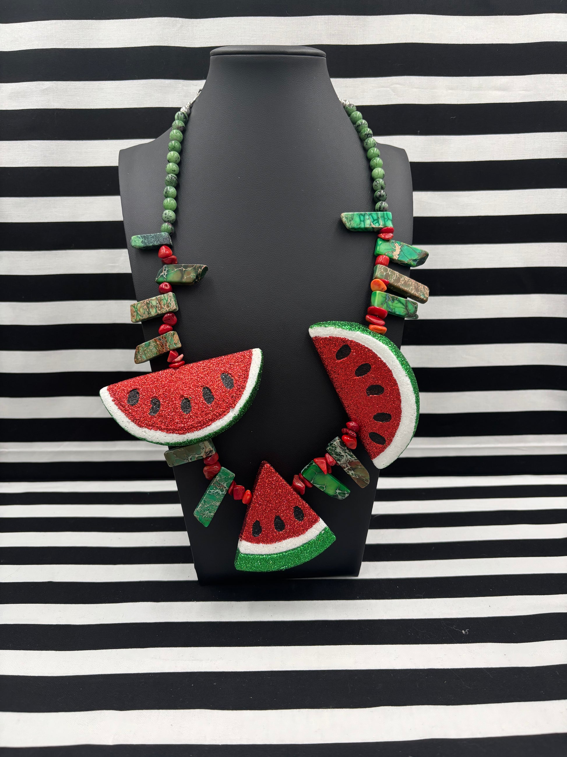This and That Watermelon Necklace is a playful necklace that is lightweight and a conversation piece! It has an extender that allows you to wear it short or long and has complimenting earrings called Ladybug Earrings the Mushroom Earrings!