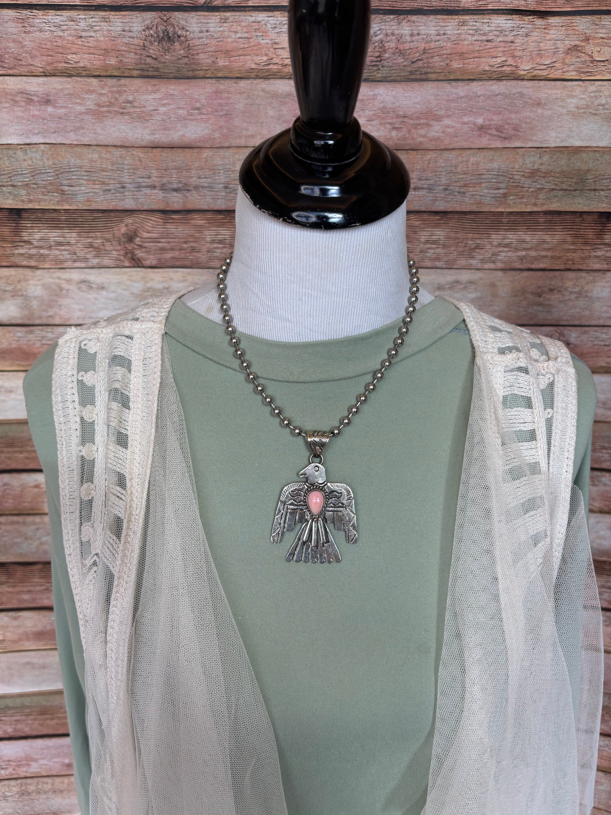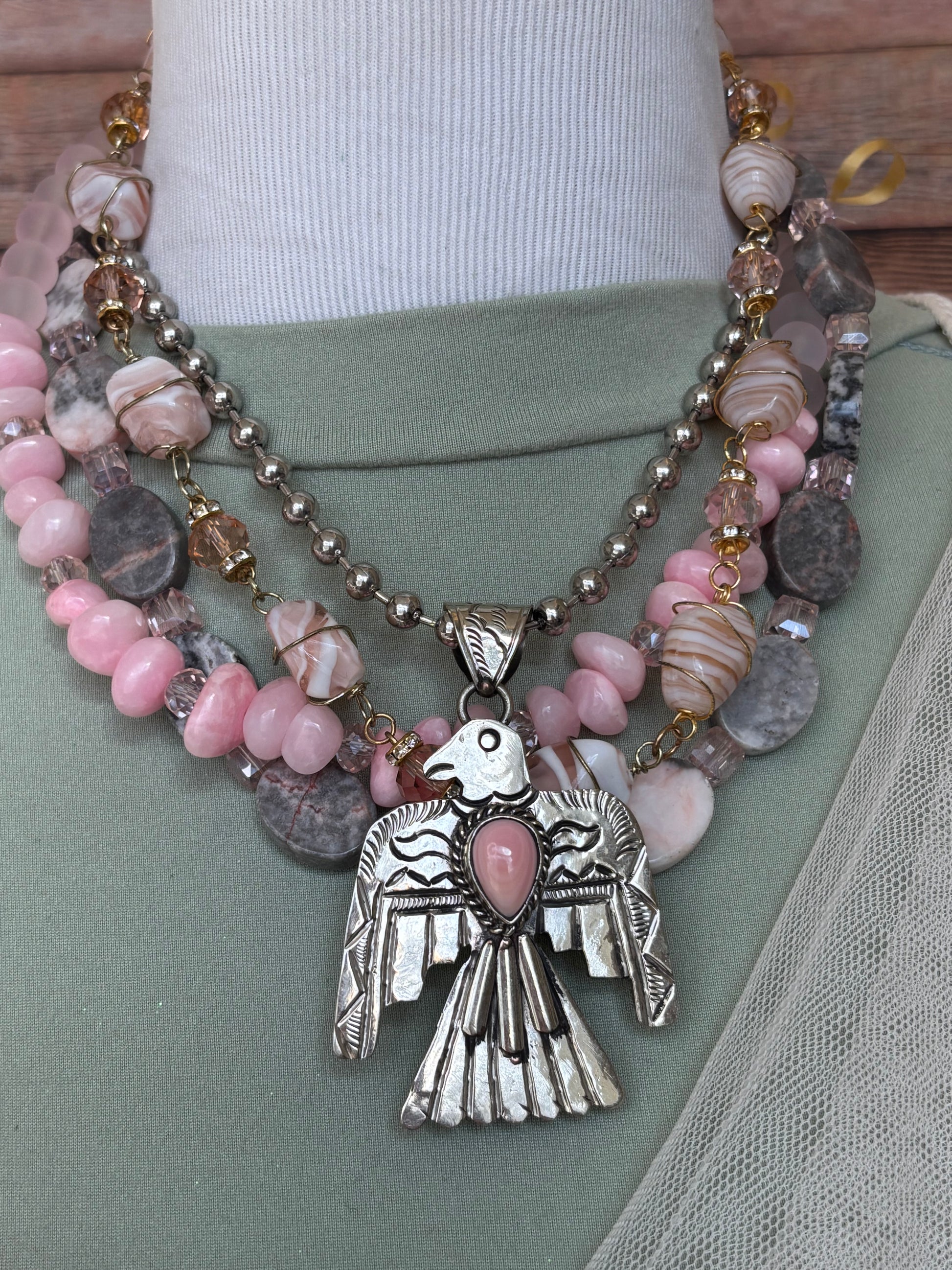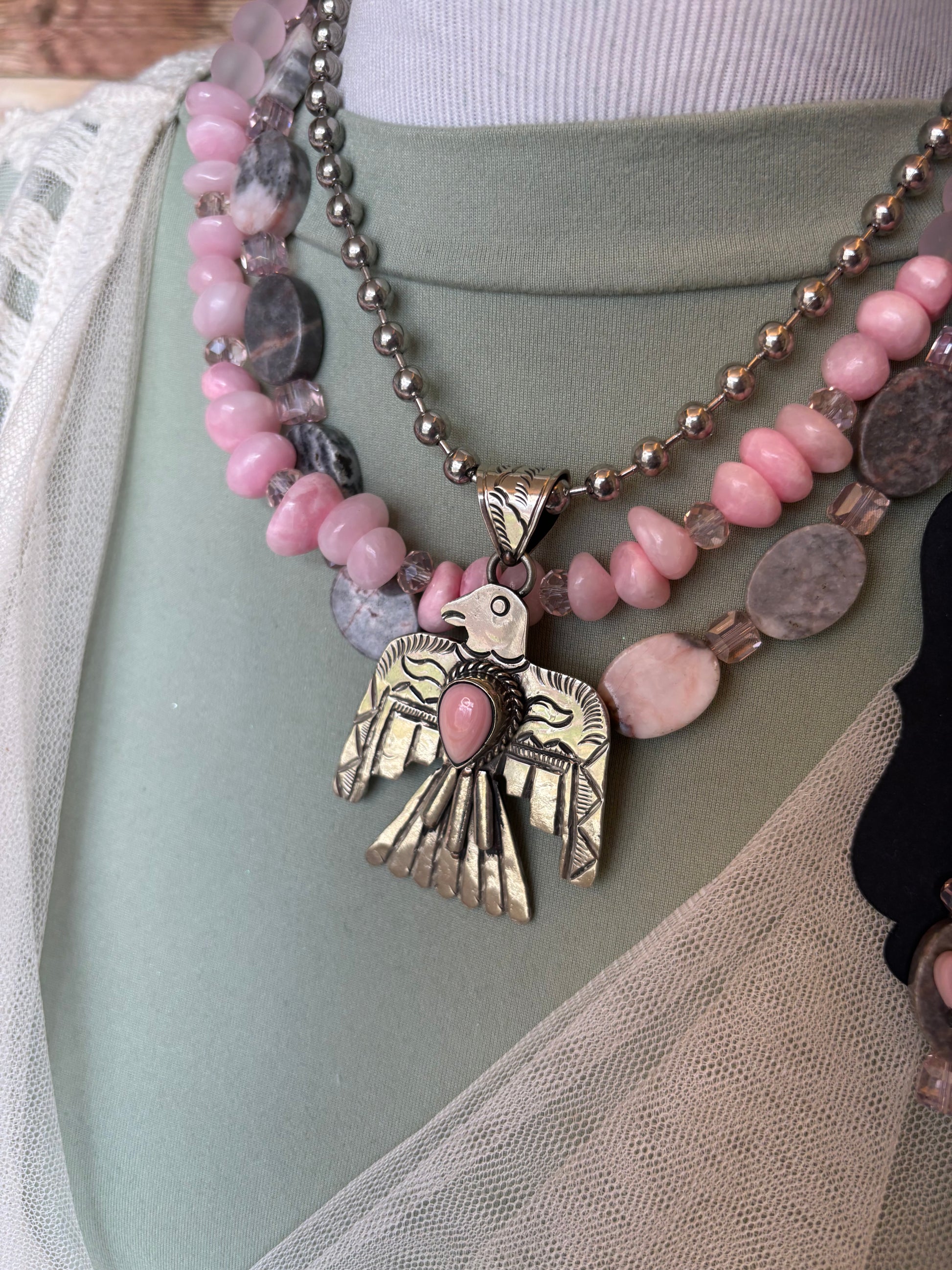 The Thunderbird Necklace looks beautiful by itself but it’s also enhanced with a variety of layering necklaces shown in pictures but part of separate listings…click on them below: