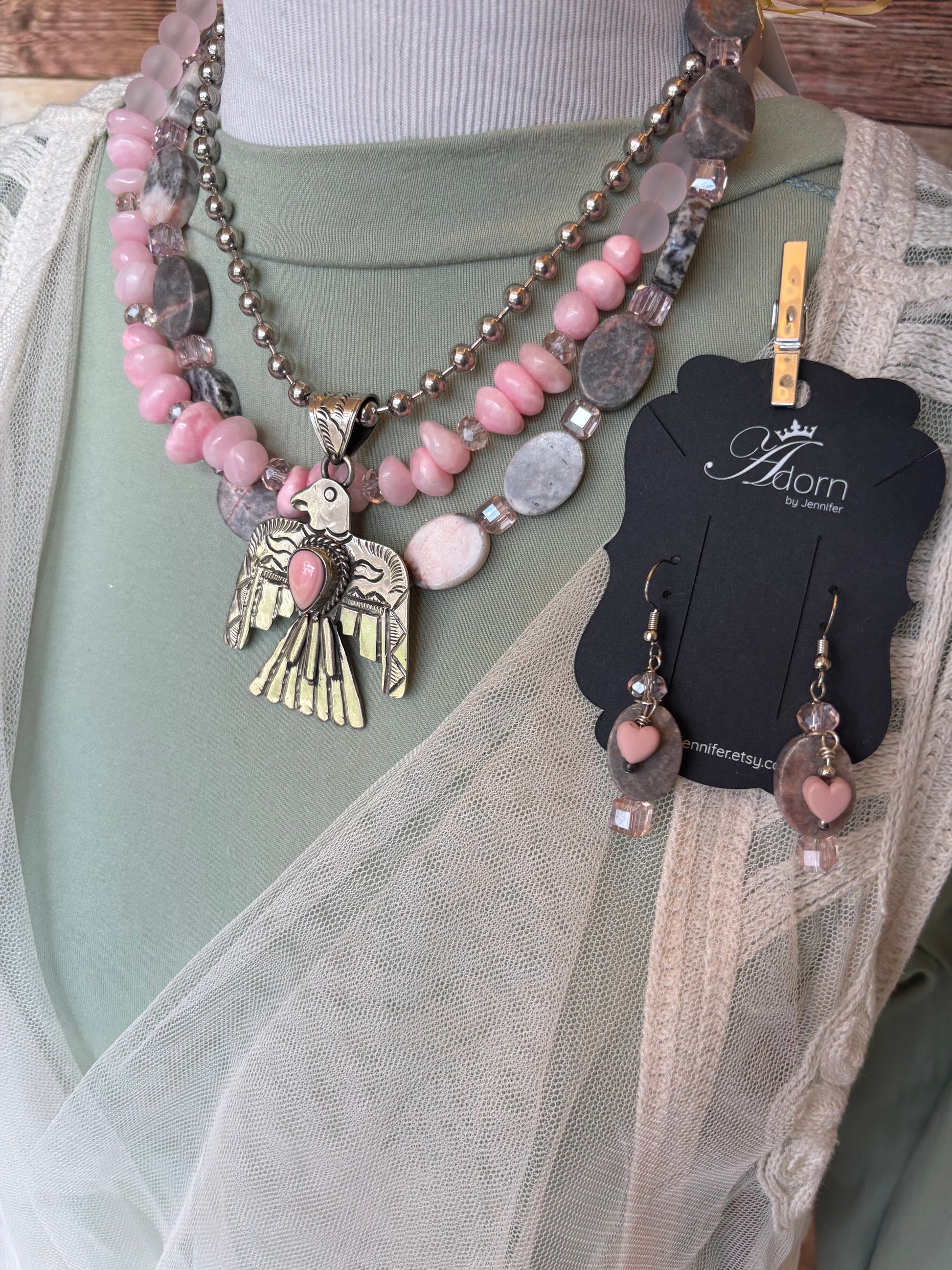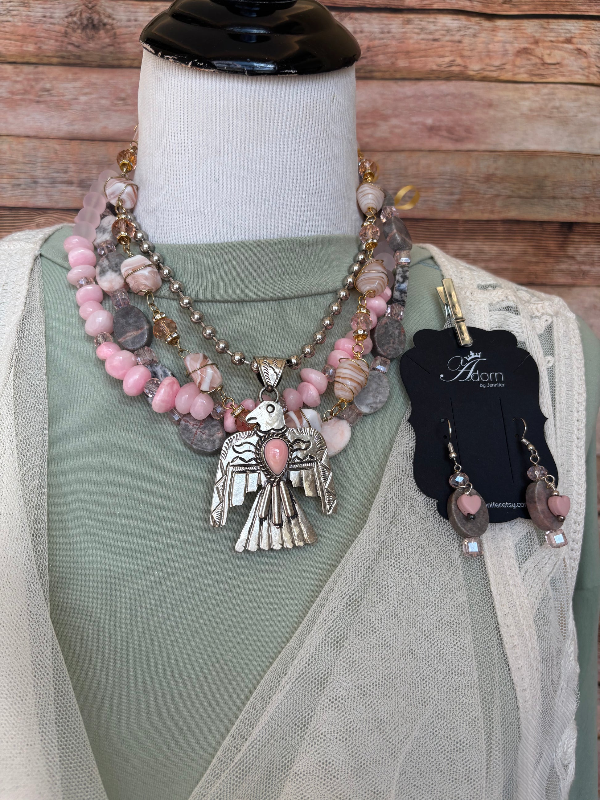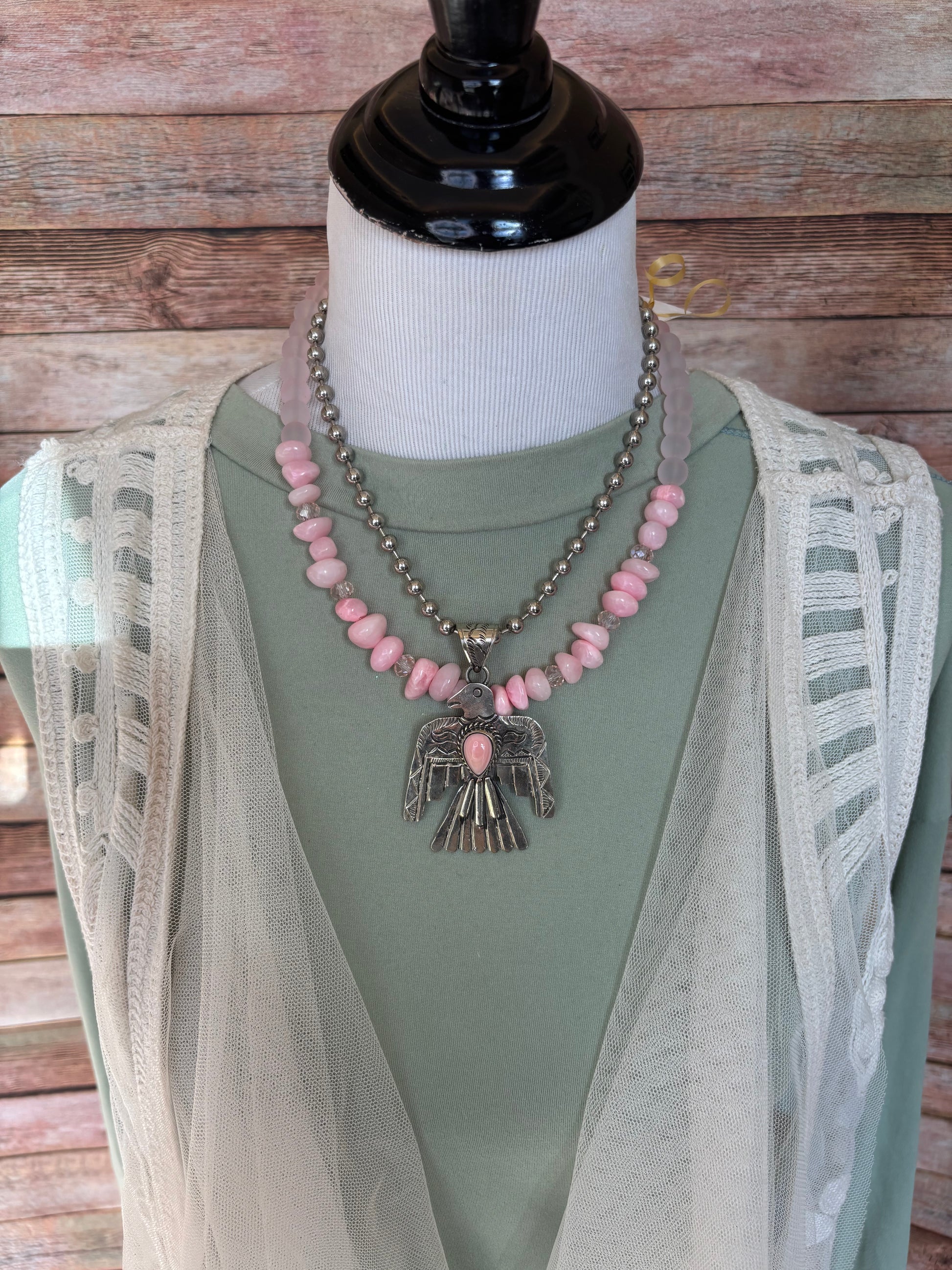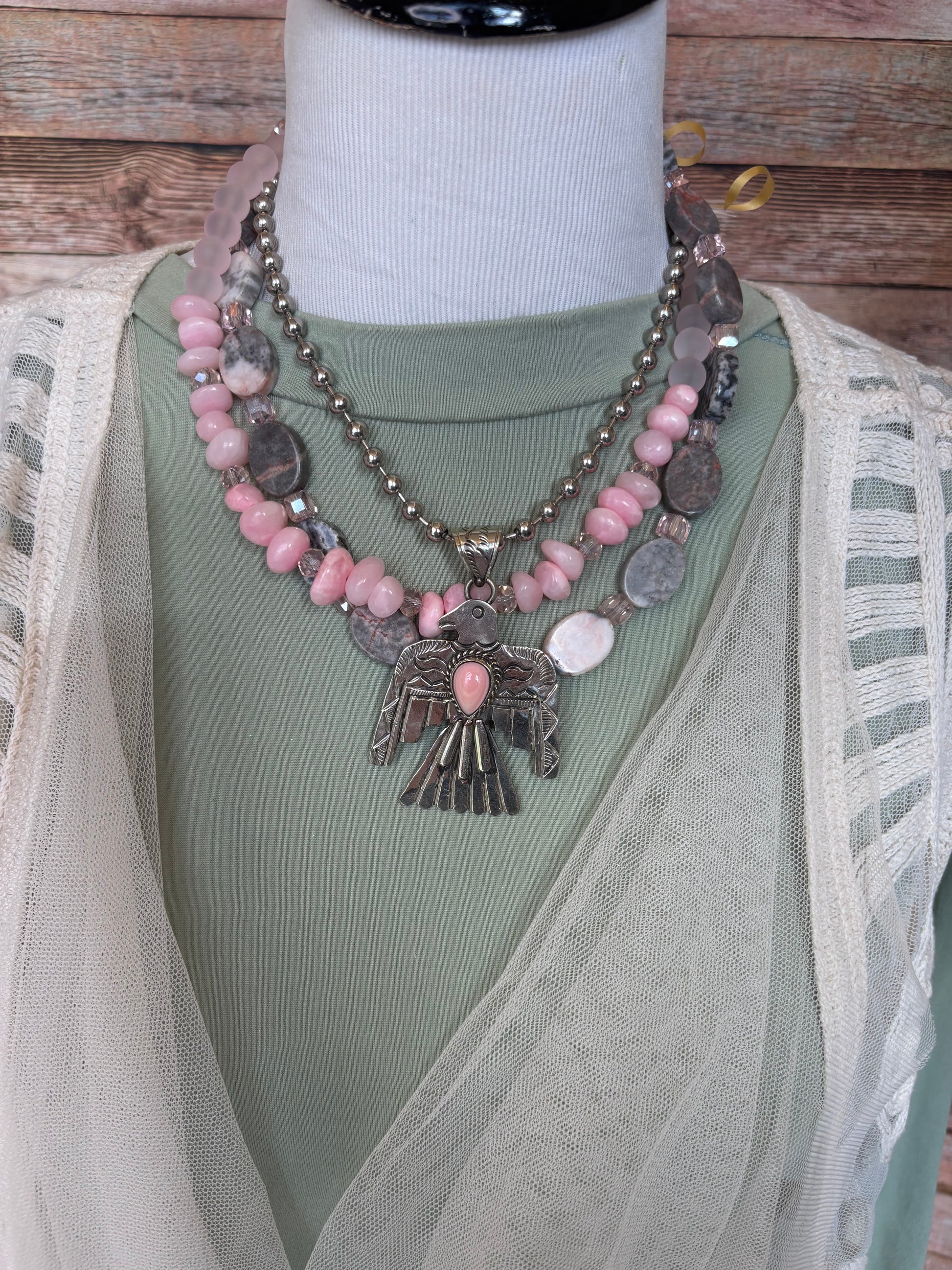 The Thunderbird Necklace looks beautiful by itself but it’s also enhanced with a variety of layering necklaces shown in pictures but part of separate listings…click on them below:
