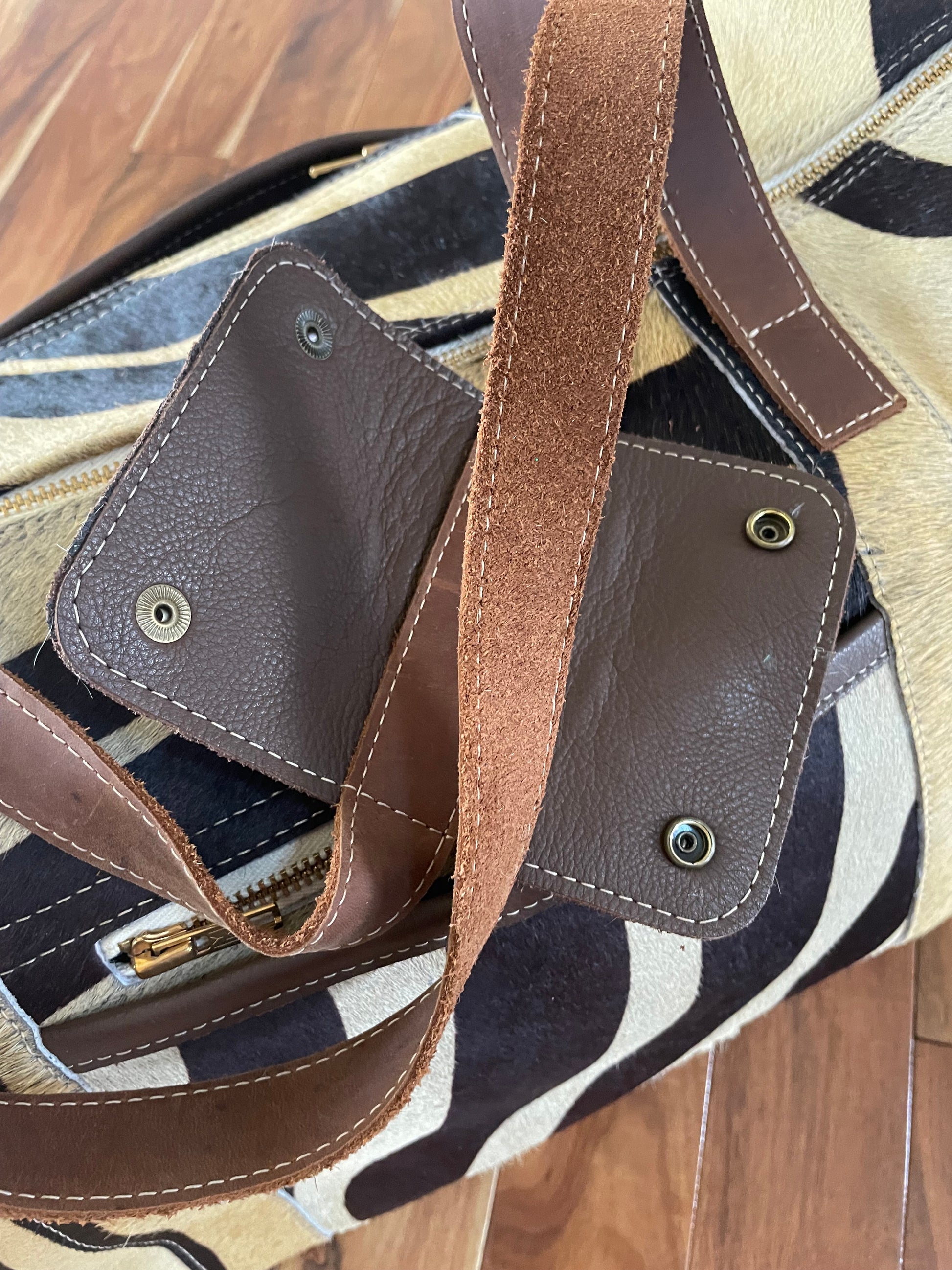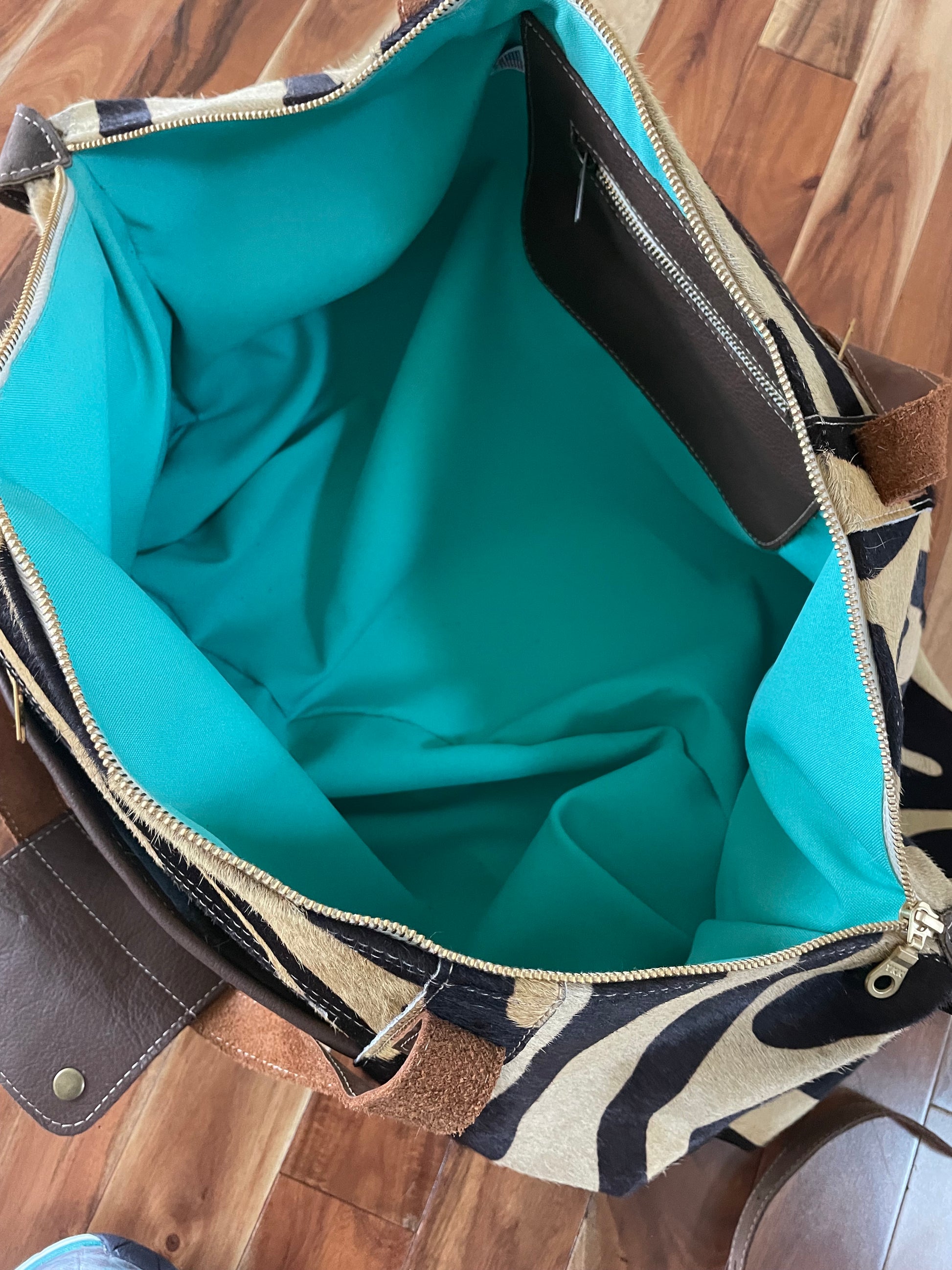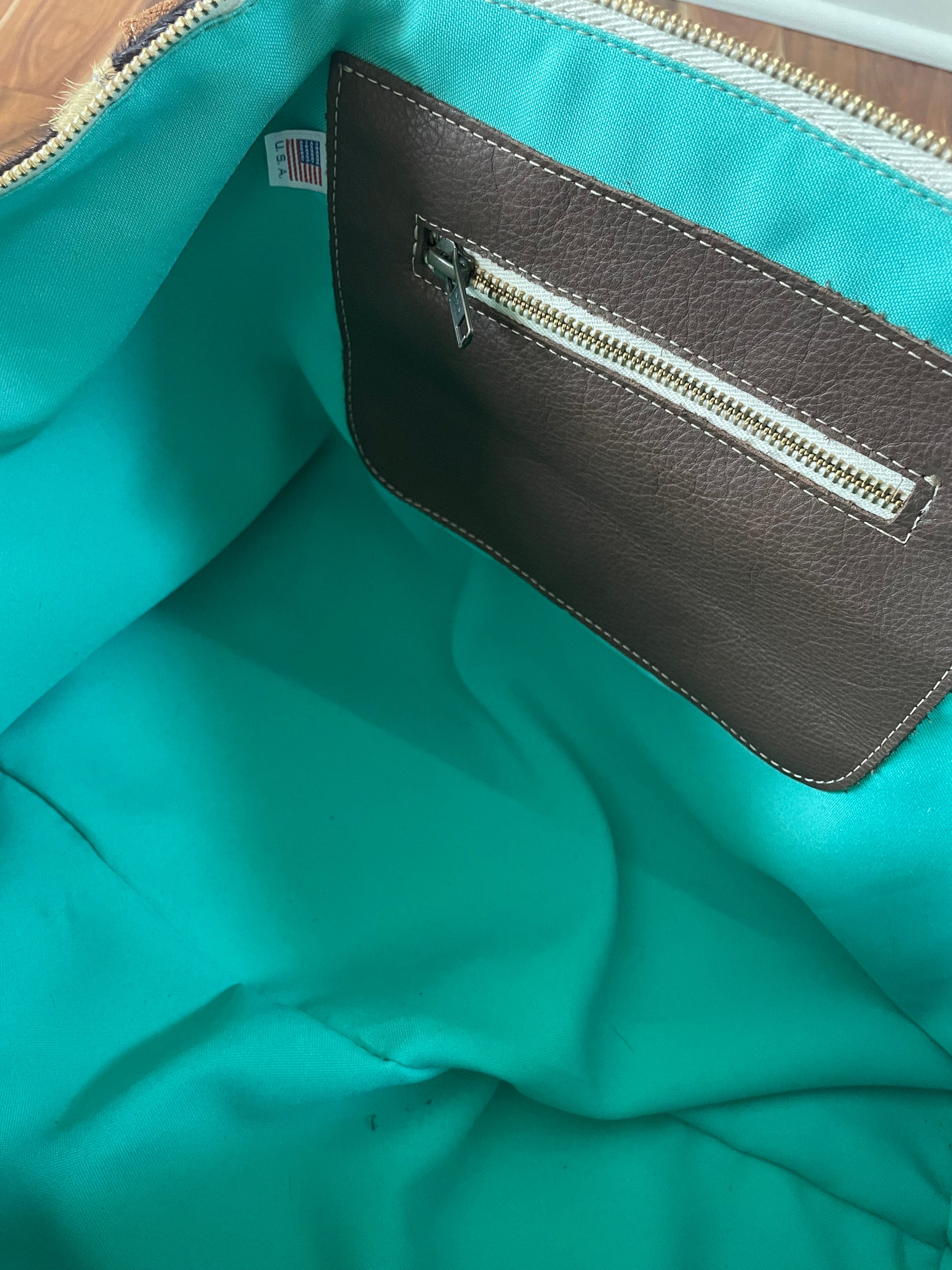 Wild One Tote smells glorious and is a show stopping statement bag! It is handmade in the USA and is made of genuine materials with a gorgeous turquoise interior lining. Detachable crossbody strap included.